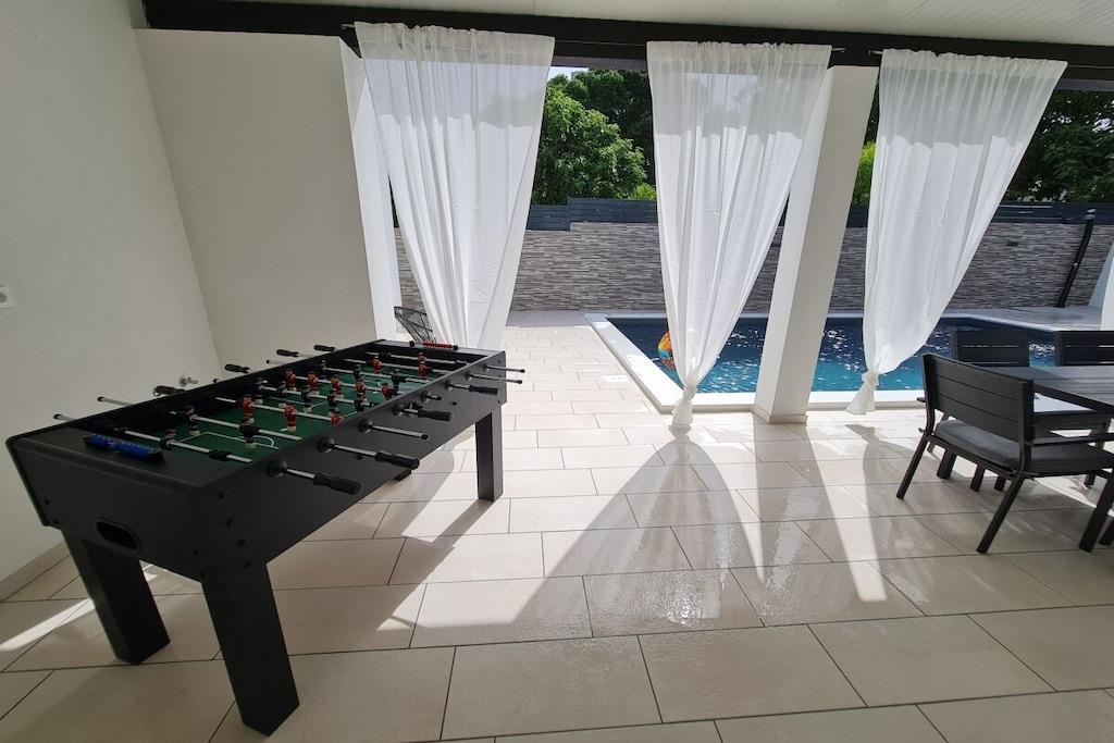 Stueetage: (Køkken(kakkelovn, komfur, ovn, opvaskemaskine , køleskab, klimaanlæg), stue / spisestue(, Fjernsyn, Fjernsyn, spisebord, klimaanlæg), soveværelse(, , king size-seng, Fjernsyn, Fjernsyn, klimaanlæg), soveværelse(, , king size-seng, Fjernsyn, Fjernsyn, klimaanlæg), badeværelse(, toilet, bruser, håndvask), badeværelse(, toilet, bruser, håndvask), guest toilet(, toilet, håndvask)) , Internetadgang, vaskemaskine, have(Grill center, Græsplæne, havemøbler, solstole, swimmingpool, Haveskur), parkering