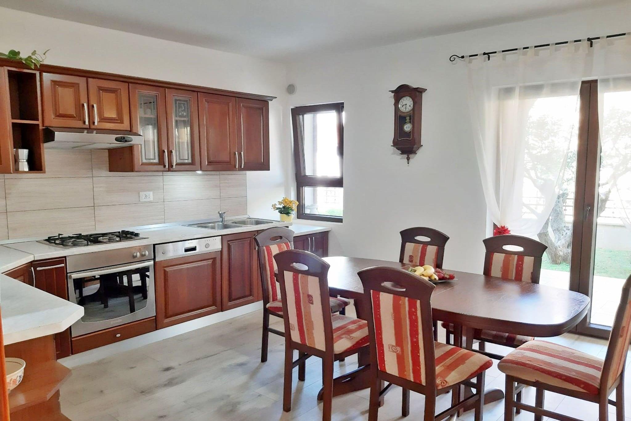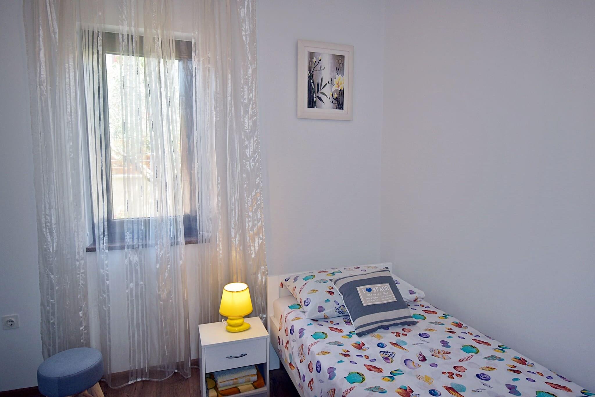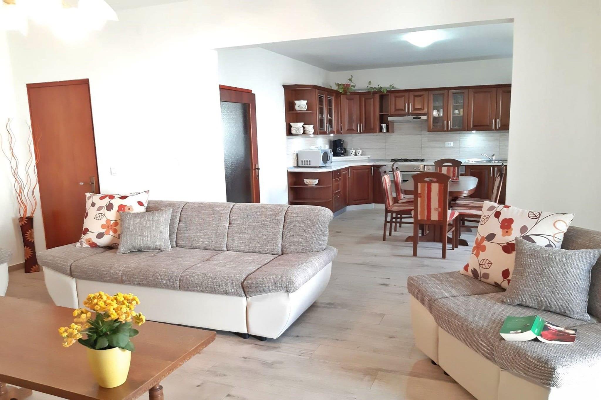 Denne rummelige og hyggelige lejlighed i Pula byder på 3 soveværelser og kan rumme op til 7 personer (maks. 5 voksne). Ejendommen dækker 110 m² og har en have med udendørsmøbler og en terrasse, ideel til at slappe af eller spise udendørs. Indvendigt er lejligheden udstyret med moderne bekvemmeligheder, herunder aircondition, Wi-Fi, en vaskemaskine og et tv med satellitkanaler (engelsksprogede muligheder tilgængelige). Yderligere bekvemmeligheder omfatter en pejs, hårtørrer og udendørs parkering i samme bygning. Beliggende i et familievenligt område, er denne lejlighed perfekt beliggende til en række aktiviteter. Det er kun få skridt fra en golfbane, hvilket gør det ideelt for golfentusiaster. Supermarkedet og busstationen ligger blot 300 meter væk, og tilbyder nem adgang til daglige fornødenheder og offentlig transport. Den berømte restaurant "Tivoli" ligger kun 500 meter fra ejendommen og byder på lækker lokal spisning. For strandelskere ligger klippestranden "Hidrobaza" kun 3 km væk, og byens centrum ligger også 3 km fra lejligheden. Lufthavnen er en bekvem 6 km afstand. Det åbne køkken er fuldt udstyret med både gas- og elektriske apparater, herunder køleskab, mikroovn, ovn, fryser og opvaskemaskine. Køkkenet har også et komplet sæt tallerkener, bestik og redskaber, hvilket sikrer, at gæsterne har alt, hvad de har brug for til at tilberede måltider. Med sin kombination af komfort, beliggenhed og faciliteter giver denne lejlighed en ideel base for familier eller små grupper, der udforsker Pula.