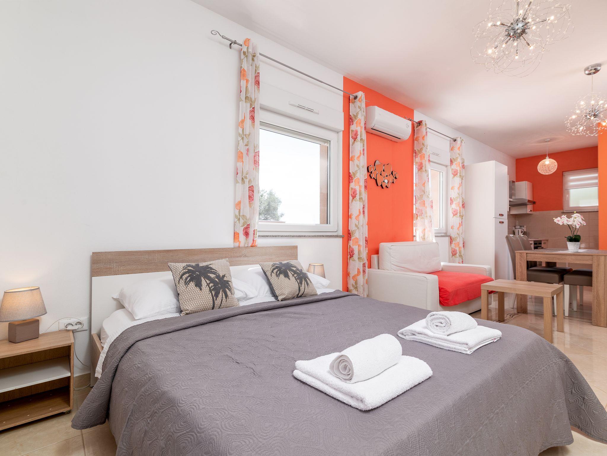 Studio bietet Platz für 3 Gäste. Die Betten sind in Schlafzimmern, die es 1 gibt, und in Wohnzimmer, innerhalb einer Gesamtfläche von 26m2, angeordnet. Die Gäste haben eine eigene Terrasse zur Verfügung, auf der sie in warmen Sommernächten genießen können. Es ist erlaubt, Speisen auf dem Gemeinschafts-Grill vorzubereiten. IM PREIS INBEGRIFFEN: Kurtaxe, Endreinigung, Klimatisierung, Parkplatz, Internet, Kinderbett, Bügeleisen, Bügelbrett, Föhn, tragbarer Grill. Die Verfügbarkeit zusätzlicher Dienstleistungen in Ihrem reservierten Termin und die Preise derselben (falls nicht aufgeführt) müssen im Voraus überprüft werden. Zusätzliche Dienstleistungen die in der Zahlungsaufforderung nicht aufgeführt sind werden direkt beim Vermieter bezahlt, angenommen der Gast nutzt auch diese.