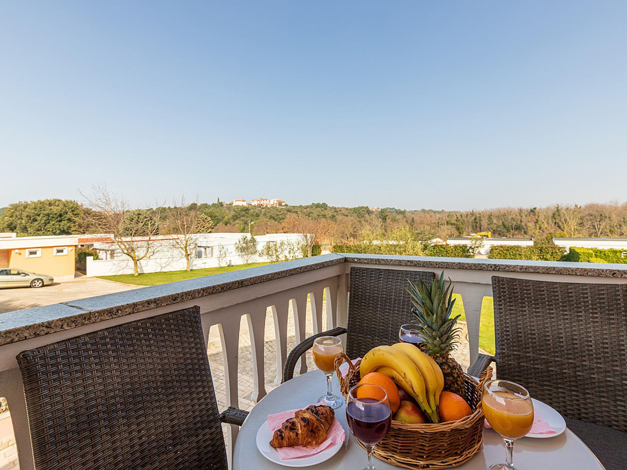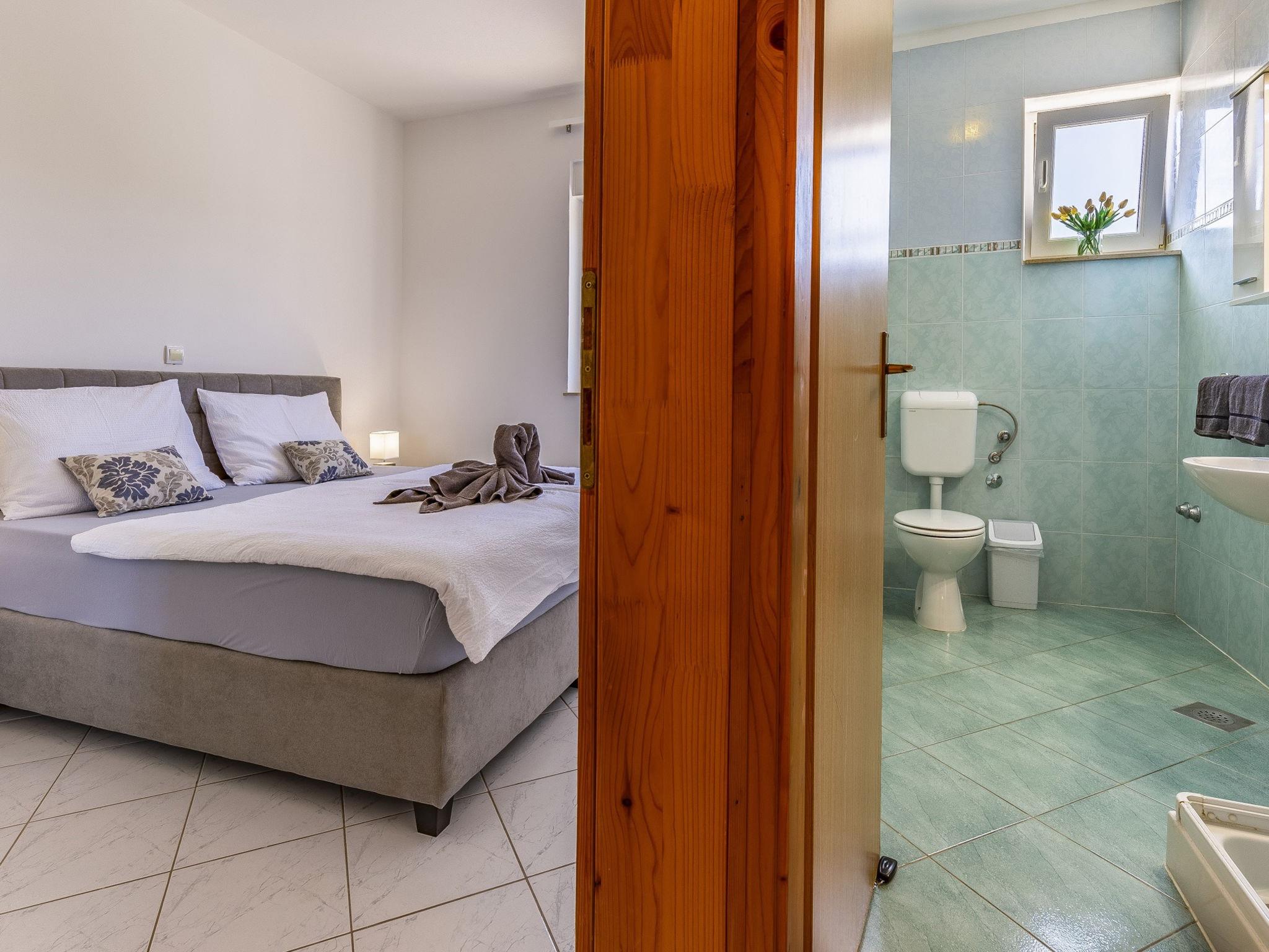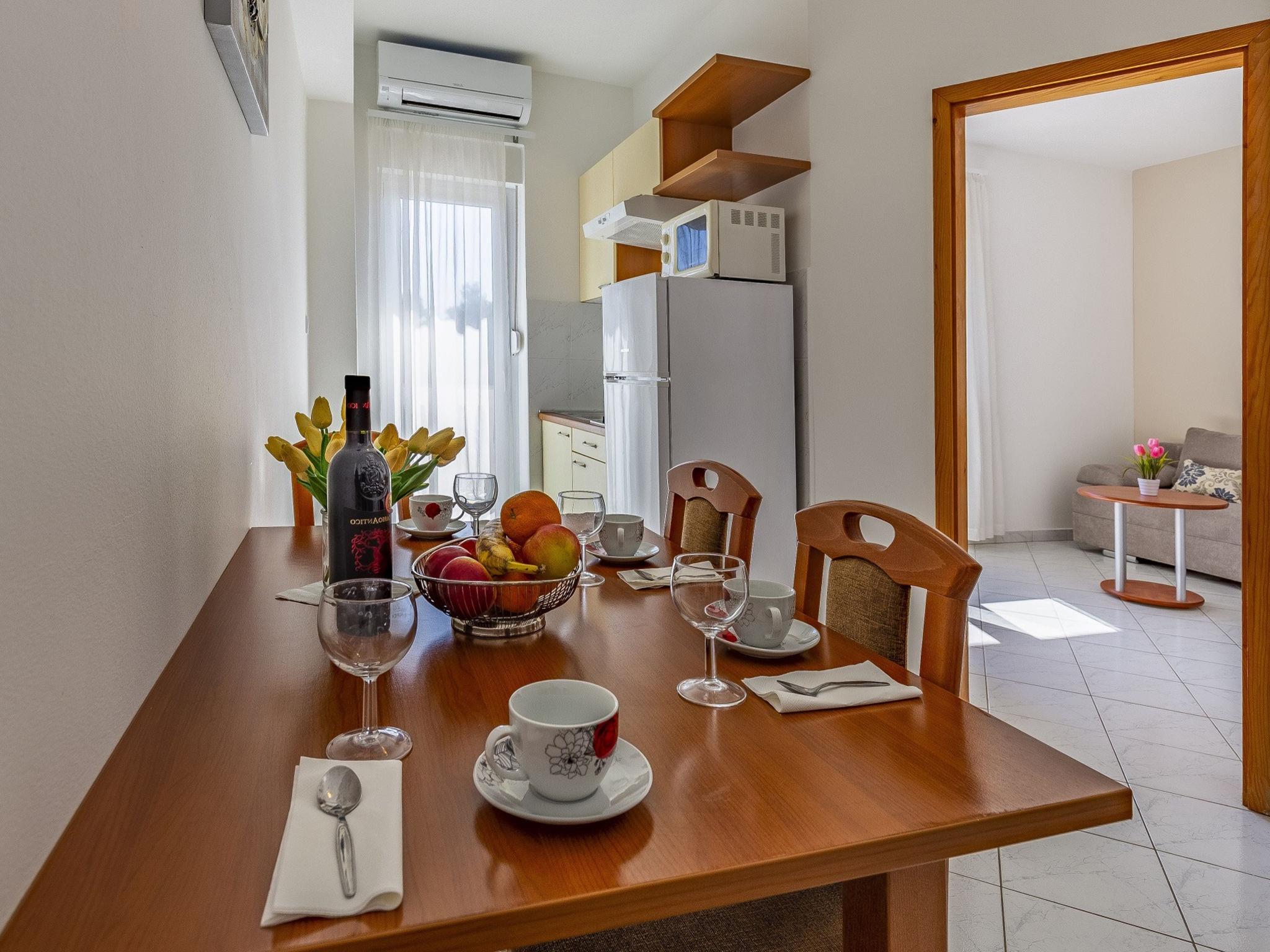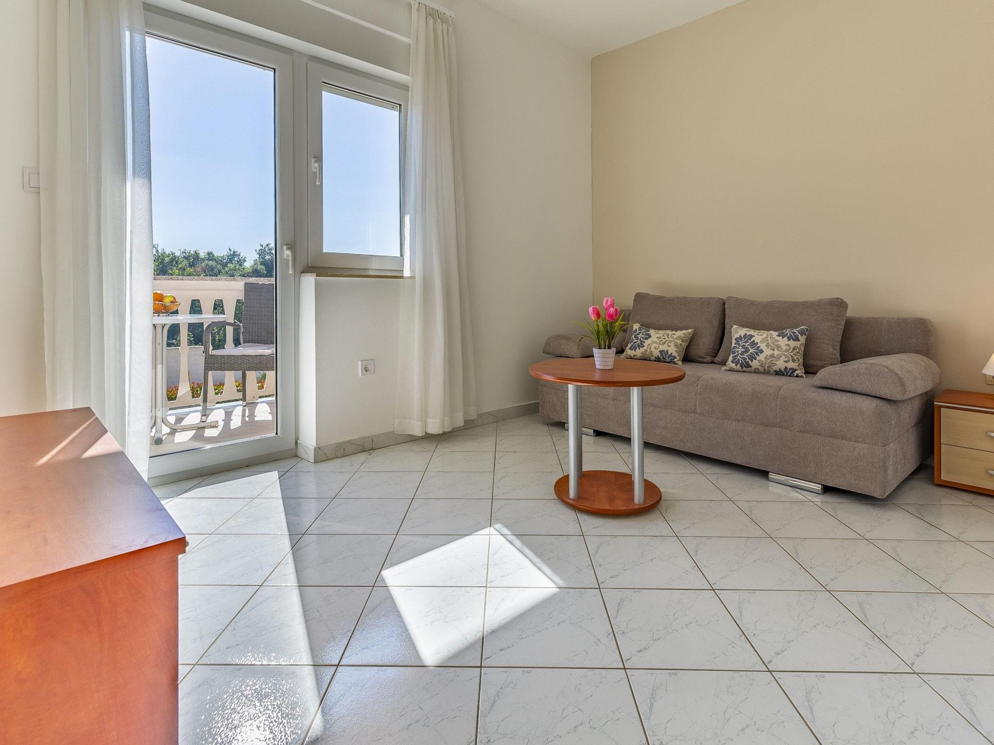 "Apartment Rok 7", 2-room apartment 40 m2 on 1st floor. Living room with 1 double sofabed (150 cm, length 200 cm), satellite TV. Exit to the terrace. 1 room with 1 french bed (180 cm, length 200 cm), air conditioning. Exit to the terrace. Dining room. Open kitchen (2 hot plates, dishwasher, kettle, microwave, freezer, electric coffee machine). Shower/WC. Air-conditioning (extra). Terrace 10 m2, roofed. Terrace furniture. View of the swimming pool and the garden. Facilities: Internet (WiFi, free).