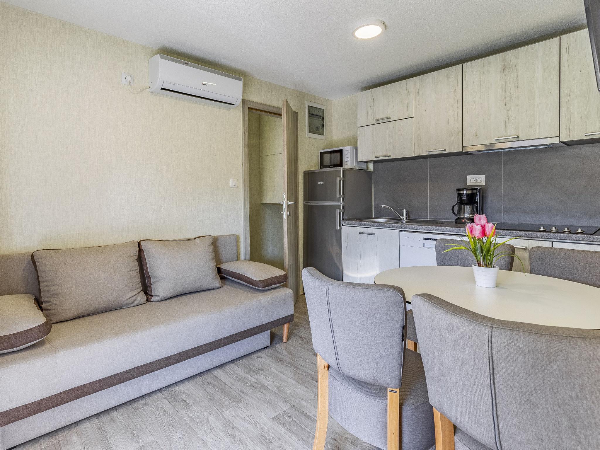 "Mobile home Luxury Premium", 3-room mobile home 36 m2. Living/dining room with 1 double sofabed (160 cm, length 200 cm), satellite TV (flat screen), air conditioning. Exit to the terrace. 1 room with 1 french bed (160 cm, length 200 cm), shower/WC. 1 room with 2 beds (90 cm, length 200 cm). Open kitchen (dishwasher, 4 ceramic glass hob hotplates, microwave, freezer, electric coffee machine). Shower/WC. Terrace 15 m2, roofed. Terrace furniture. Facilities: Internet (WiFi, free). Maximum 1 pet/ dog allowed.