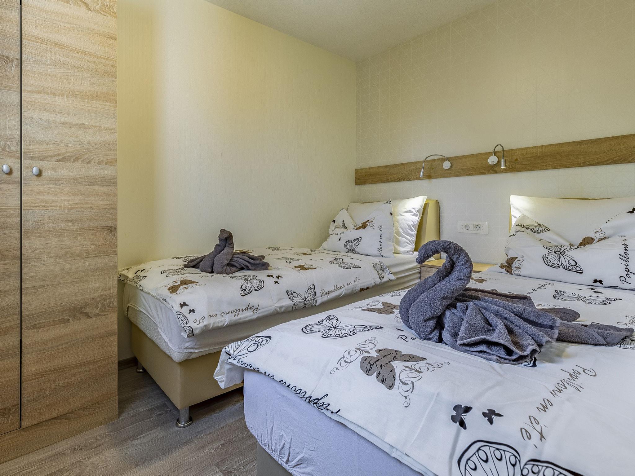 "Mobile home Superior", 3-room mobile home 40 m2. Living/dining room with 1 double sofabed (160 cm, length 200 cm), satellite TV (flat screen), air conditioning. Exit to the terrace. 1 room with 1 french bed (160 cm, length 200 cm), shower/WC. 1 room with 2 beds (90 cm, length 200 cm). Open kitchen (dishwasher, 4 ceramic glass hob hotplates, microwave, freezer, electric coffee machine). Shower/WC. Terrace 15 m2, roofed. Terrace furniture. Facilities: Internet (WiFi, free). Maximum 1 pet/ dog allowed.