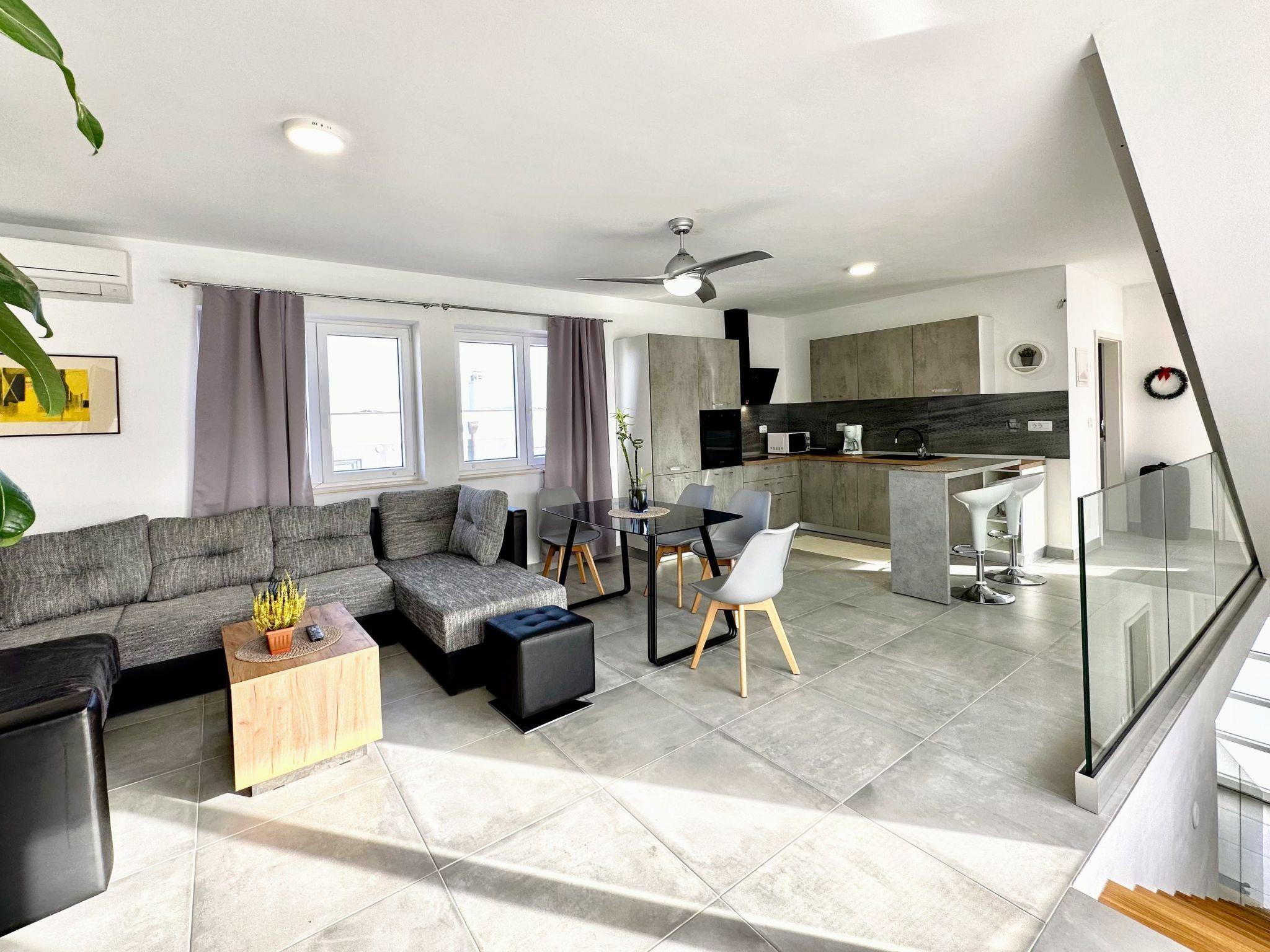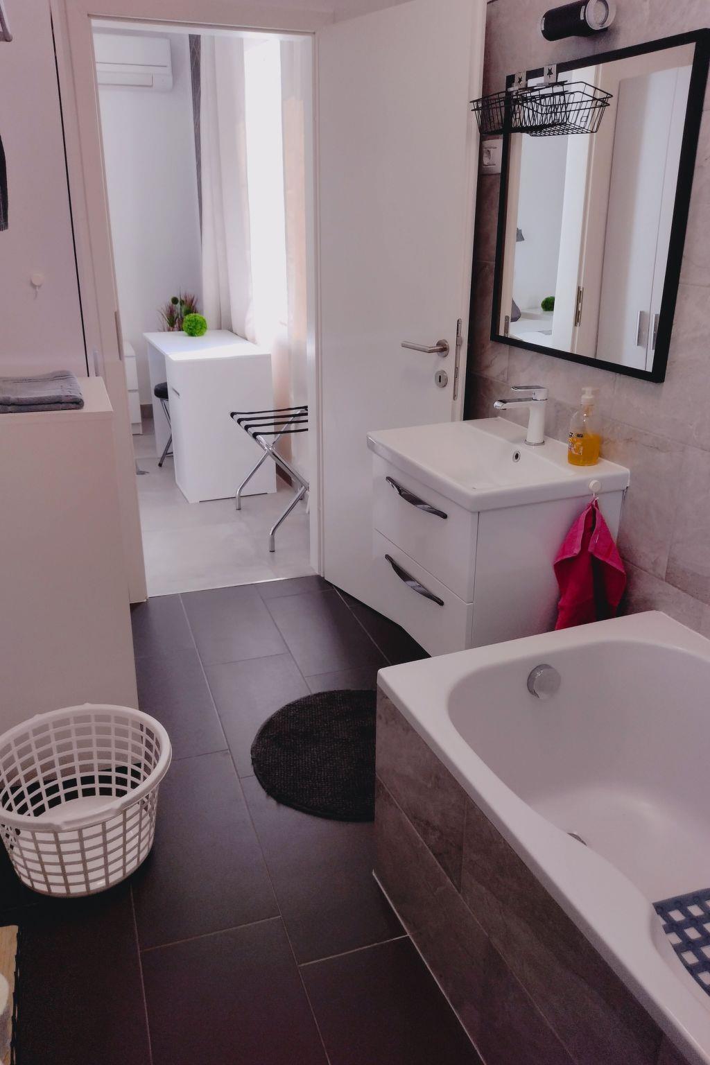 The interior of the duplex is distributed over three levels offering space and privacy. On the ground floor, two large bedrooms await you: one with a double bed and the other with two single beds, each with a private bathroom equipped with shower and bidet. Going upstairs, you will find the third bedroom with a double bed and a private bathroom complete with a large bathtub. Completing this floor is a modern open-plan kitchen with a large TV, as well as a small service bathroom with laundry facilities.