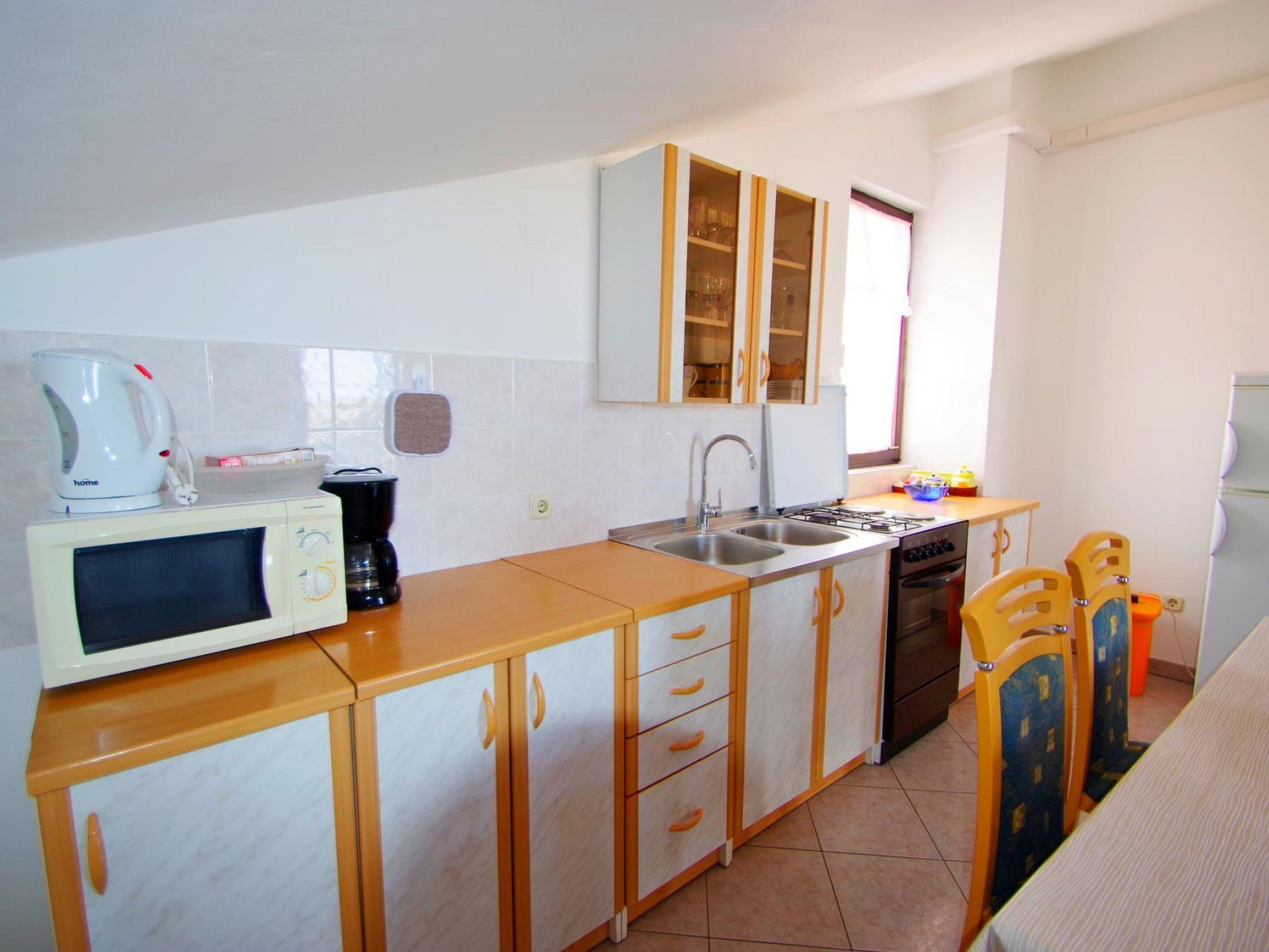 -Kitchen equipment: gas + electric stove (2+2 rings), oven, coffee machine, refrigerator with freezing compartment, microwave, cooking utensils