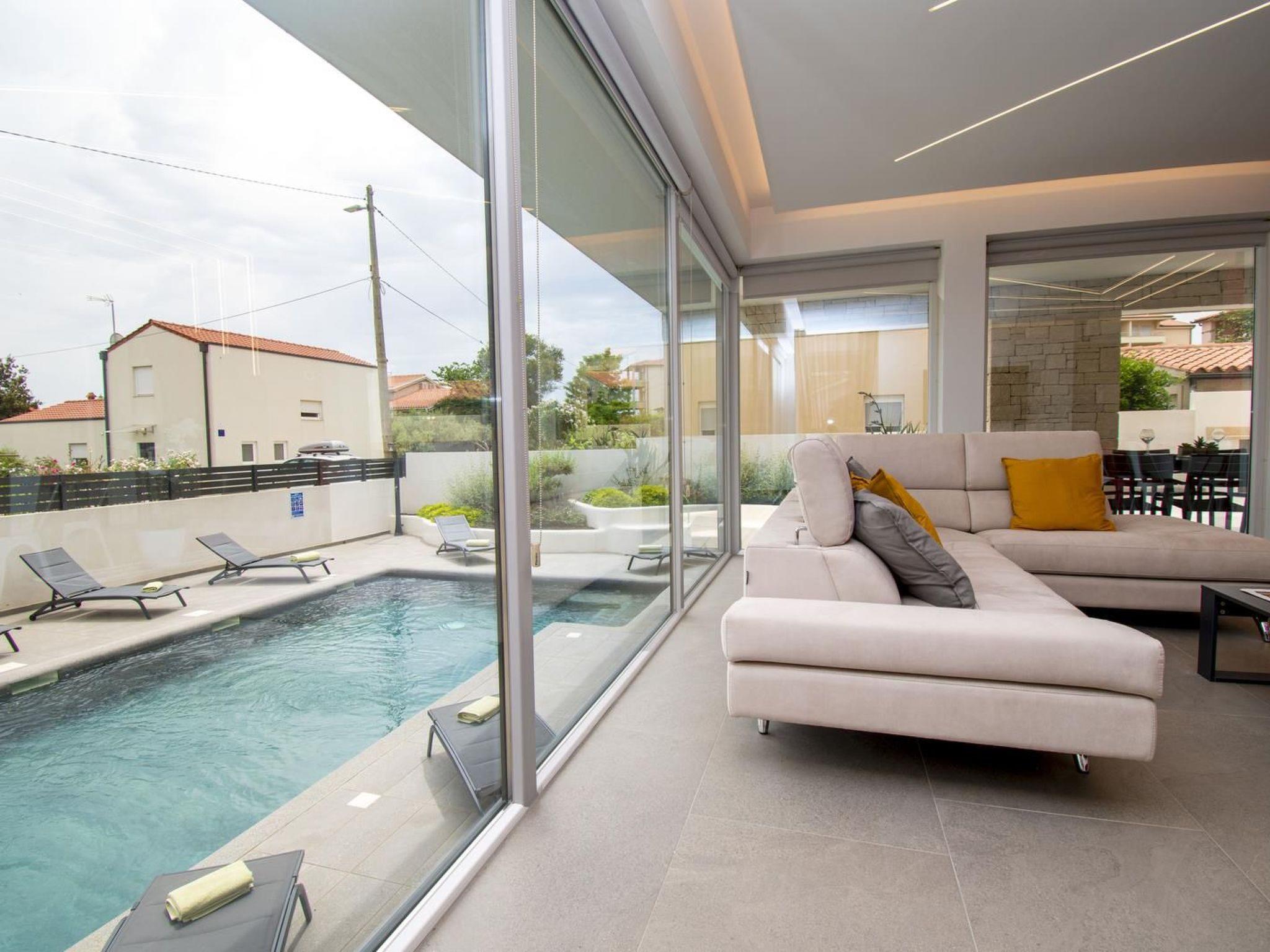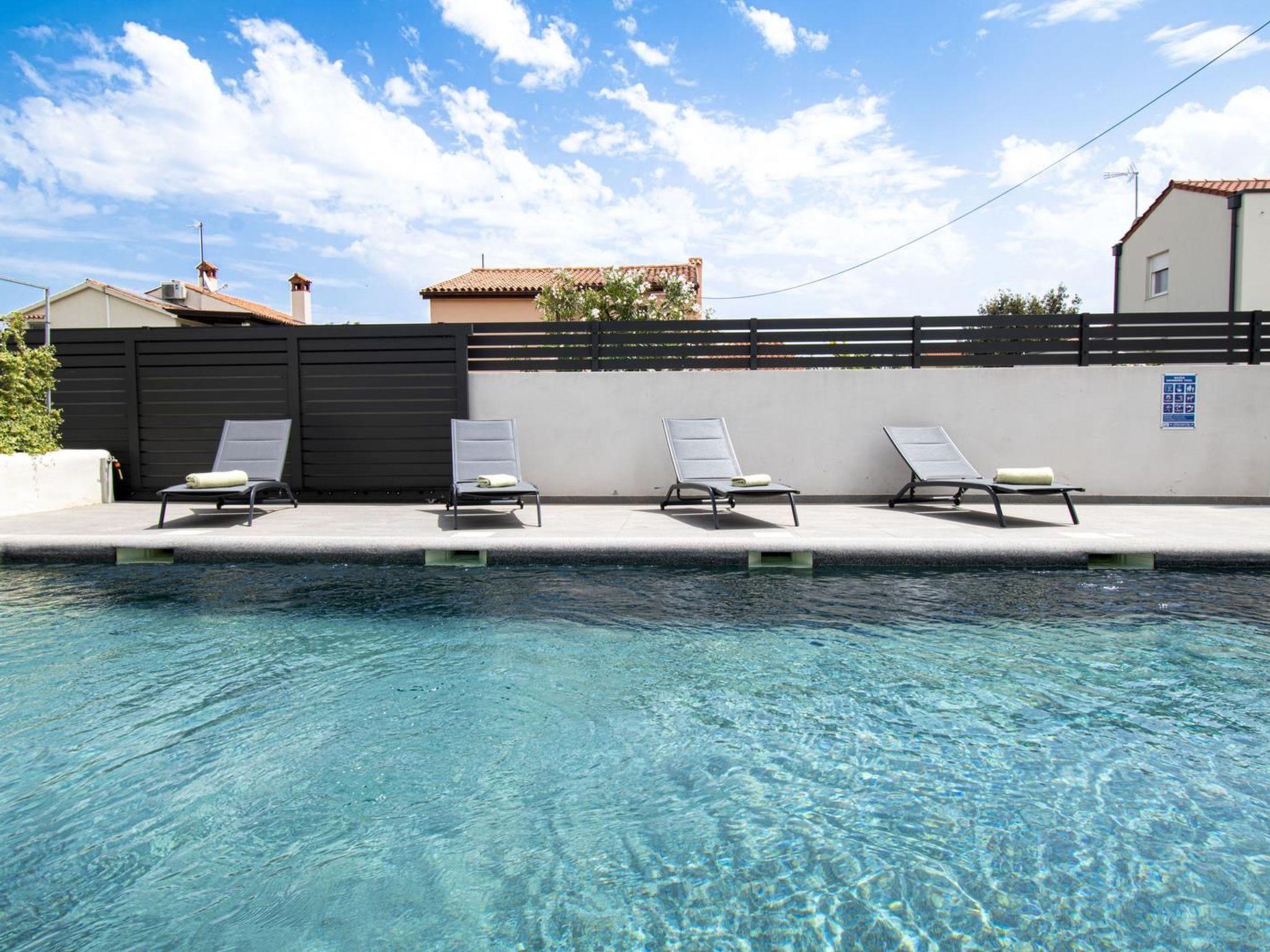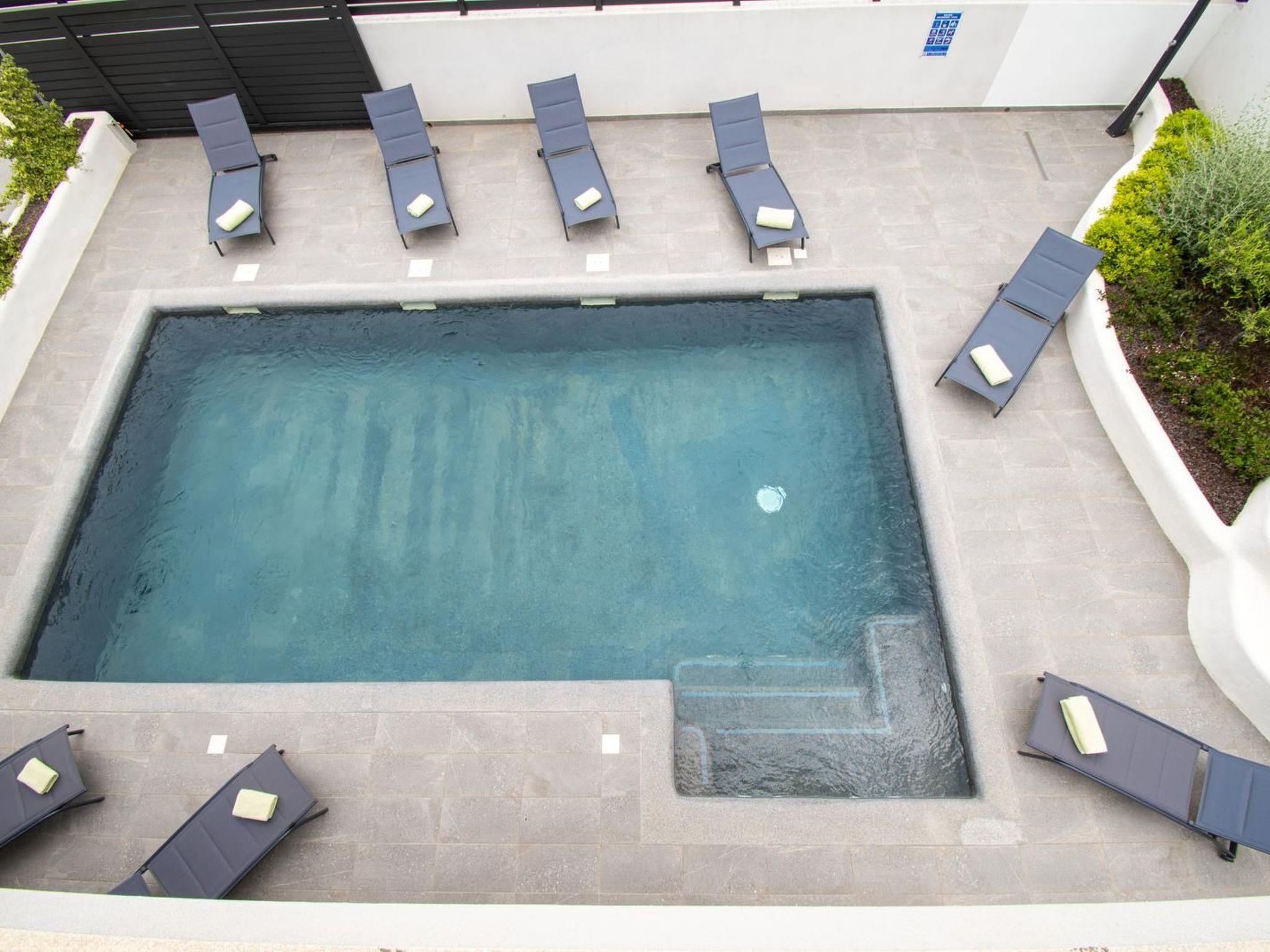 - private pool (8,2m x 4,5m, depth 1,5m), 8 sun beds and 3 umbrellas, outside shower