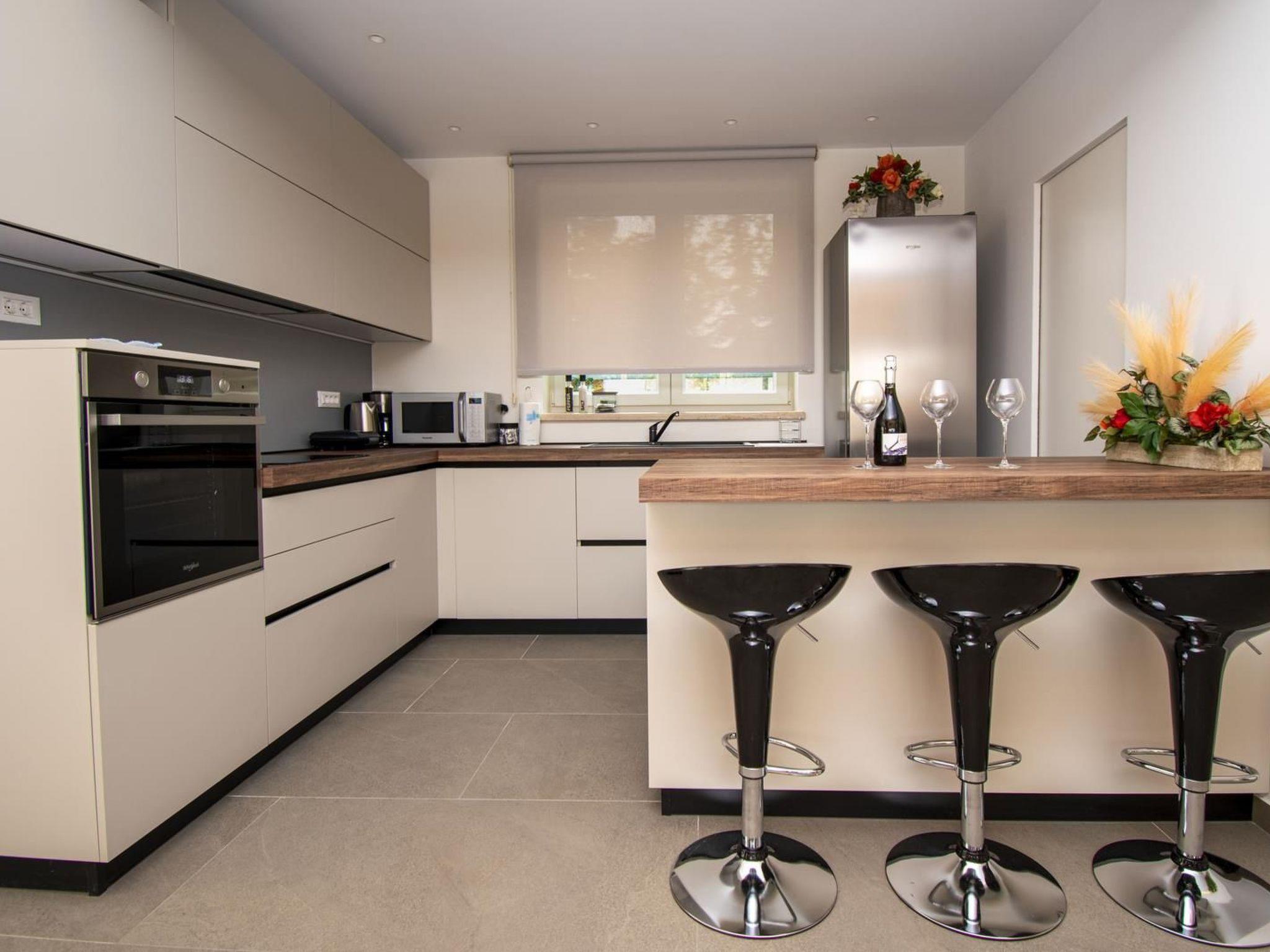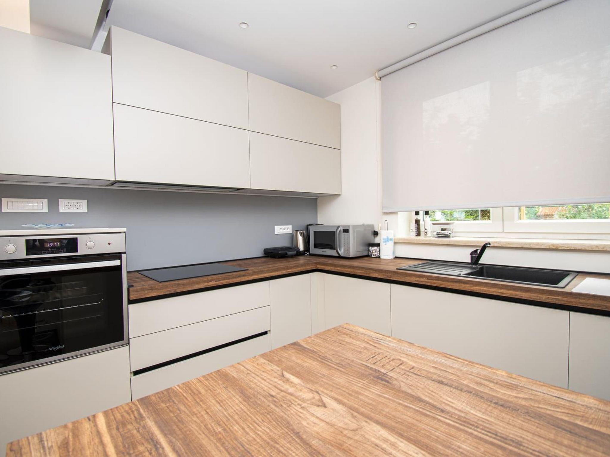 - kitchen ( induction stove with 4 cooking rings, refrigerator with freezing section, dish washer kettle, coffee machine (filter and mocca), oven, toaster, hood, utensils for cooking and eating, microwave )