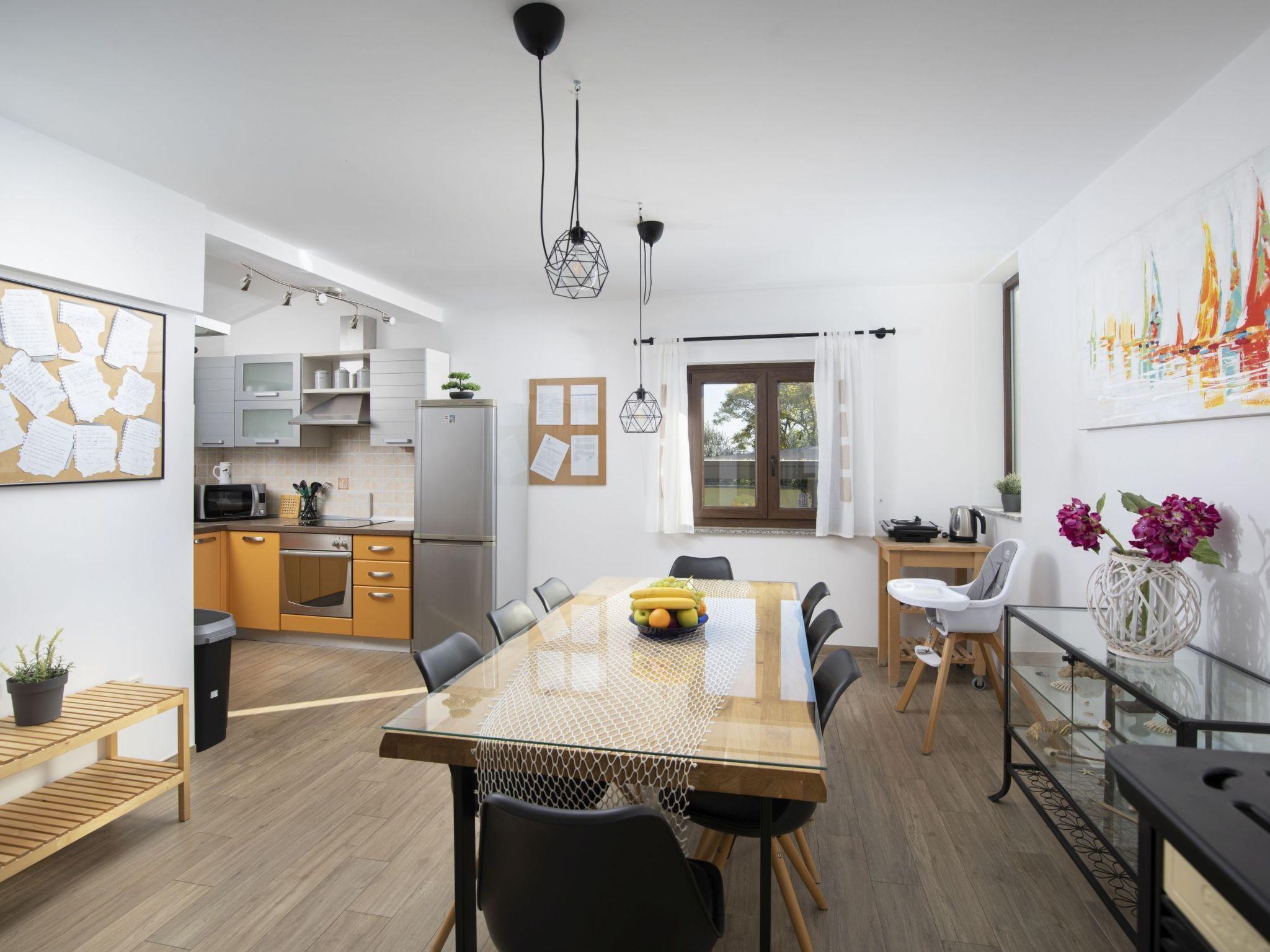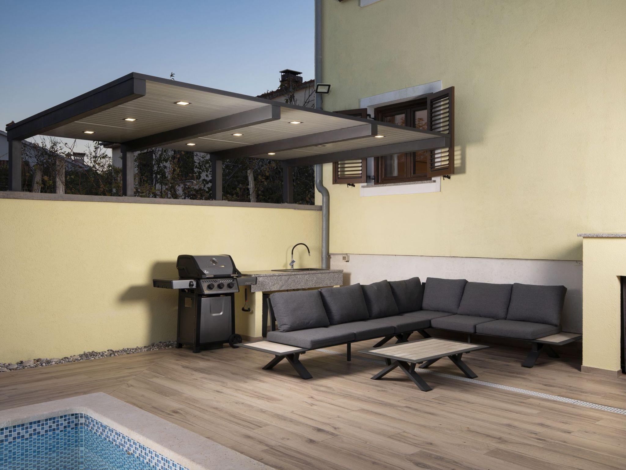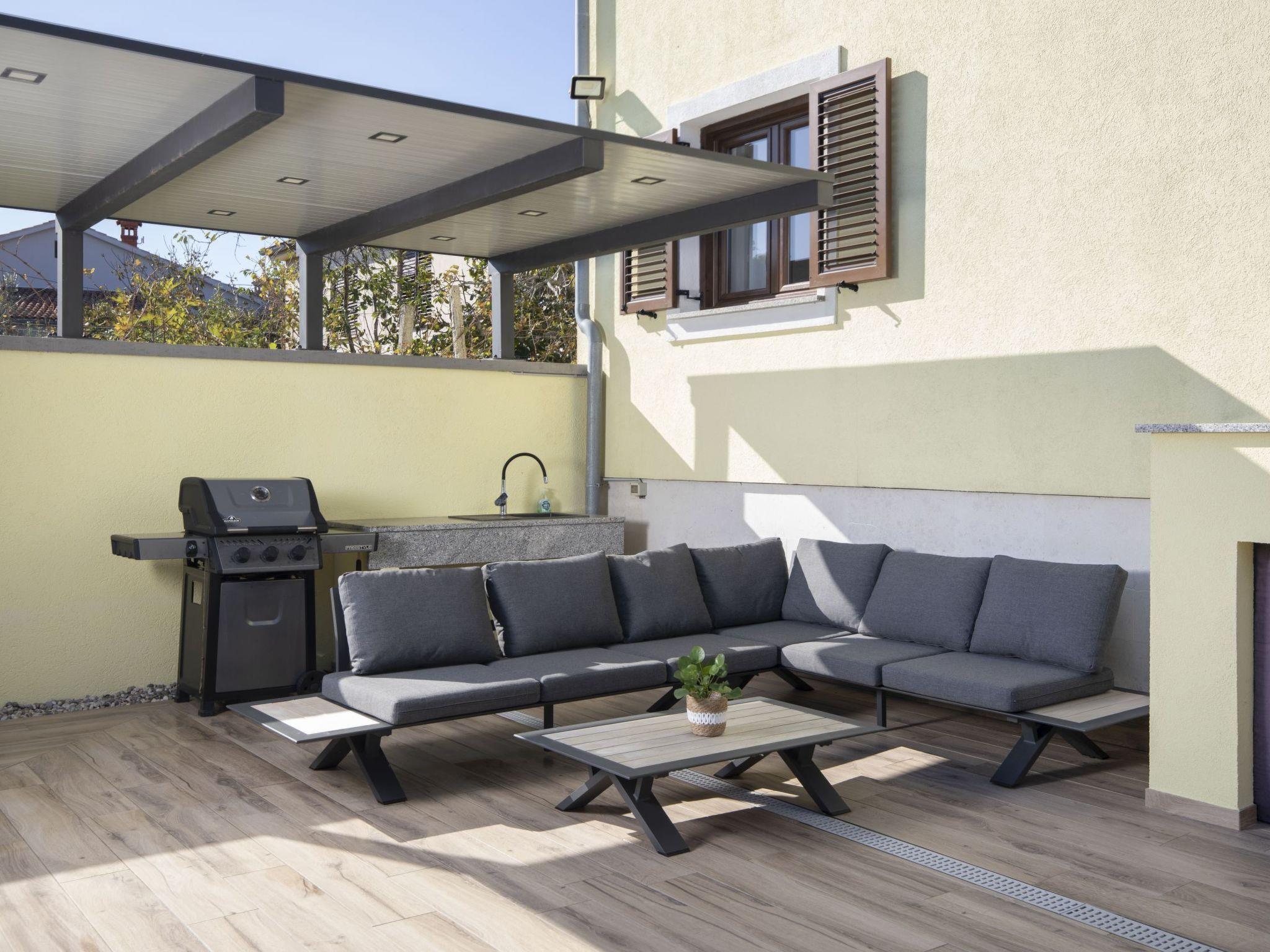 The outdoor area of Holiday House Captains is a true highlight, designed for ultimate relaxation and entertainment. The private garden encompasses a pool exclusive for your use, inviting you to take a refreshing dip at any time of day. The presence of a barbecue sets the stage for delightful outdoor dining experiences, while the terrace, outfitted with seating for six, offers the perfect backdrop for enjoying meals or simply lounging under the balmy Istrian sun. This setting promises memorable moments with loved ones in a serene environment.