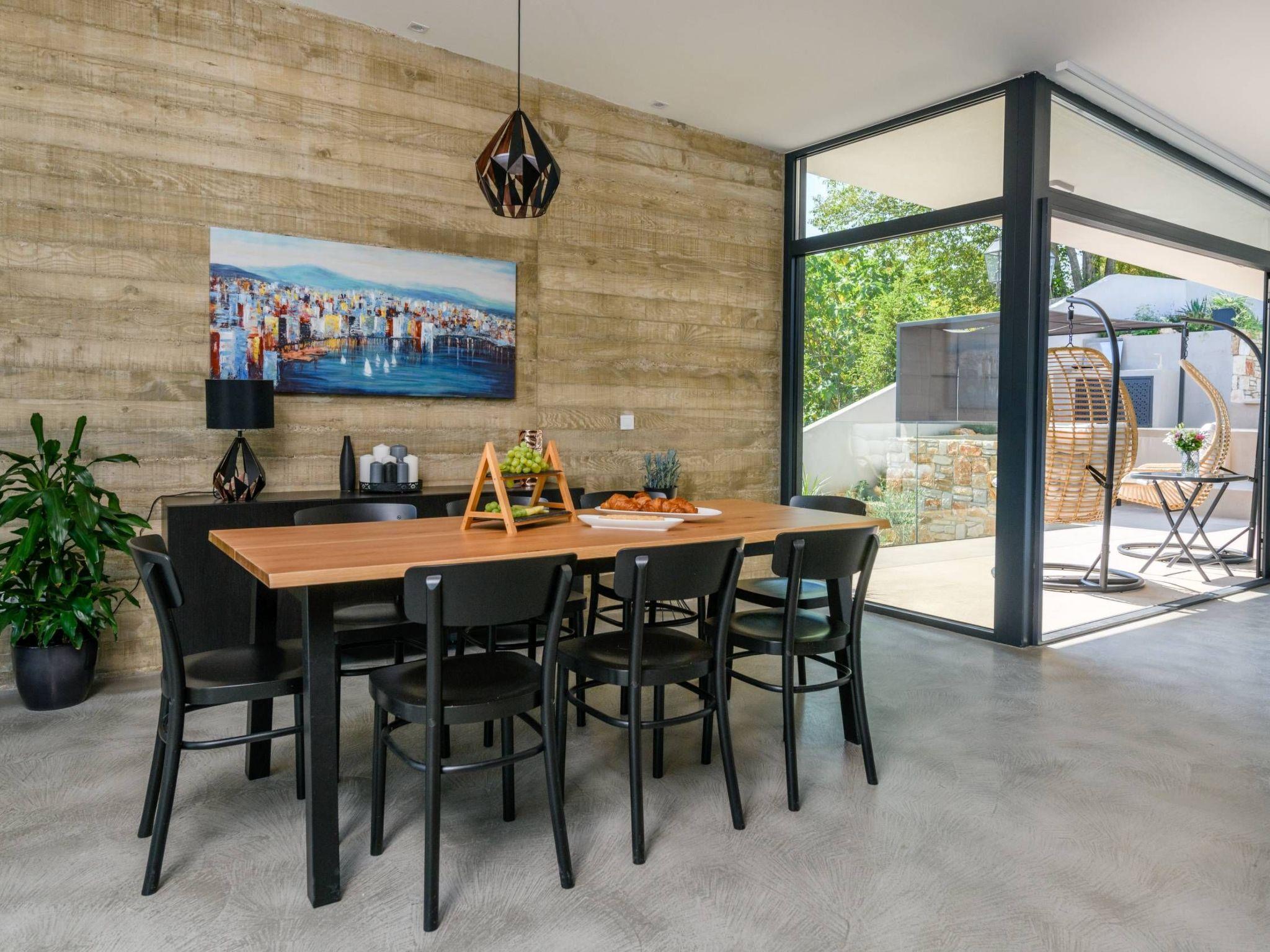 On the first floor, there is a spacious fully equipped kitchen with a dining table that can accommodate 8 people. The living room has access to the terrace.