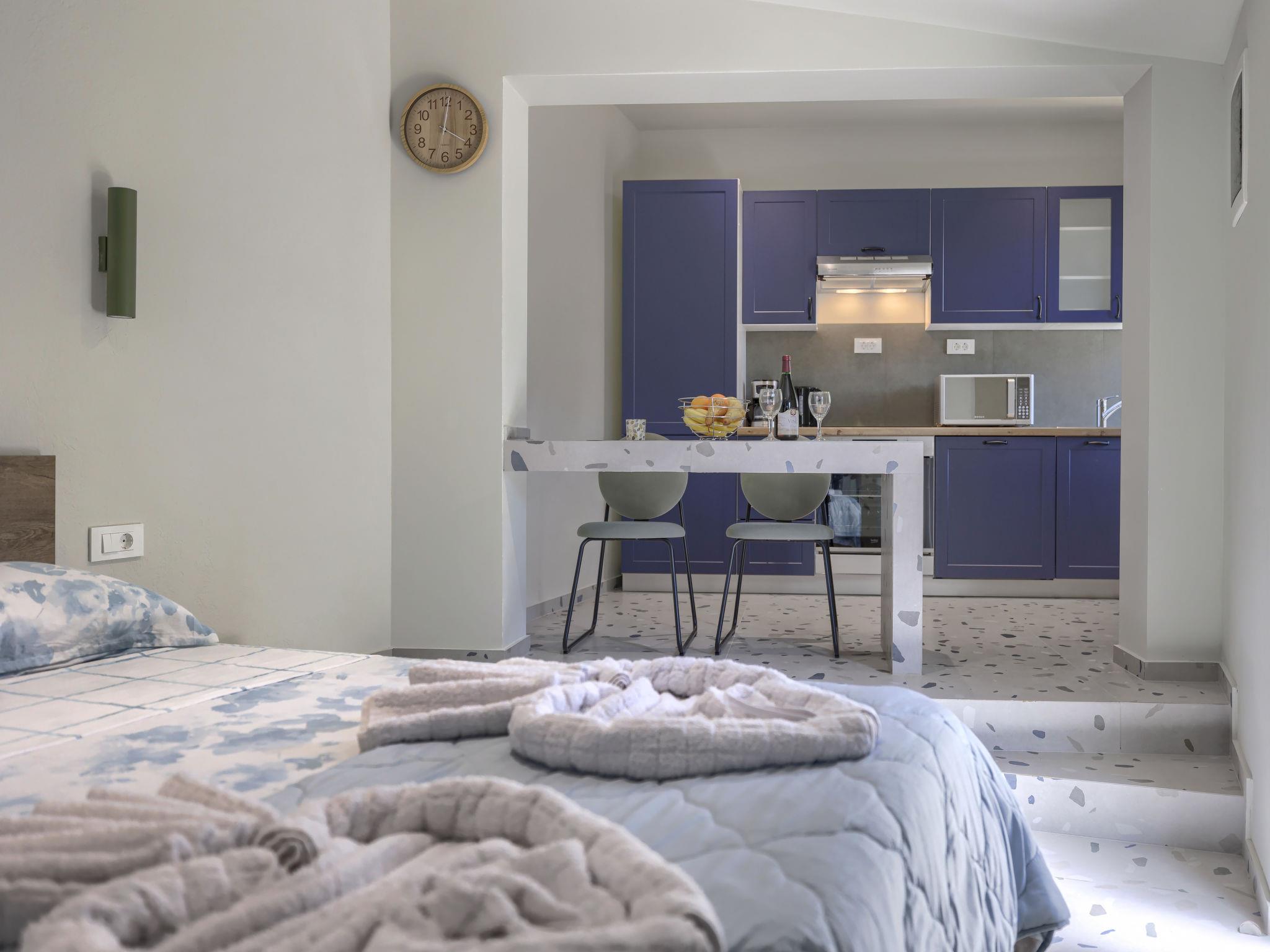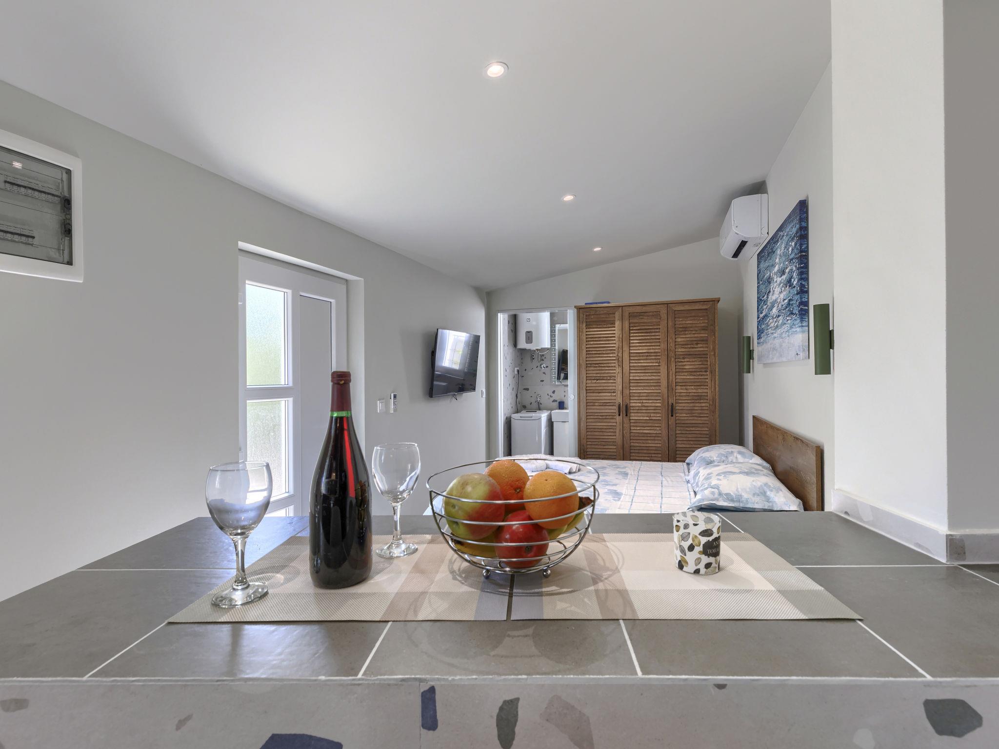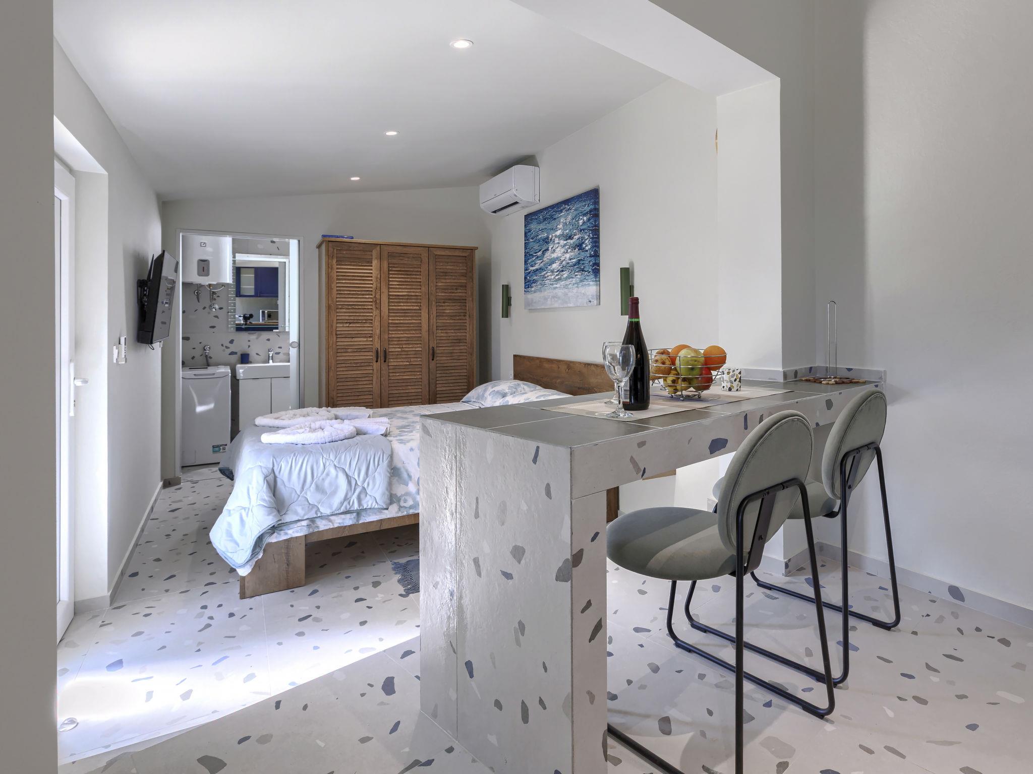 "More", 1-room studio 25 m2, on the ground floor. Beautiful furnishings: living/sleeping room with 1 french bed and satellite TV (flat screen), air conditioning. Exit to the terrace. Open kitchen (oven, dishwasher, 4 ceramic glass hob hotplates, toaster, freezer, electric coffee machine). Shower/WC. Forced-air heating. Facilities: Internet (WiFi, free). Please note: private entrance.