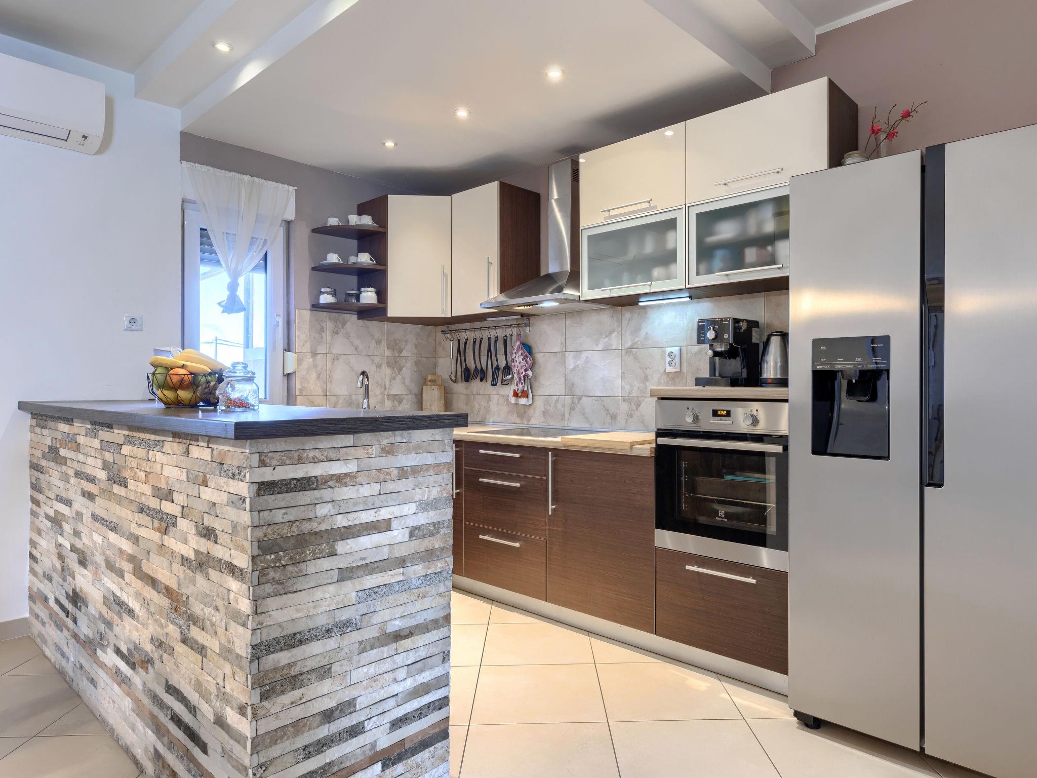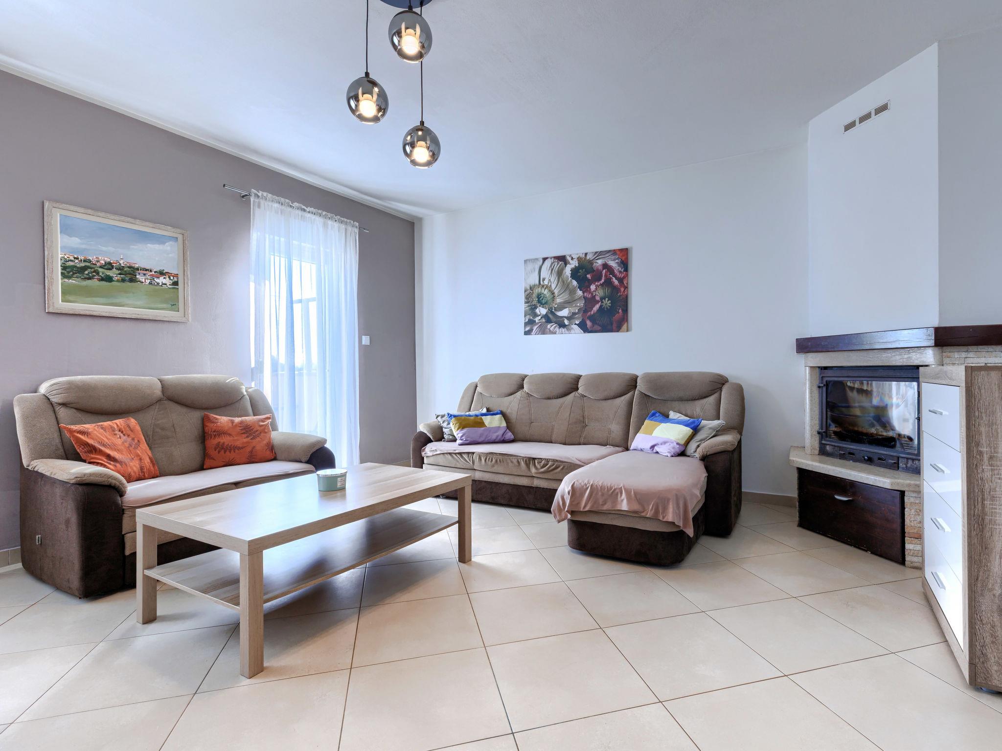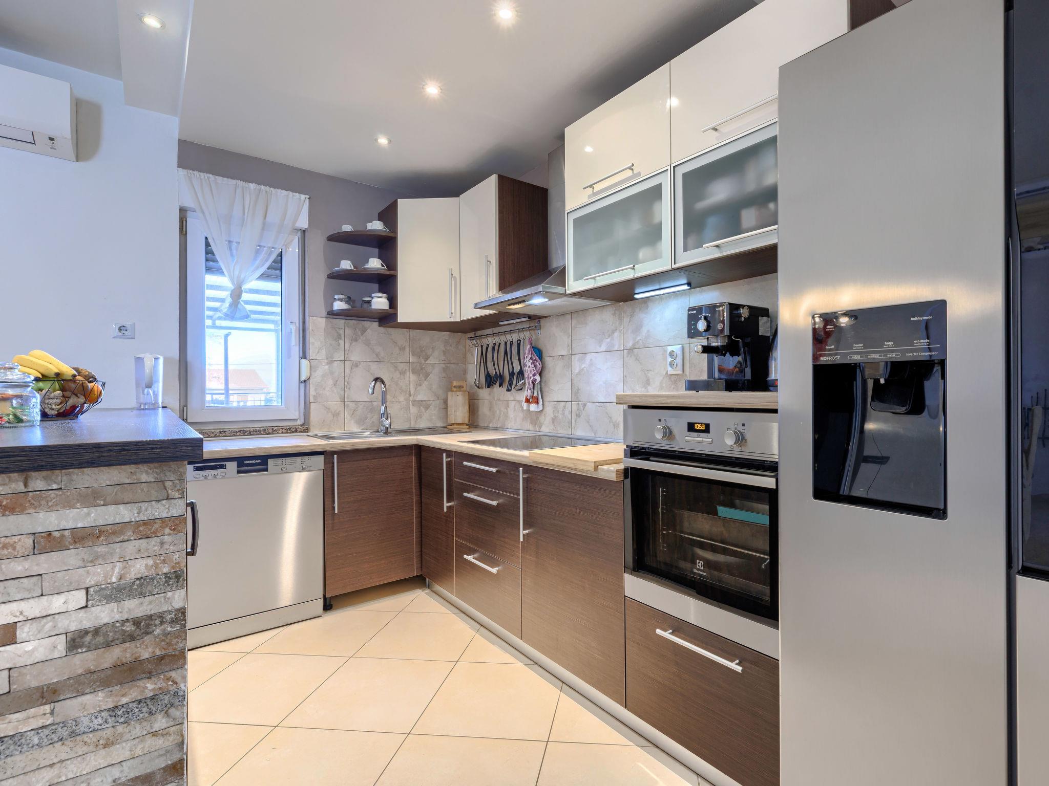 "L&V", 4-room apartment 150 m2 on 2 levels on 1st floor. Spacious: living/dining room with open-hearth fireplace (only for decoration), satellite TV (flat screen), air conditioning. Exit to the balcony. Open kitchen (oven, dishwasher, 4 induction hot plates, toaster, kettle, microwave, freezer, electric coffee machine). Shower/WC. Upper floor: (spiral staircase) entrance hall with air conditioning. With sloping ceilings, 1 room with 2 beds (90 cm, length 200 cm). With sloping ceilings, 1 room with 1 french bed (160 cm, length 200 cm). With sloping ceilings, 1 room with 1 french bed (180 cm, length 200 cm). Bath/WC. Forced-air heating. Balcony 3 m2. Terrace furniture, balcony furniture. Side view of the sea. Facilities: washing machine, dryer, children's high chair, baby cot. Internet (WiFi, free). Please note: non-smoking house.