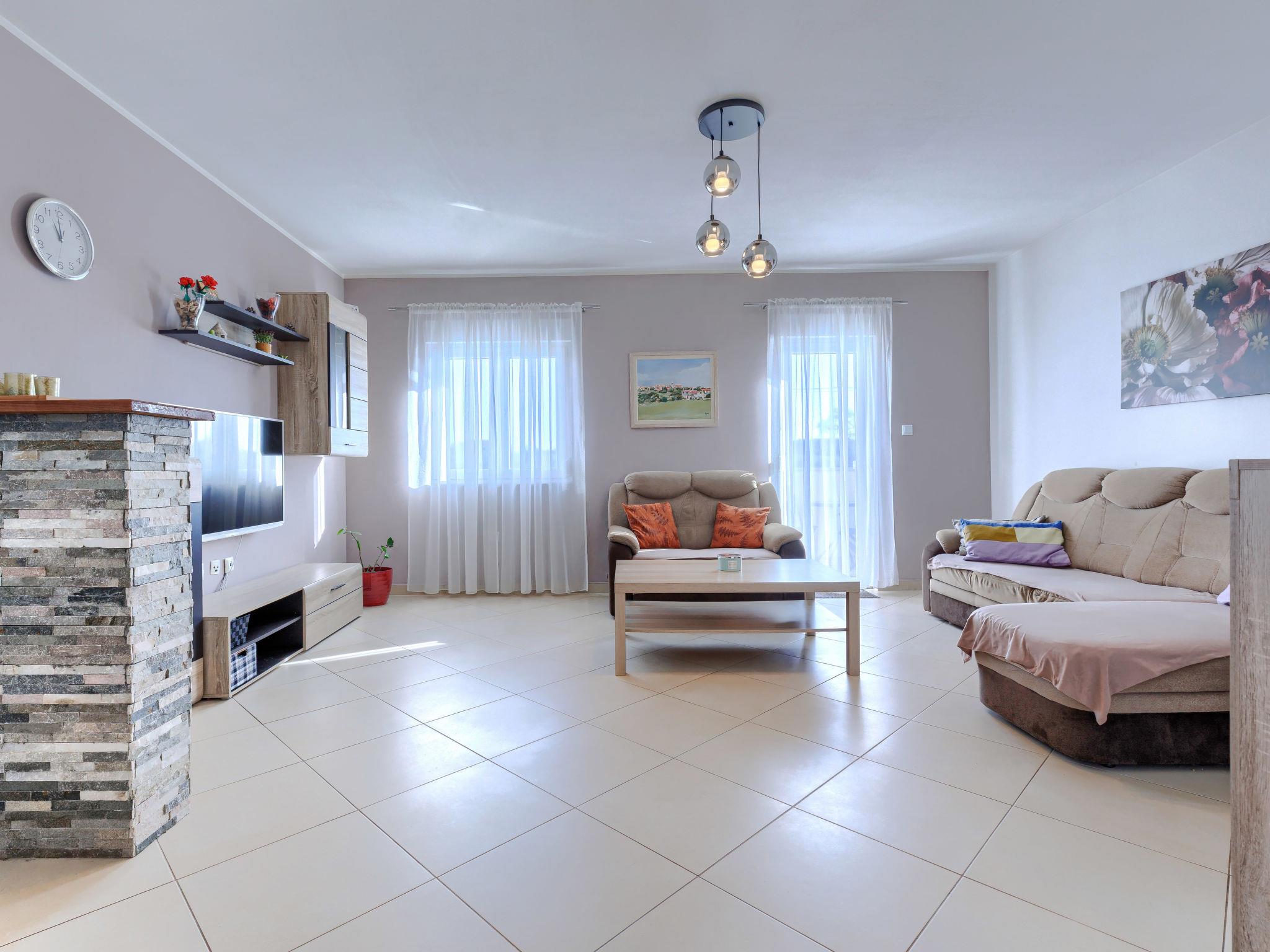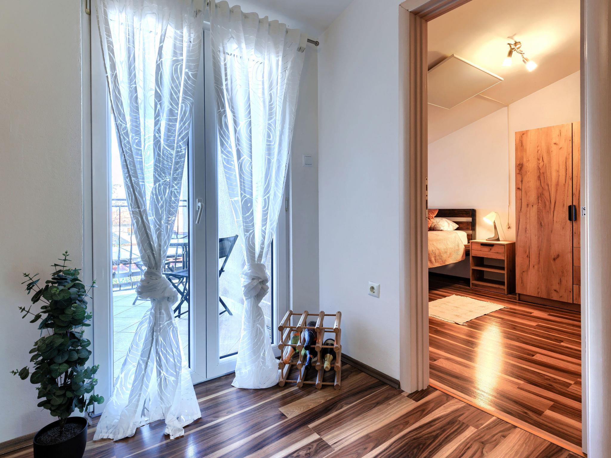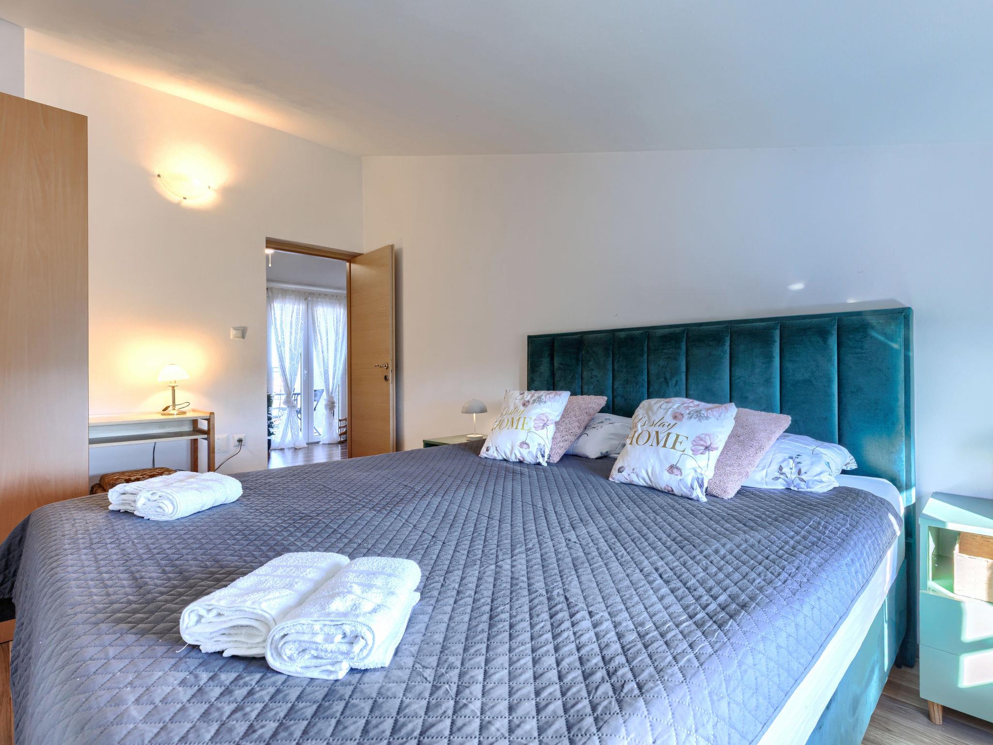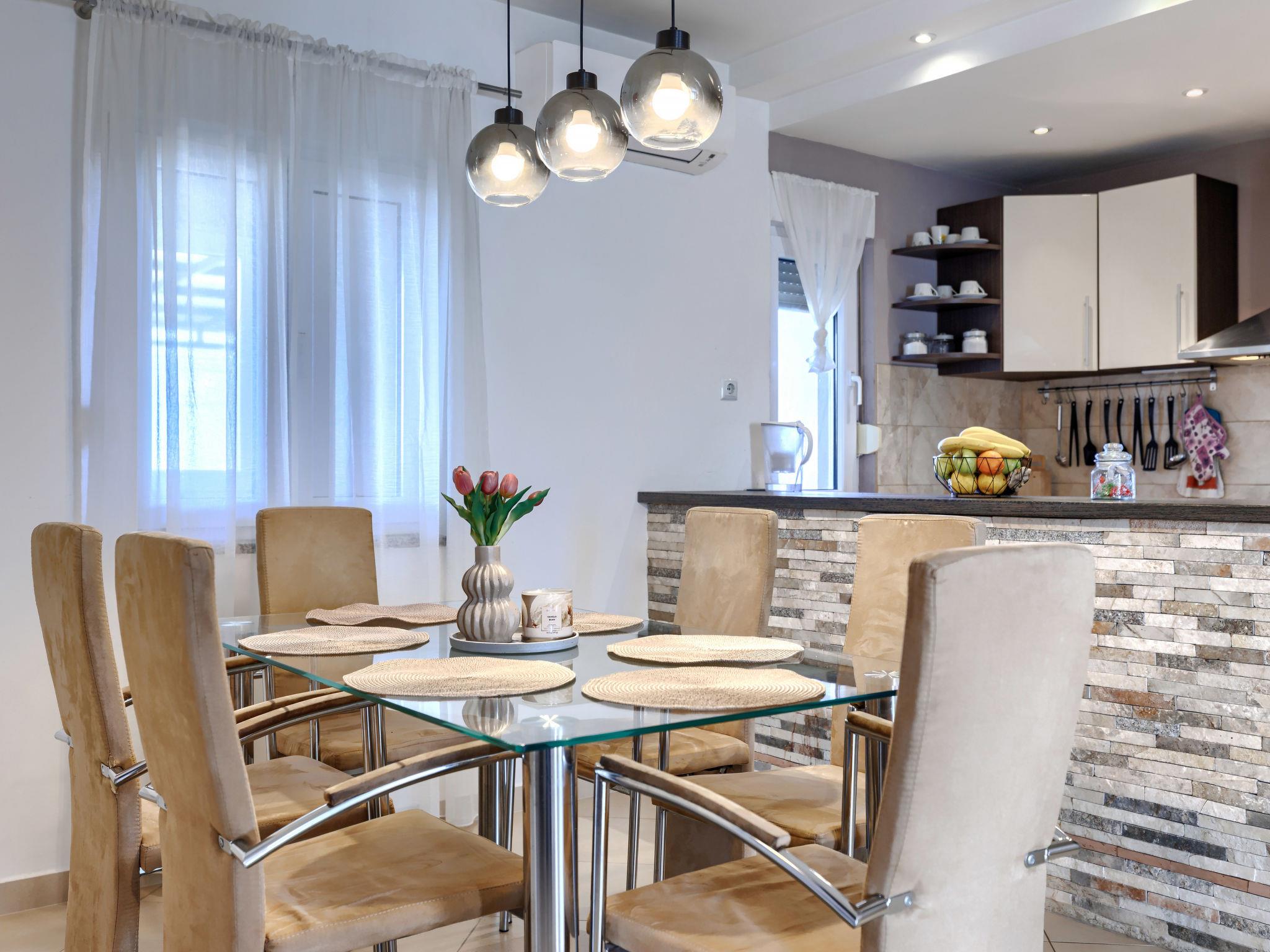 "L&V", 4-room apartment 150 m2 on 2 levels on 1st floor. Spacious: living/dining room with open-hearth fireplace (only for decoration), satellite TV (flat screen), air conditioning. Exit to the balcony. Open kitchen (oven, dishwasher, 4 induction hot plates, toaster, kettle, microwave, freezer, electric coffee machine). Shower/WC. Upper floor: (spiral staircase) entrance hall with air conditioning. With sloping ceilings, 1 room with 2 beds (90 cm, length 200 cm). With sloping ceilings, 1 room with 1 french bed (160 cm, length 200 cm). With sloping ceilings, 1 room with 1 french bed (180 cm, length 200 cm). Bath/WC. Forced-air heating. Balcony 3 m2. Terrace furniture, balcony furniture. Side view of the sea. Facilities: washing machine, dryer, children's high chair, baby cot. Internet (WiFi, free). Please note: non-smoking house.
