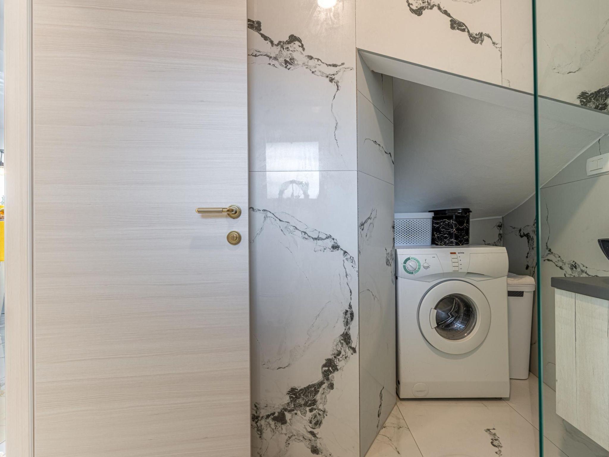 On the ground floor, you will find a living room, a fully equipped kitchen, a bedroom with a double bed, and a bathroom with a washing machine.