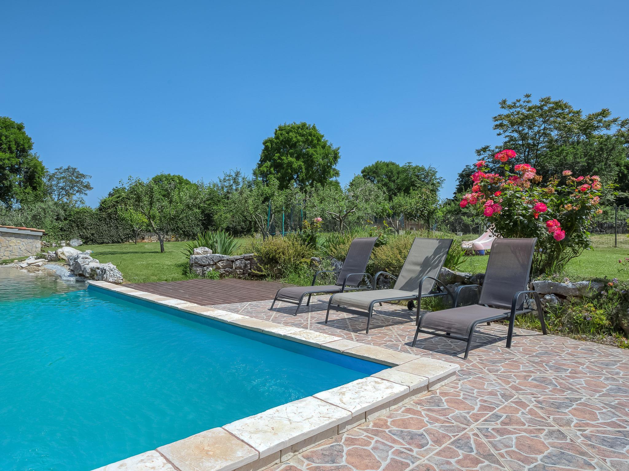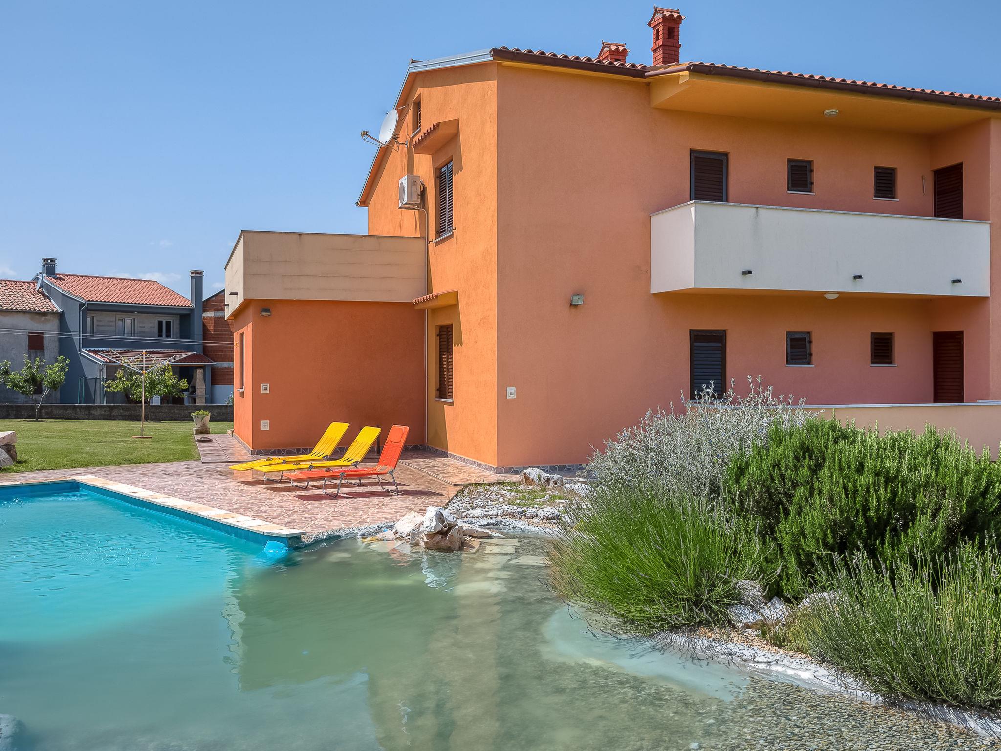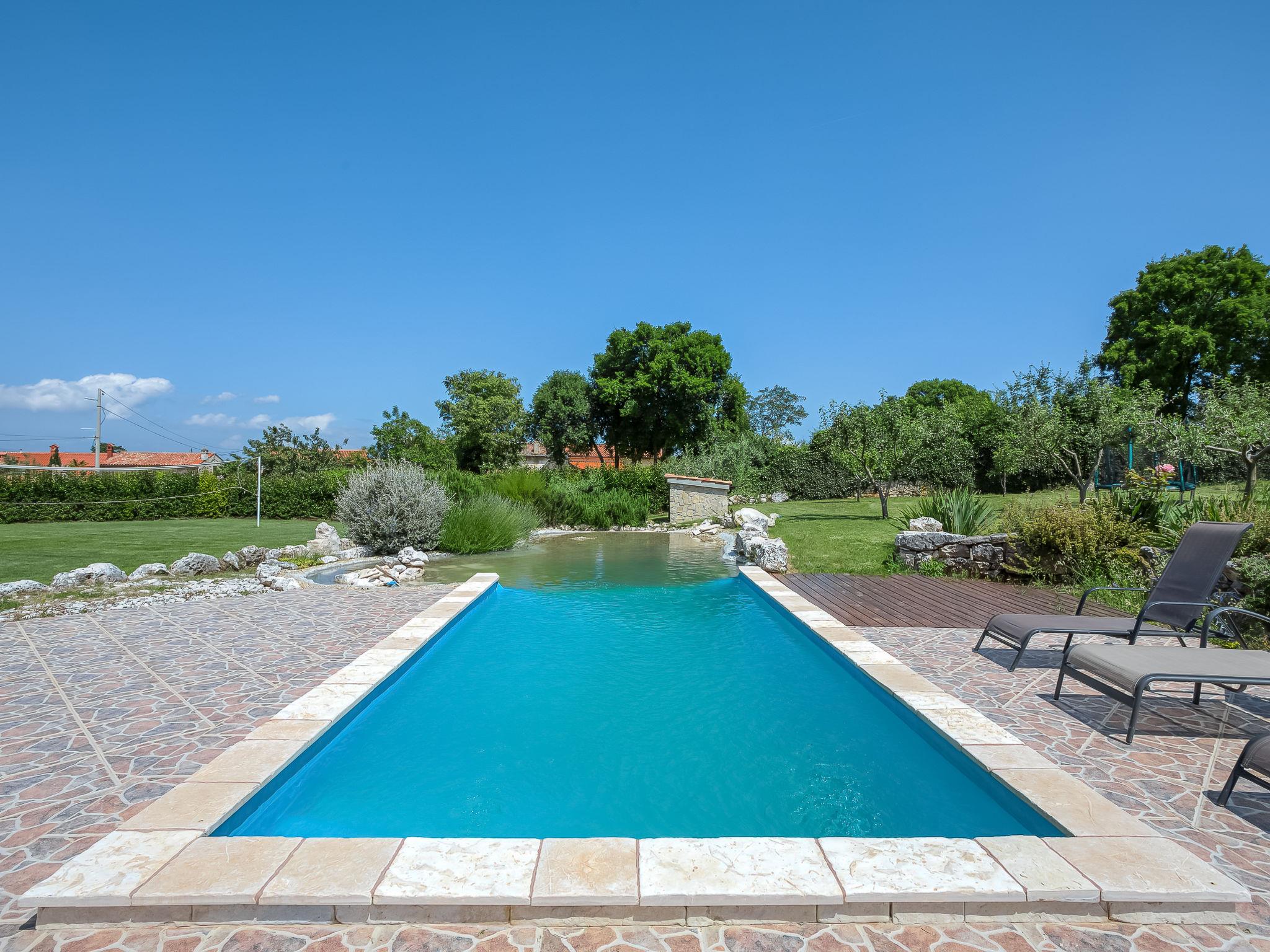 Krnica 22 km from Pula: Beautiful 2-family house "Mario 1", 2 storeys. In the hamlet Bratulici 5 km from the centre of Krnica, in a quiet, sunny position, 7 km from the sea. Private: property 2'000 m2, large garden with lawn 1'000 m2, swimming pool (45 m2, depth 140 cm, seasonal availability: 02.May. - 26.Sep.). Unconventional pool shape. Volleyball, children's playground (slide). In the house: internet access. Parking at the house on the premises. Shop 2 km, restaurant 100 m, bus stop 1.4 km, pebble beach 10 km, rocky beach 7 km. Tennis 10 km, riding stable 3 km.