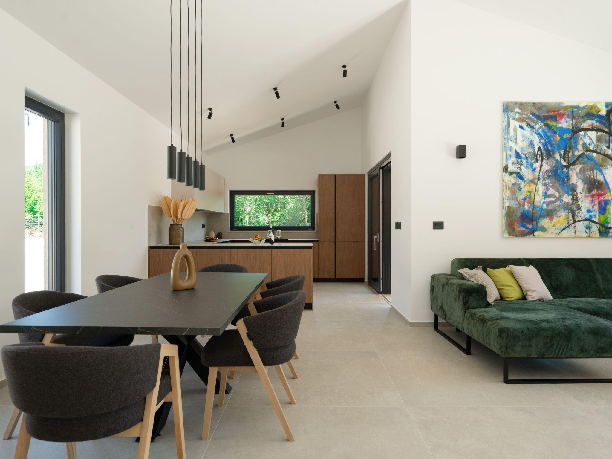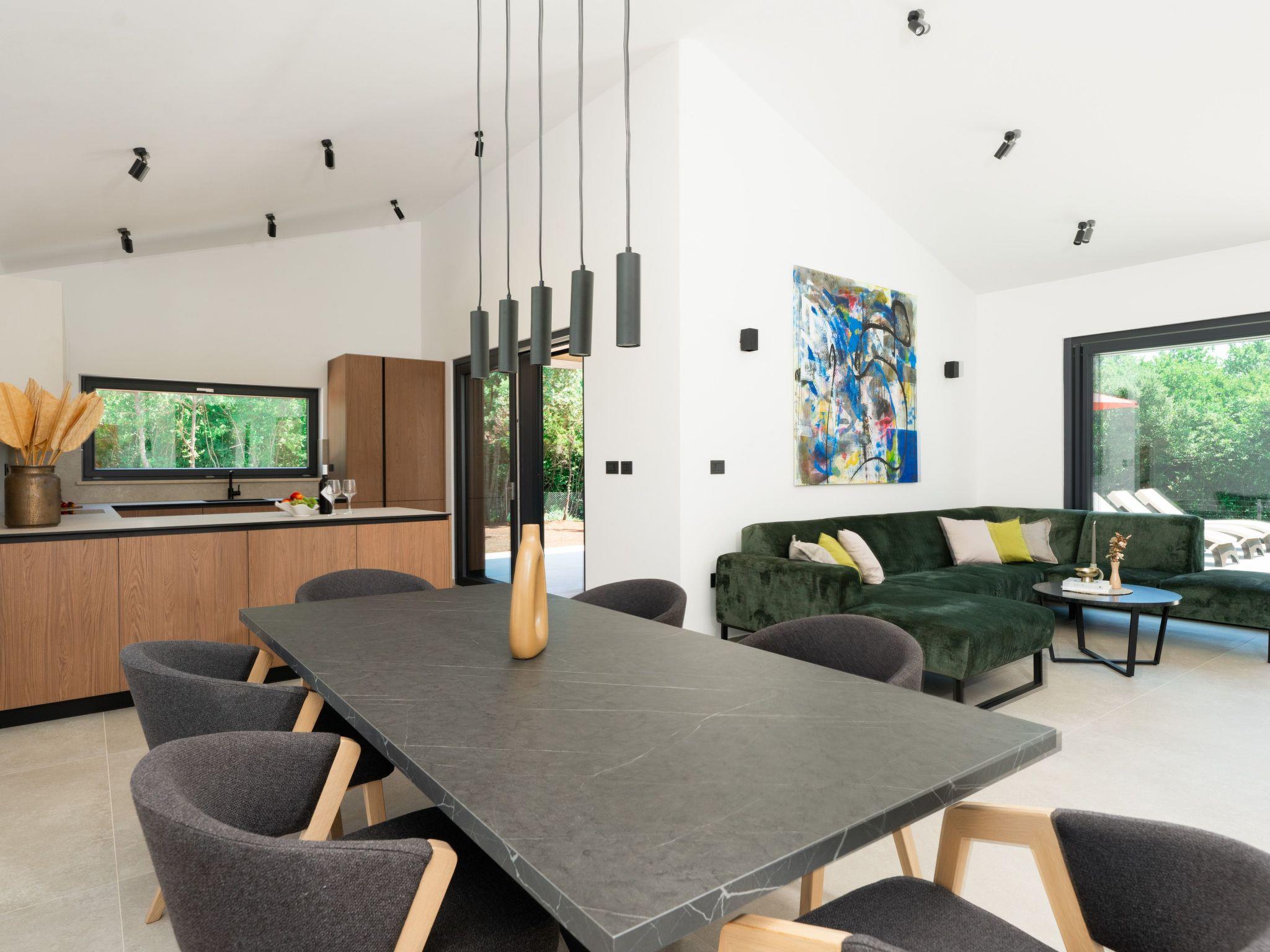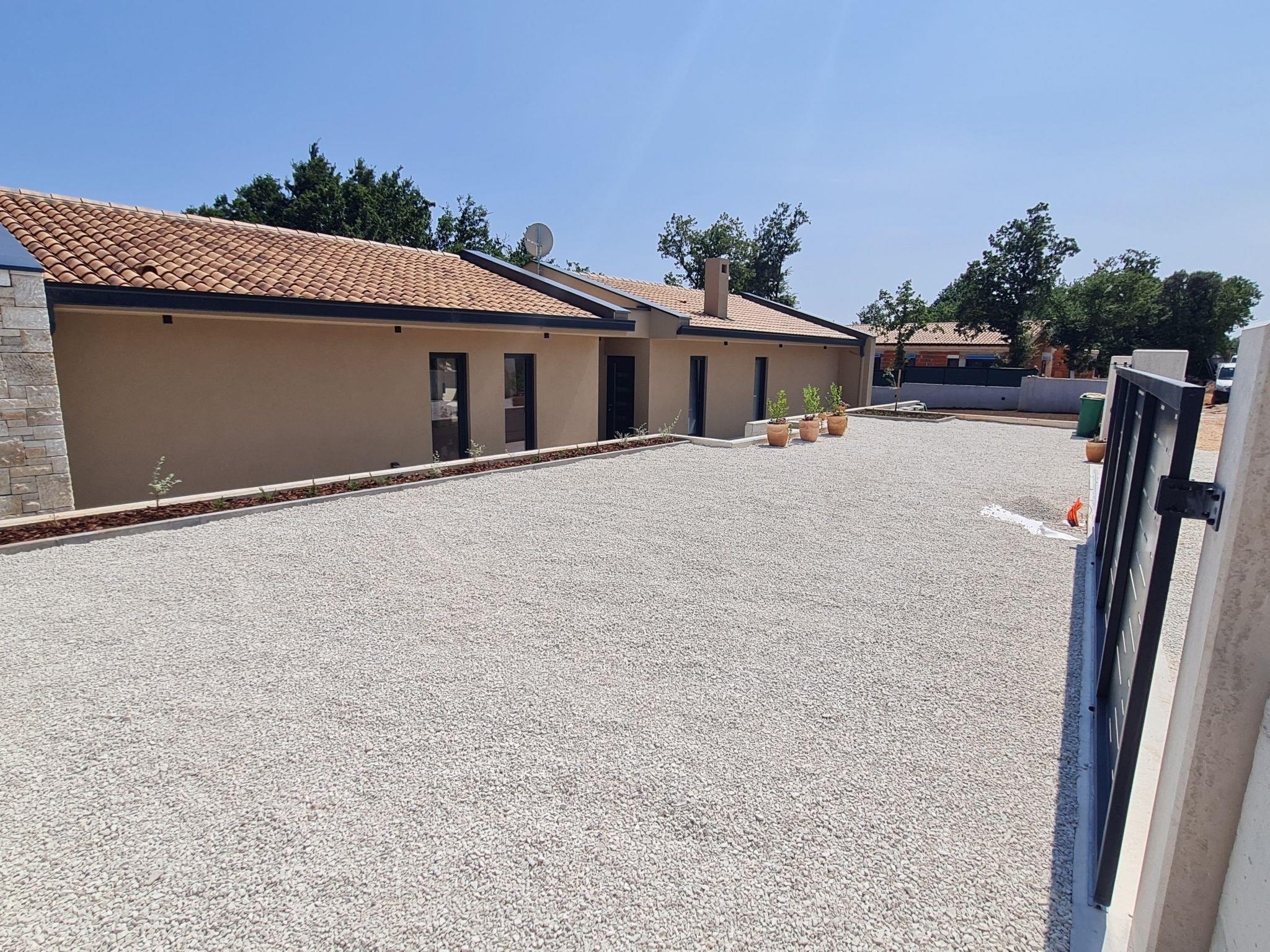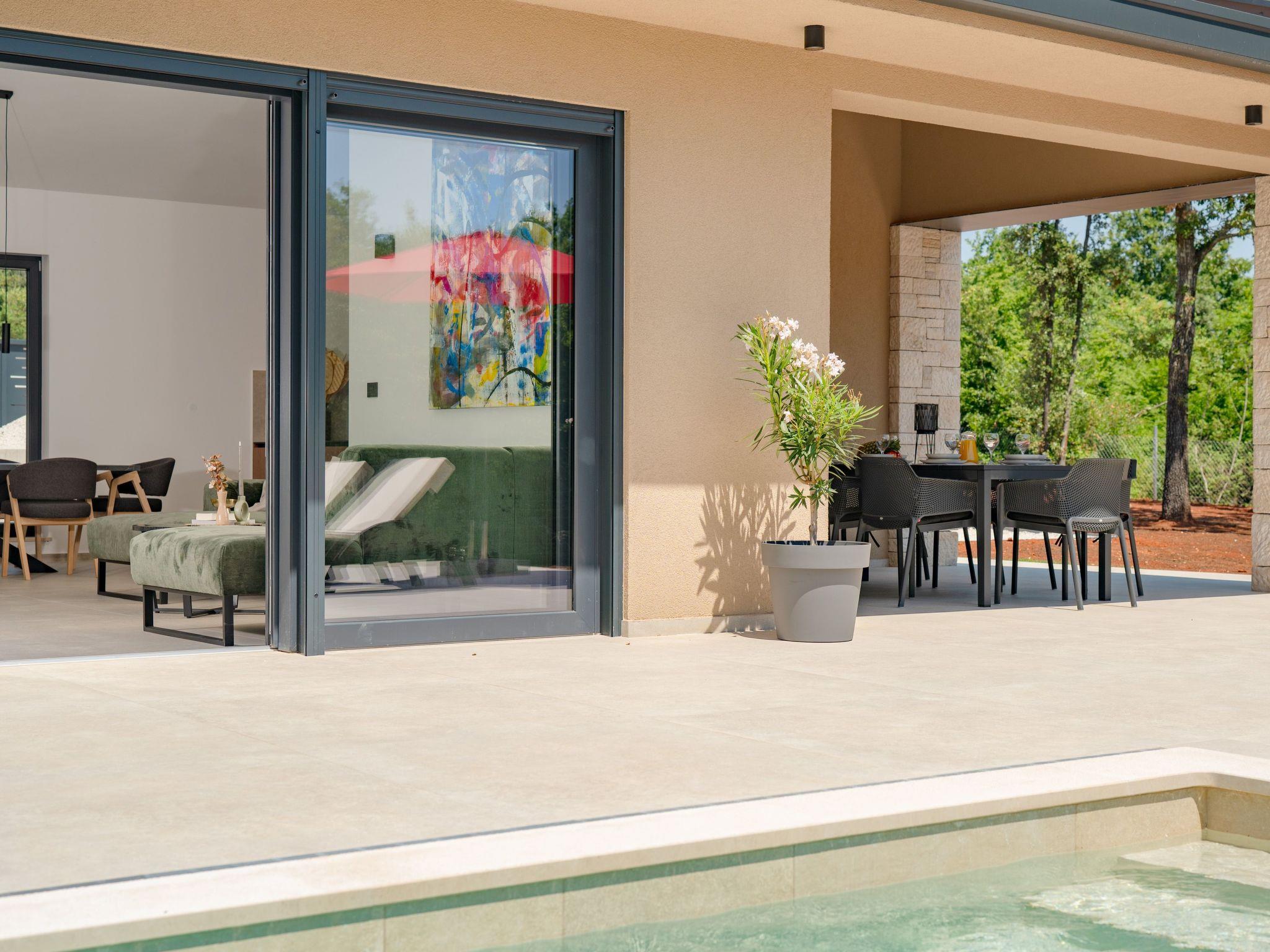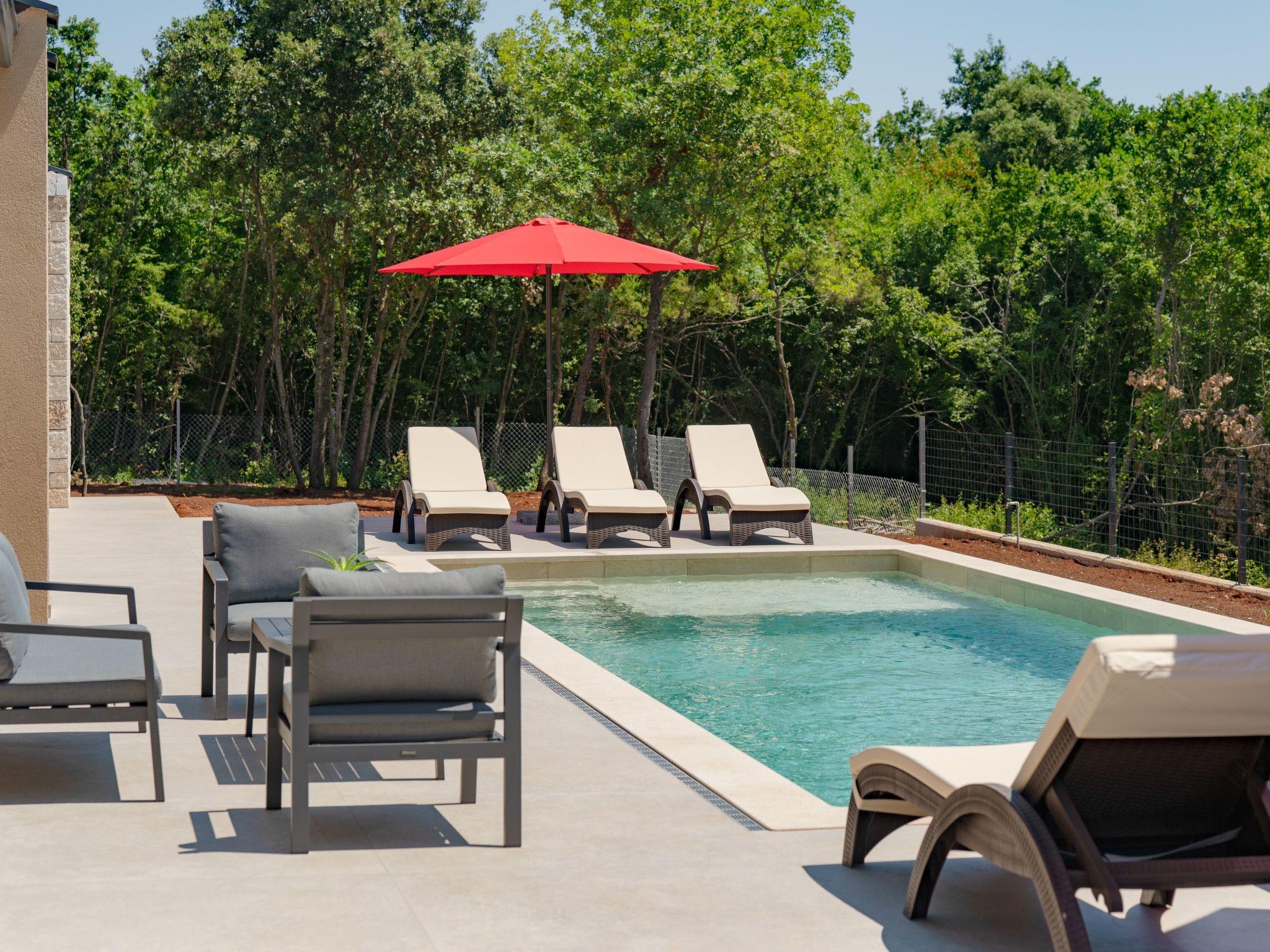 This comfortable villa is located in a quiet part of the village Peruški, surrounded by forest on two sides. It has 3 bedrooms – one is a master with its own bathroom, and there's also a second shared bathroom. The main area is a spacious open-plan kitchen, dining room, and living room, perfect for spending time together. The kitchen opens onto a covered terrace, great for outdoor meals. Outside, there's a large swimming pool, lounge area, fenced garden, outdoor grill, and private parking.