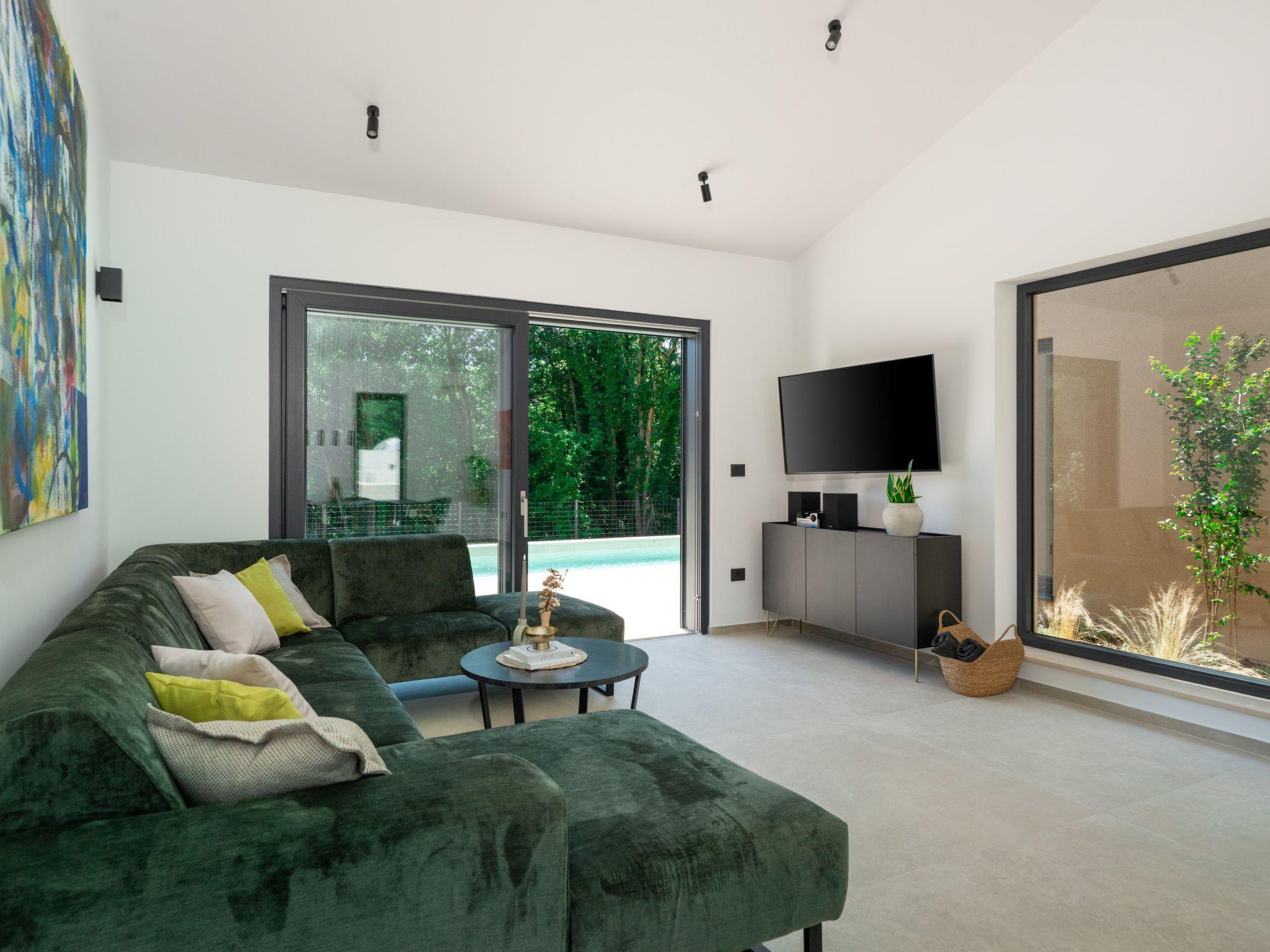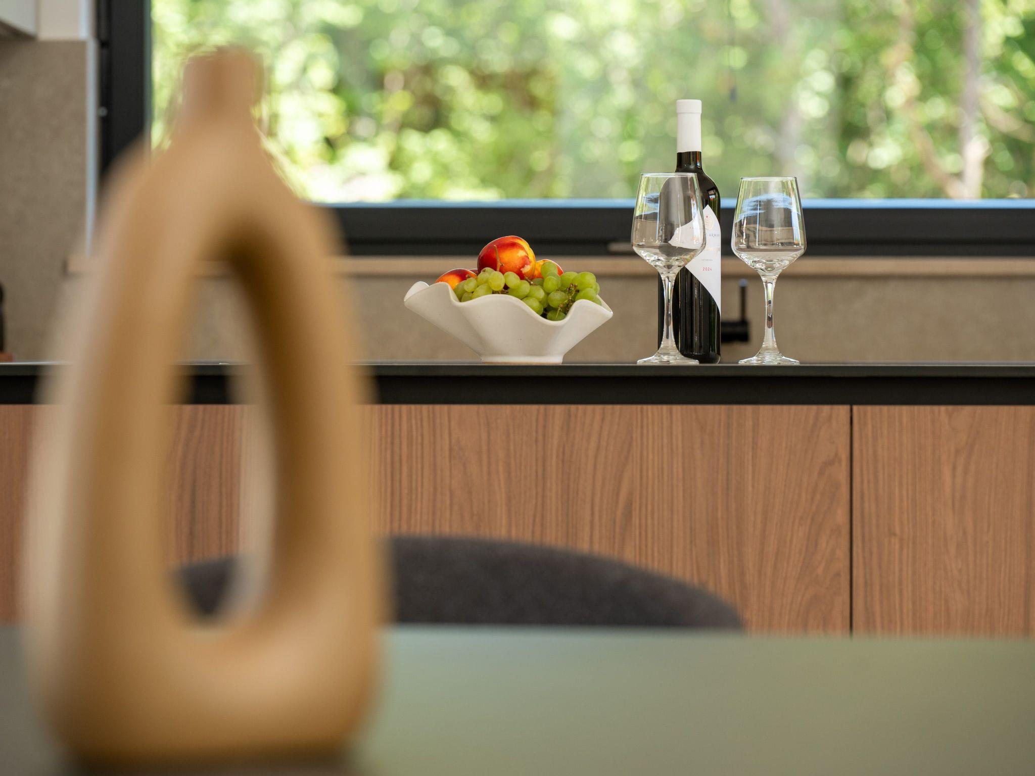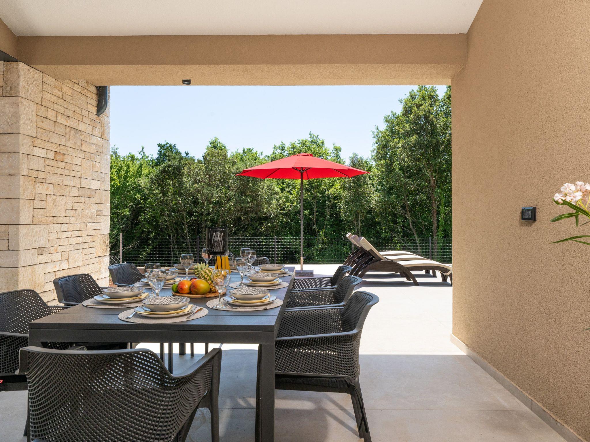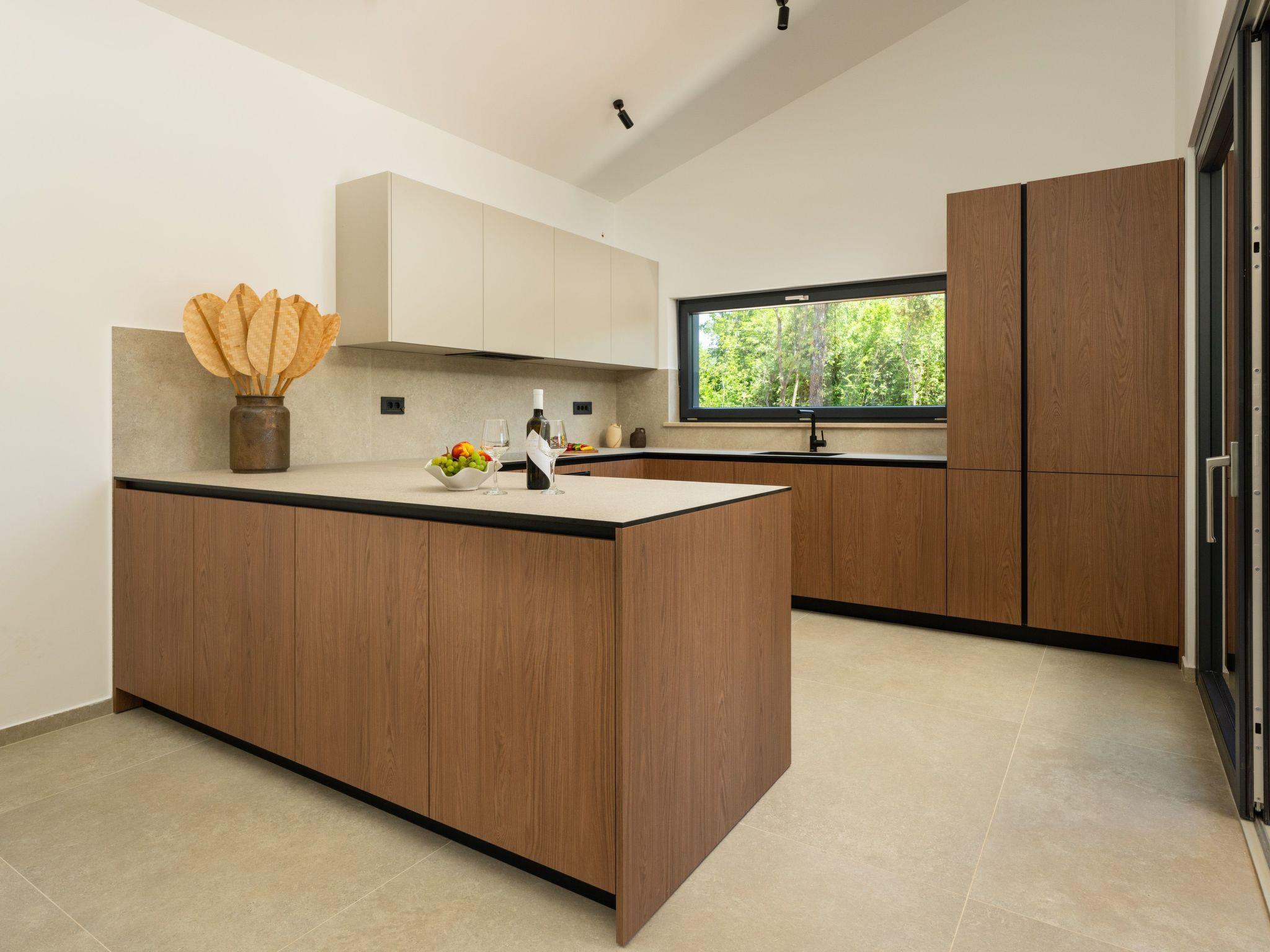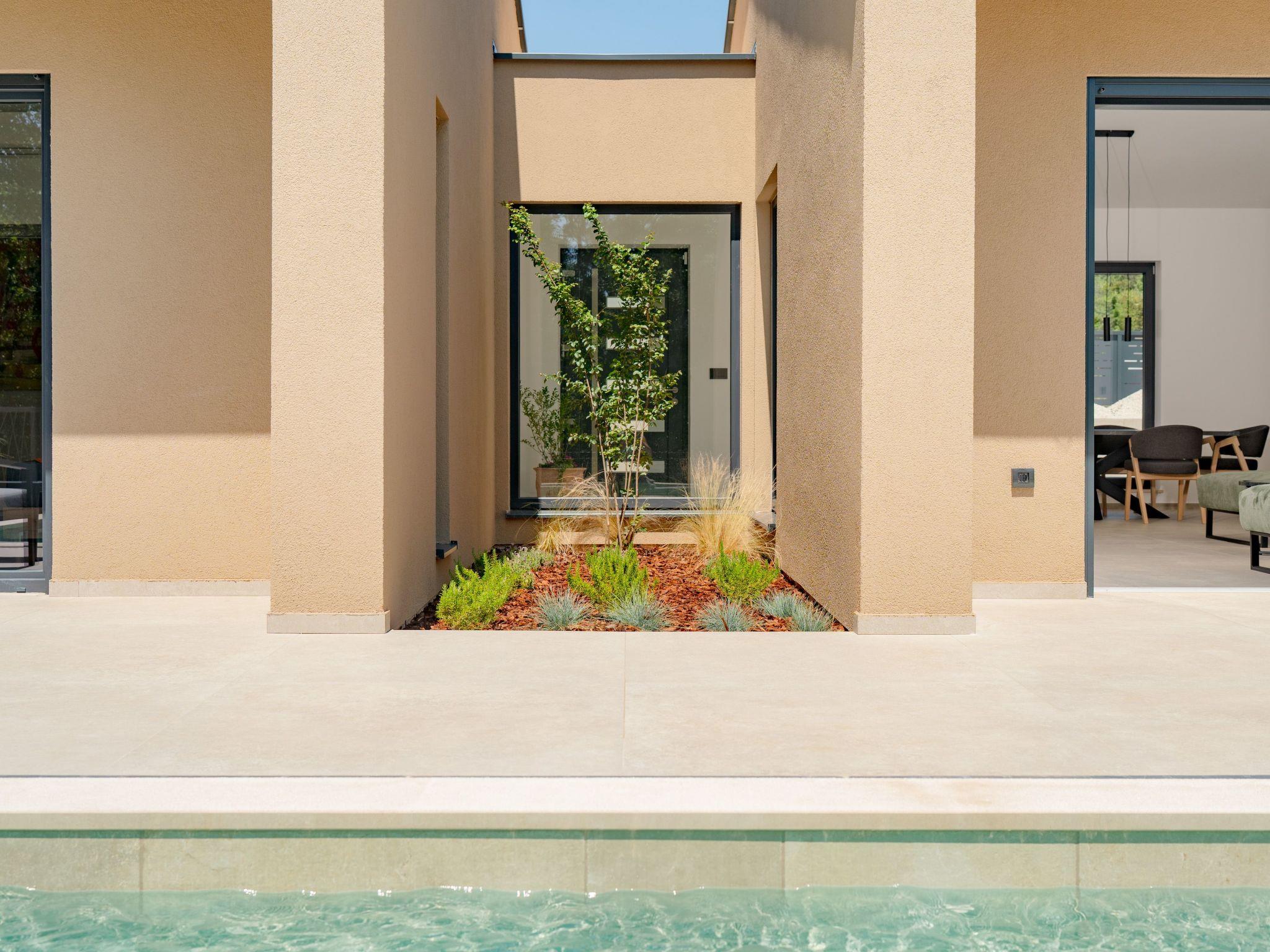This comfortable villa is located in a quiet part of the village Peruški, surrounded by forest on two sides. It has 3 bedrooms – one is a master with its own bathroom, and there's also a second shared bathroom. The main area is a spacious open-plan kitchen, dining room, and living room, perfect for spending time together. The kitchen opens onto a covered terrace, great for outdoor meals. Outside, there's a large swimming pool, lounge area, fenced garden, outdoor grill, and private parking.