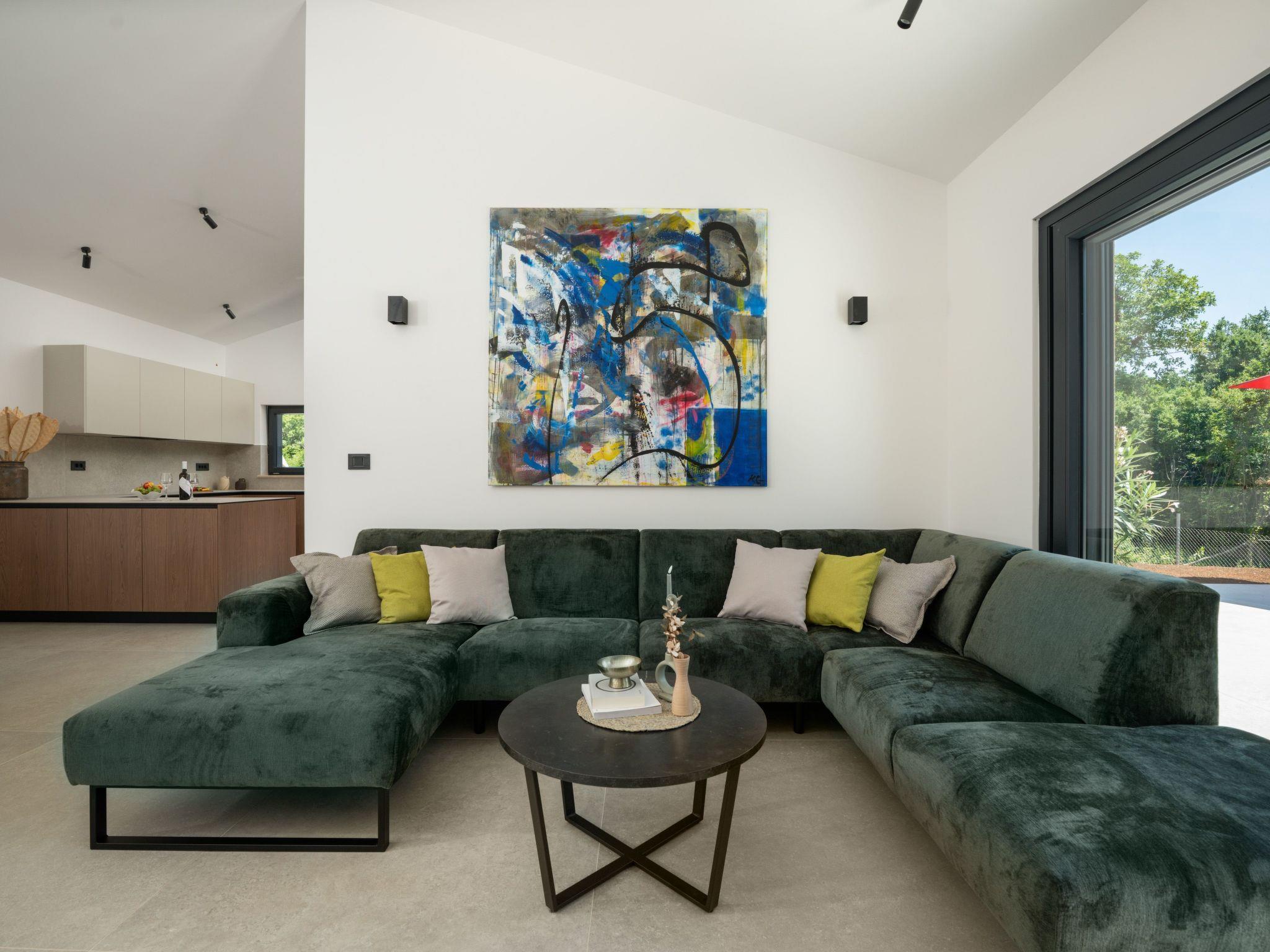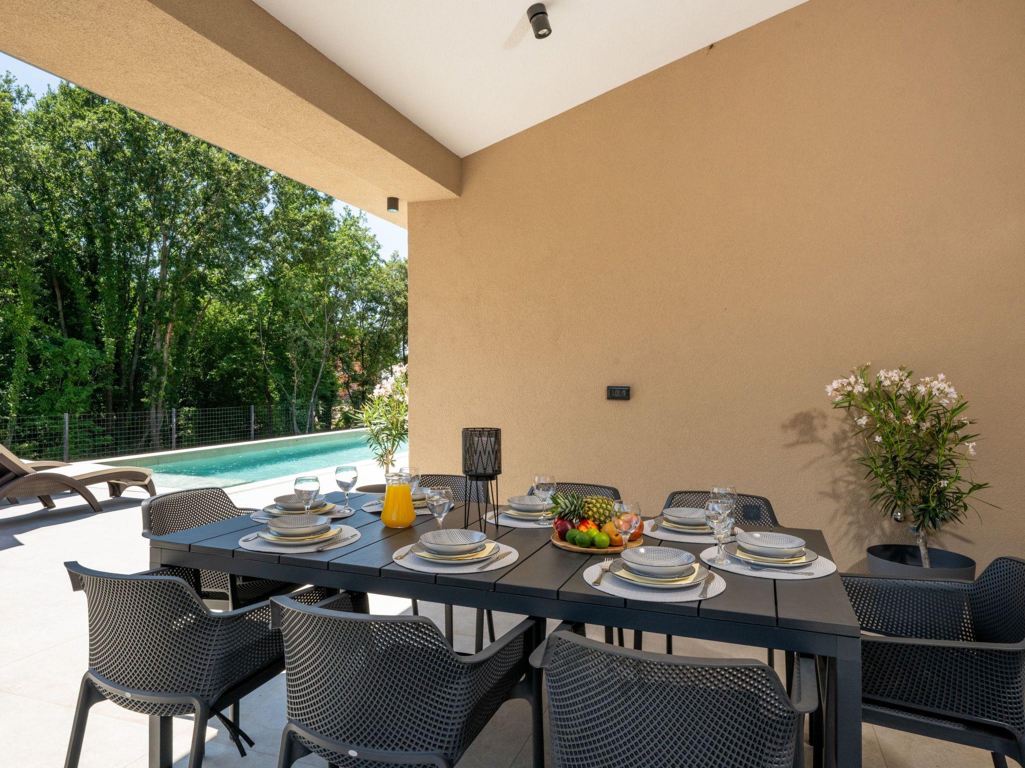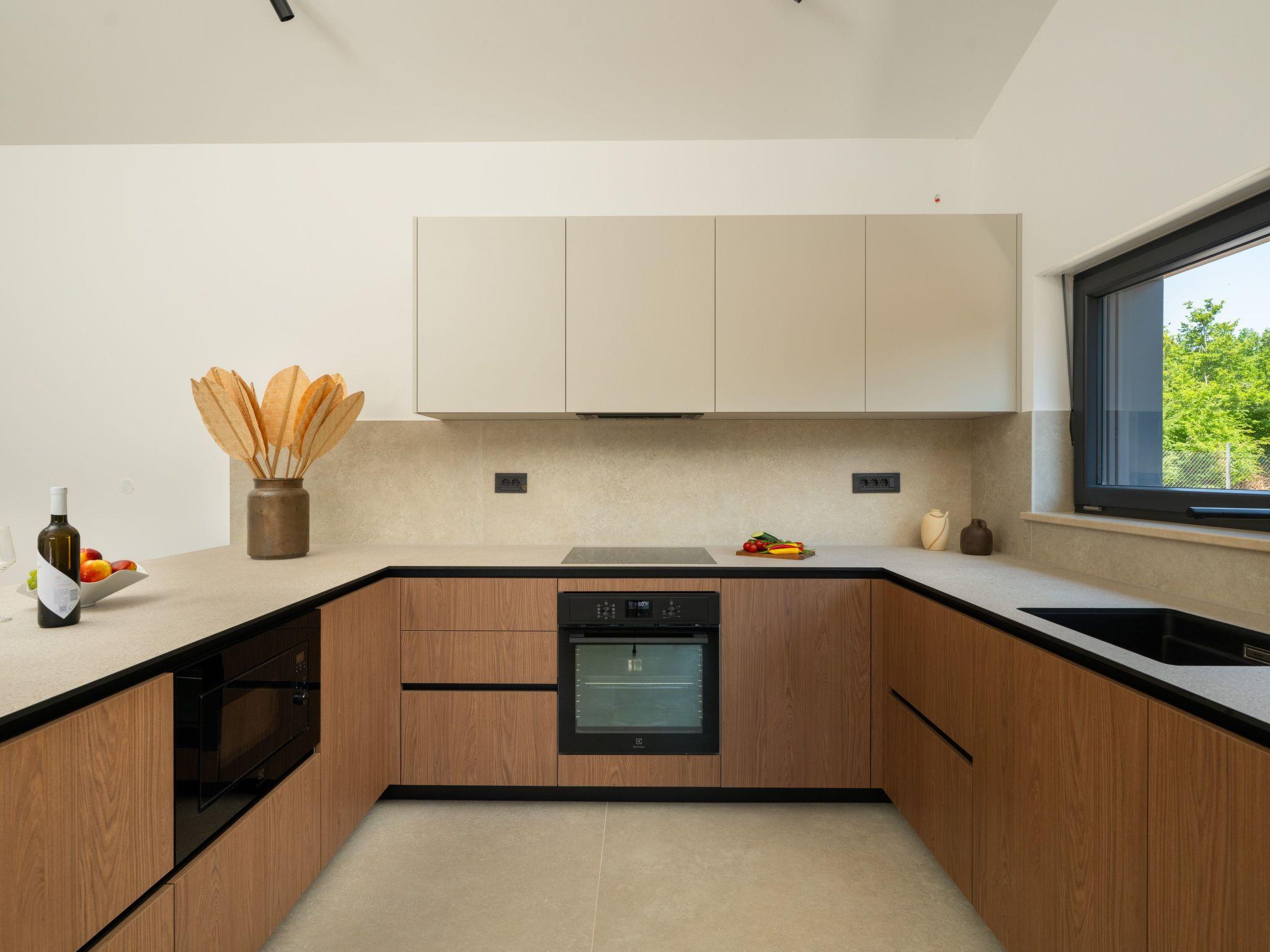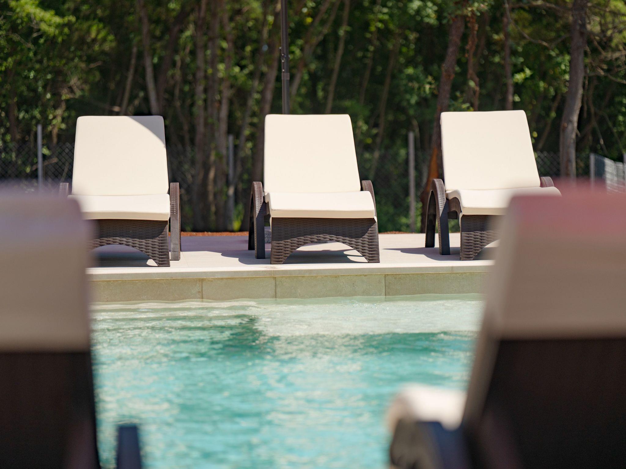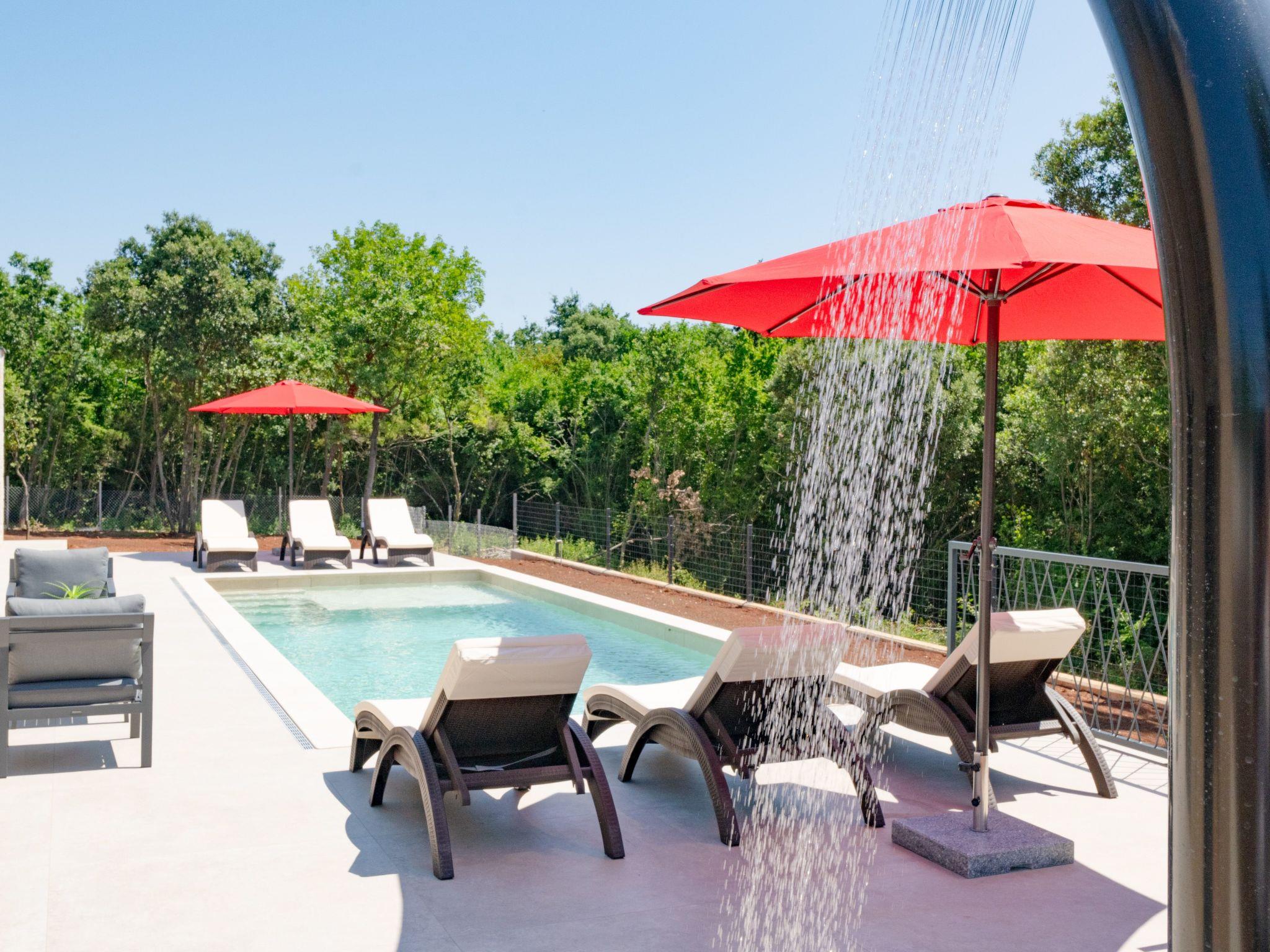 This comfortable villa is located in a quiet part of the village Peruški, surrounded by forest on two sides. It has 3 bedrooms – one is a master with its own bathroom, and there's also a second shared bathroom. The main area is a spacious open-plan kitchen, dining room, and living room, perfect for spending time together. The kitchen opens onto a covered terrace, great for outdoor meals. Outside, there's a large swimming pool, lounge area, fenced garden, outdoor grill, and private parking.