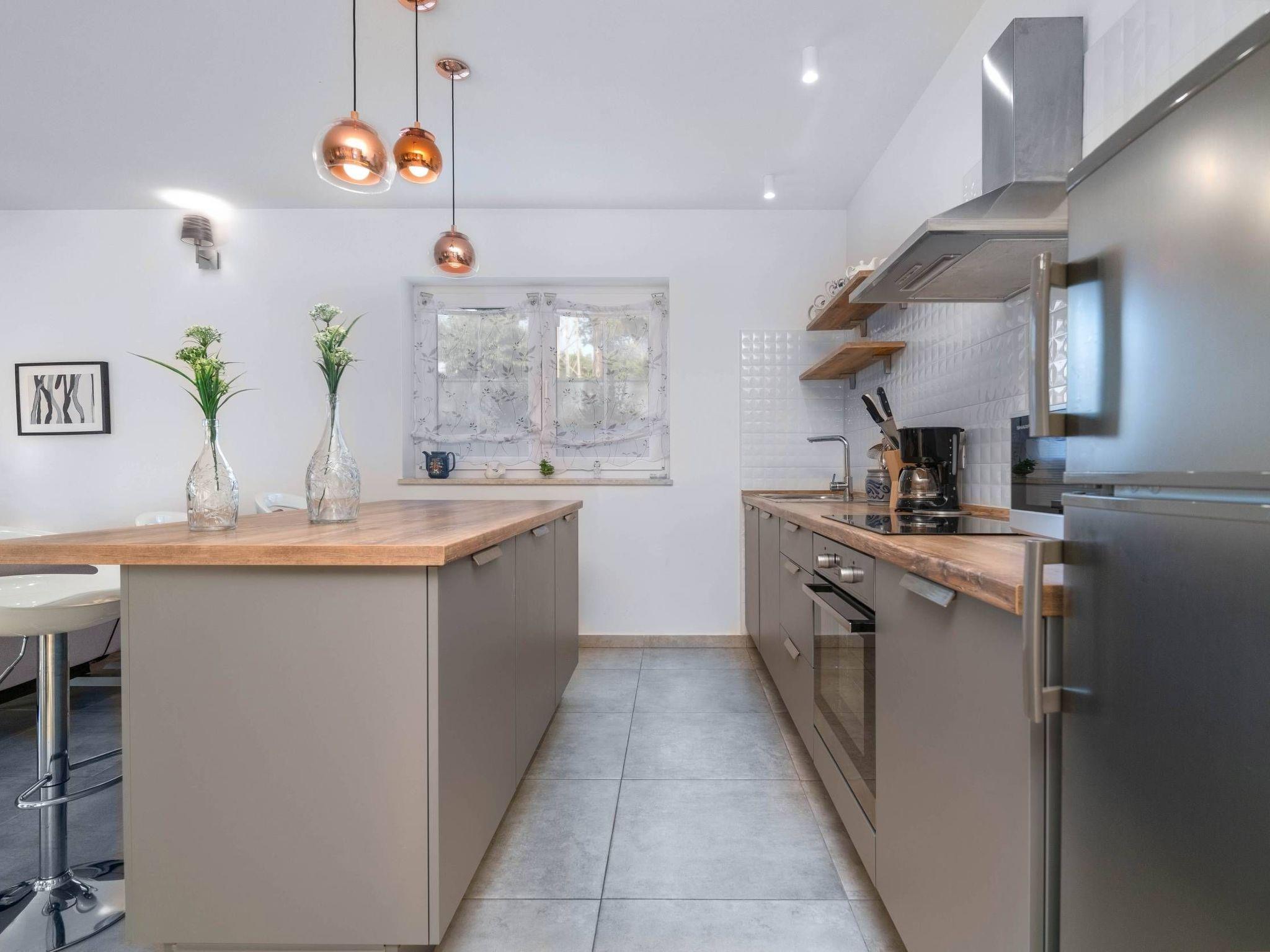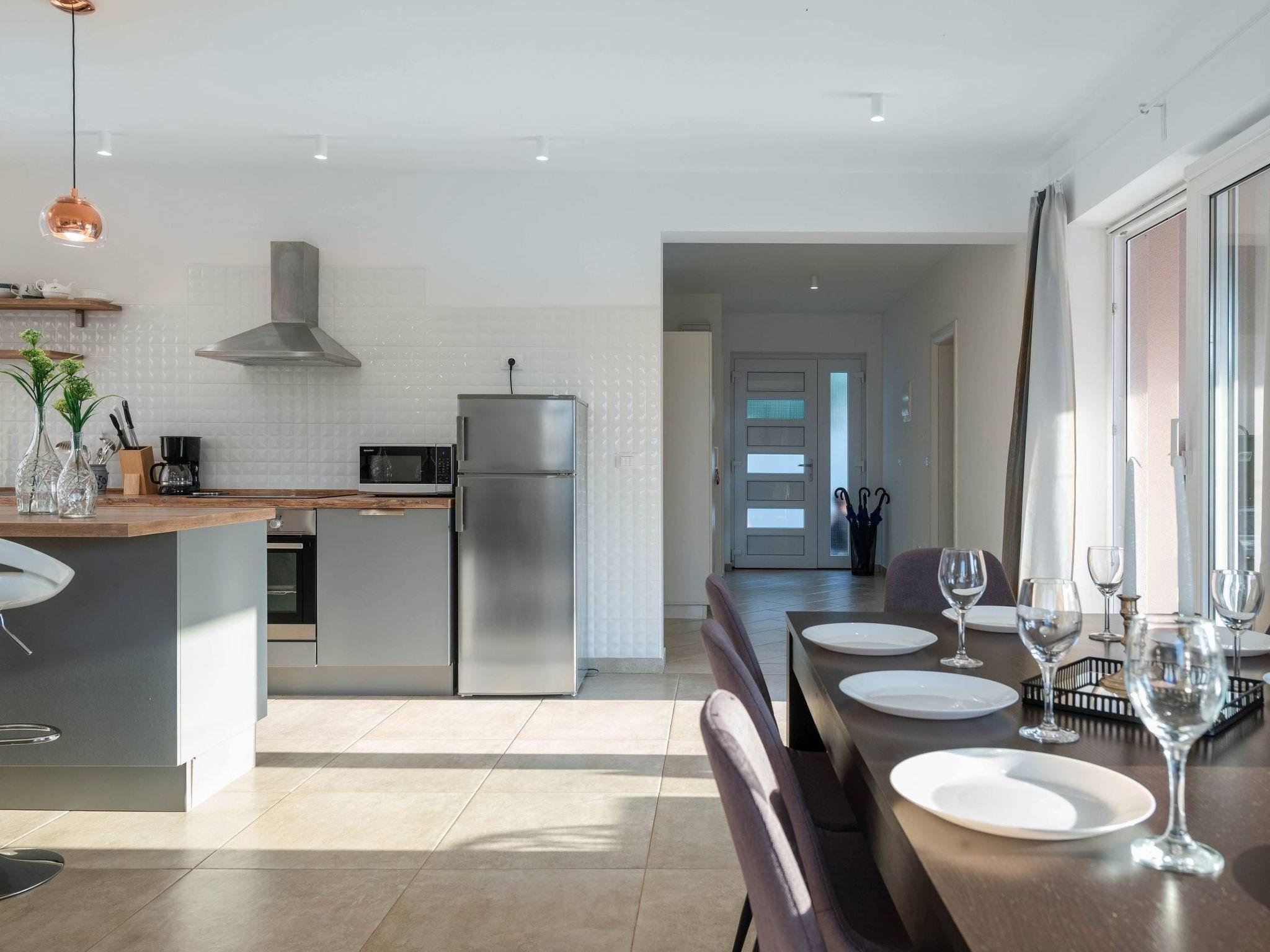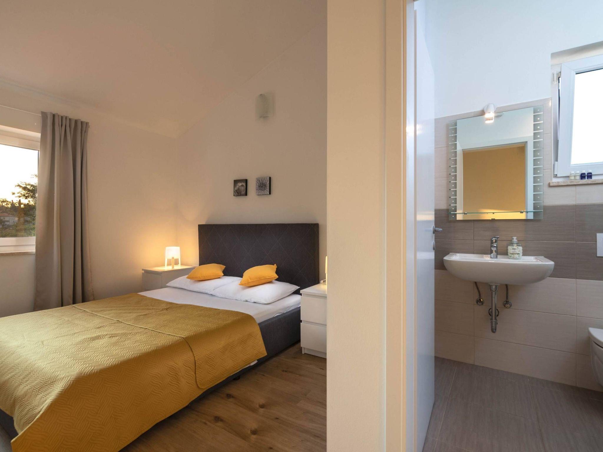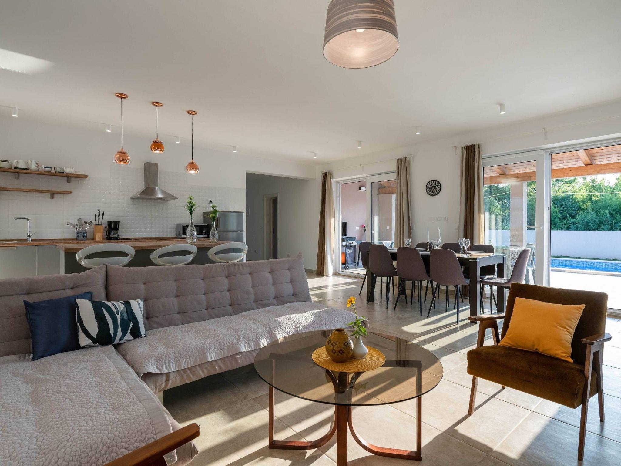 In the 4 bedrooms, there are spacious double beds, 3 of which are on the first floor and one on the ground floor. Each bedroom has its own Air Conditioning and private bathroom (toilets and walk-in showers), so the comfort and privacy of all the guests are on a high level. Inside the house, there will certainly be no crowds and lengthy toilet queues.The ground floor bedroom has its own exit to the terrace and pool, giving it a special charm and a movie atmosphere of comfort, especially on a sunny morning with coffee or tea. In addition to 4 bathrooms, there is also a small toilet on the ground floor in the hallway at the front door.On the ground floor, you have a well-equipped kitchen with a modern bar and 3 chairs. A dining space with a table and 8 chairs are located right next to the terrace. The comfortable corner set occupies the most space in the living room.The house is equipped with WiFi, SAT-TV, a washing machine, and 5 air-conditioning units: 1 in the living room + 1 in each of the 4 bedrooms.