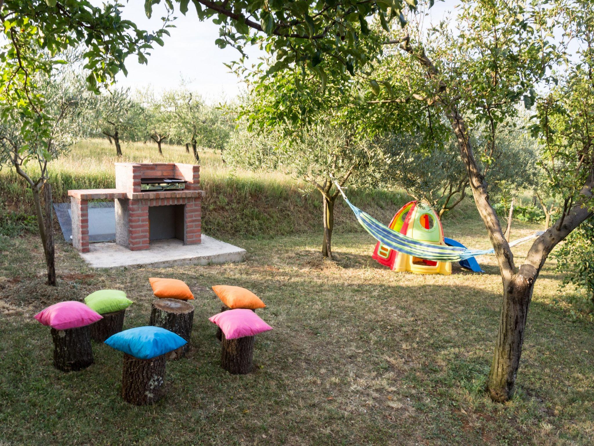 The completely detached three-bedroom house is surrounded by greenery, just outside the village of Sutivanac, only 20 kilometers from the beautiful pebble beaches on the east coast of Istria. The advantageous location allows you to discover a new beach every day or one of the lively coastal towns and to relax after an eventful day in the peace and privacy of your holiday home. Surrounded by green hills, valleys and fragrant Mediterranean plant splendor with vast fields and vineyards, rest for body and soul is guaranteed here. The 1,500 m² plot with olive grove, fruit trees and playground is at your disposal for sole use. And those who would like to be actively involved in the invigorating sea air can find countless hiking and biking trails as well as jogging paths right on their doorstep.