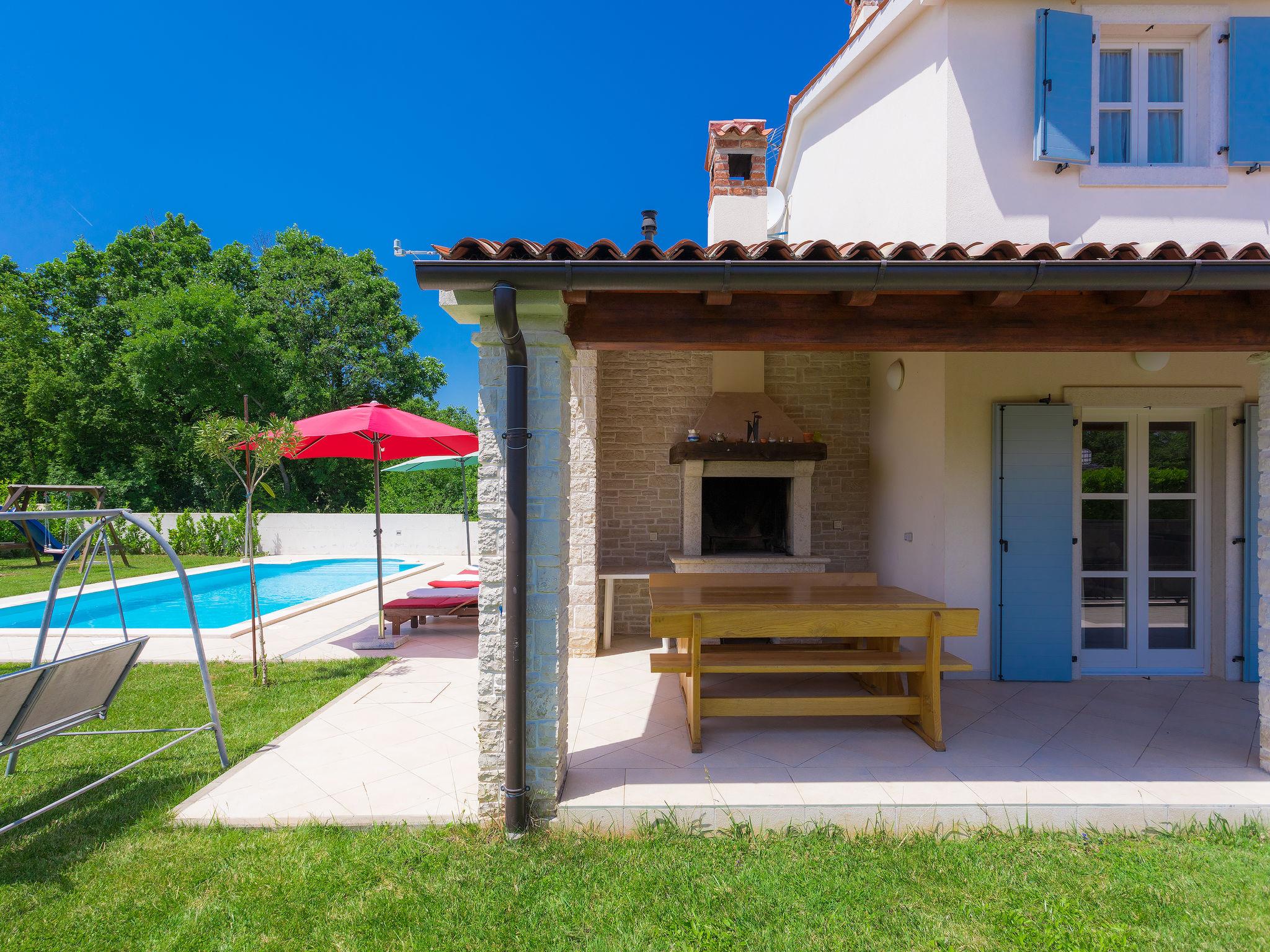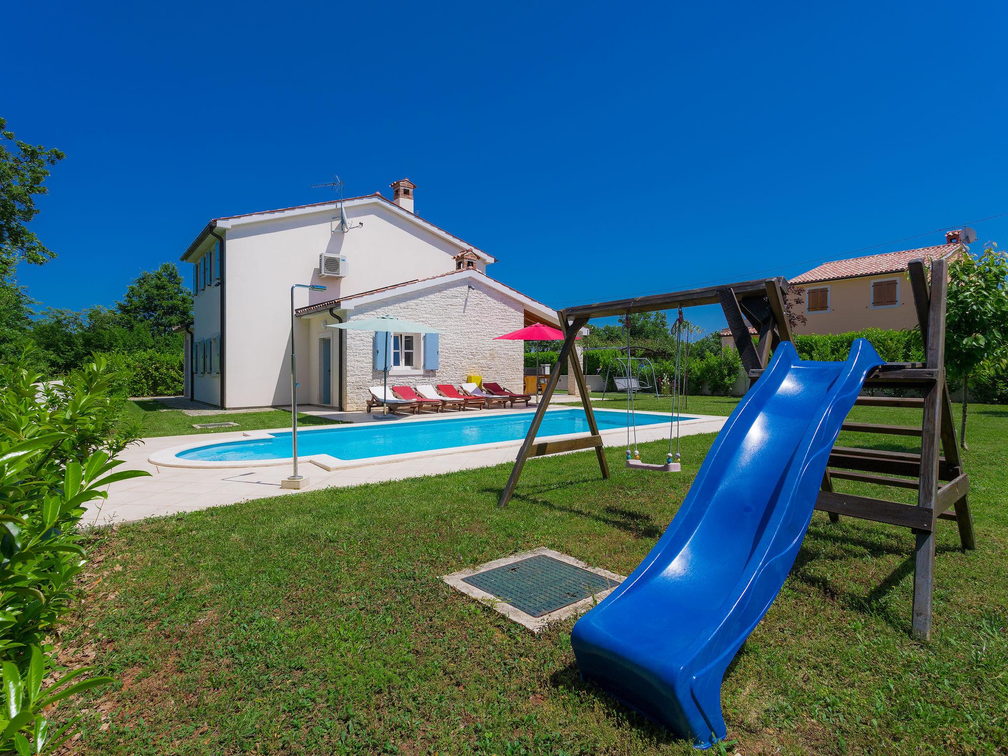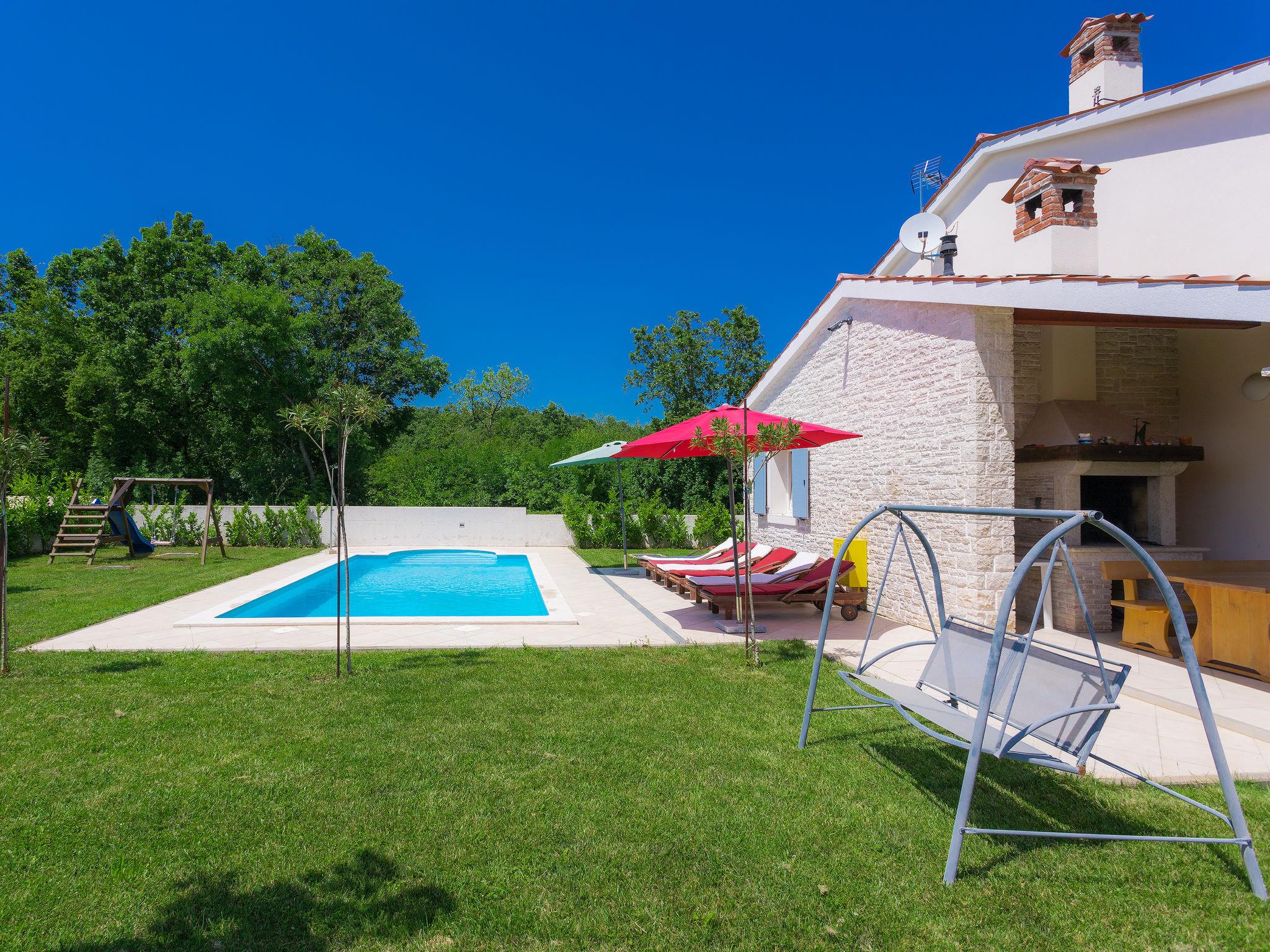Krnica 22 km from Pula: Villa "Azura", 2 storeys. In the hamlet Hreljici 8 km from the centre of Marcana, 18 km from the centre of Pula, in a sunny position, 6 km from the sea, 6 km from the beach. Private: property 750 m2 (fenced), beautiful, well-kept garden with lawn, swimming pool angular (8 x 4 m, 32 m2, depth 140 cm, seasonal availability: 01.May. - 26.Oct.). Outdoor shower, garden furniture, barbecue (slide, swing). In the house: internet access, air conditioning, washing machine. Parking (for 4 cars) at the house on the premises. Shop 3 km, restaurant 500 m, bus stop 550 m, pebble beach 6 km, rocky beach 6 km. Riding stable 3 km, walking paths from the house 1 km, cycle lane 1 km.