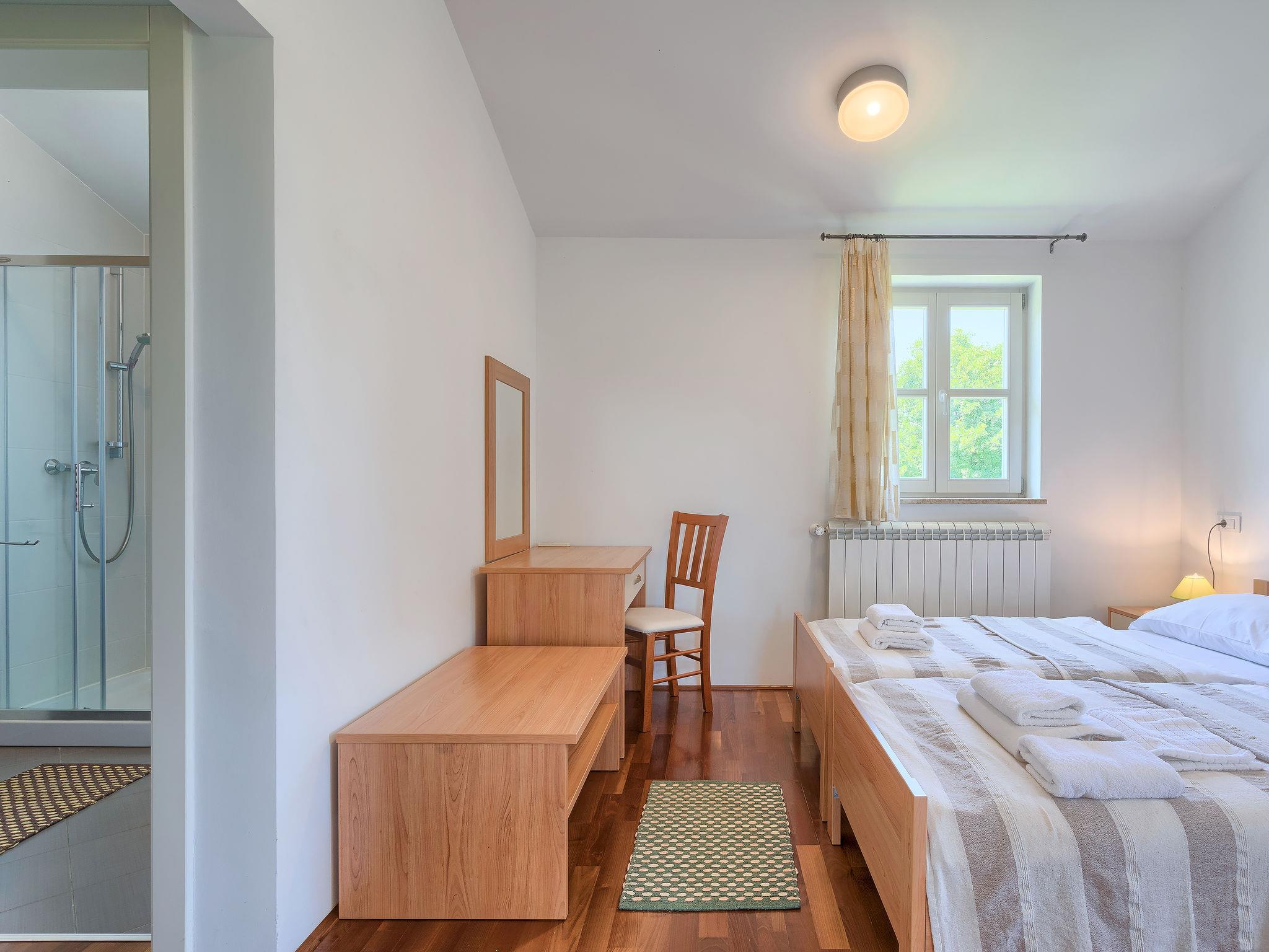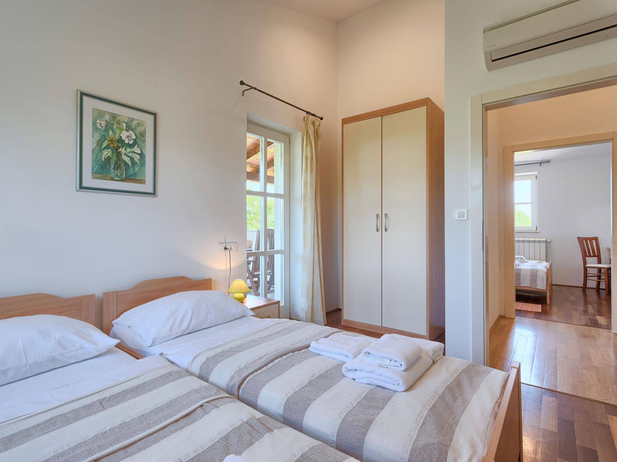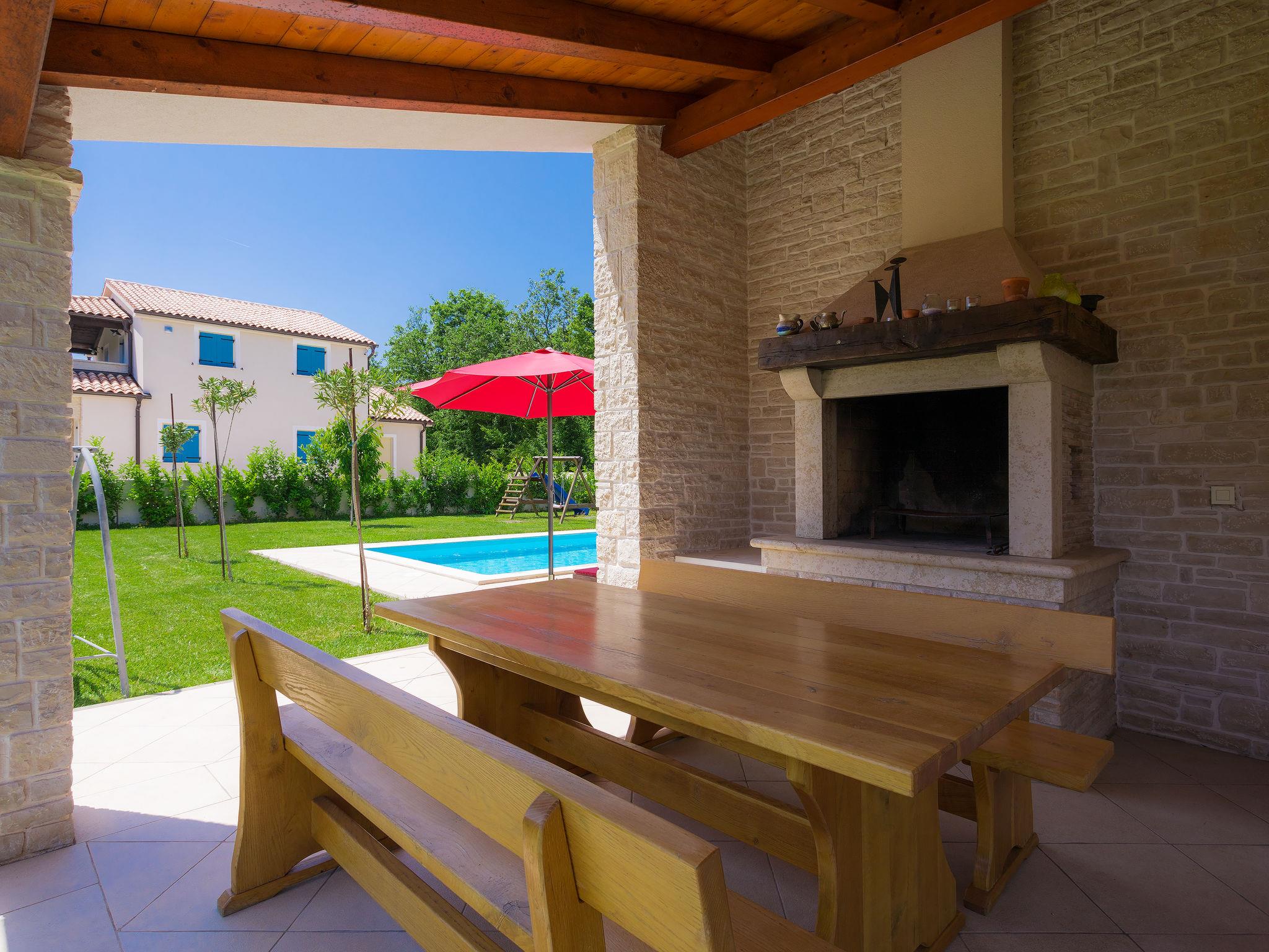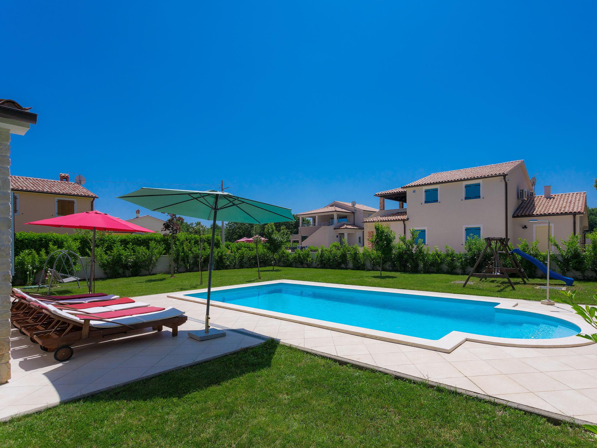 Krnica 22 km from Pula: Villa "Azura", 2 storeys. In the hamlet Hreljici 8 km from the centre of Marcana, 18 km from the centre of Pula, in a sunny position, 6 km from the sea, 6 km from the beach. Private: property 750 m2 (fenced), beautiful, well-kept garden with lawn, swimming pool angular (8 x 4 m, 32 m2, depth 140 cm, seasonal availability: 01.May. - 26.Oct.). Outdoor shower, garden furniture, barbecue (slide, swing). In the house: internet access, air conditioning, washing machine. Parking (for 4 cars) at the house on the premises. Shop 3 km, restaurant 500 m, bus stop 550 m, pebble beach 6 km, rocky beach 6 km. Riding stable 3 km, walking paths from the house 1 km, cycle lane 1 km.