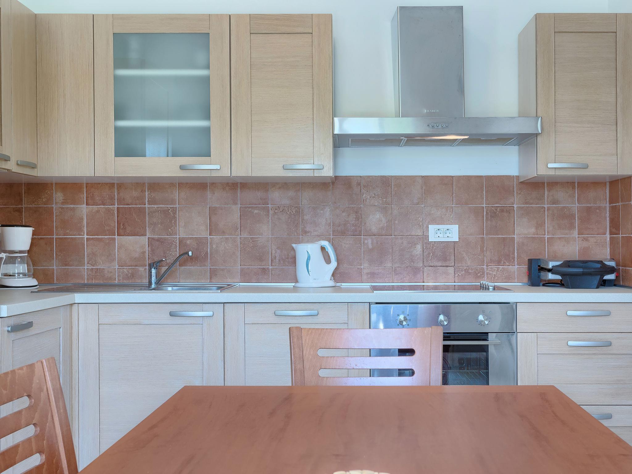 4-room villa 165 m2 on 2 levels. Living/dining room with 1 double sofabed (140 cm, length 190 cm), open-hearth fireplace (only for decoration), satellite TV (flat screen). Exit to the terrace. 1 room with 1 double bed (2 x 80 cm, length 200 cm), shower/WC. Open kitchen (oven, dishwasher, 4 ceramic glass hob hotplates, toaster, kettle, freezer, electric coffee machine). Sep. WC. Forced-air heating. Upper floor: 1 room with 2 beds (80 cm, length 200 cm), shower/WC. Exit to the terrace. 1 room with 2 beds (80 cm, length 200 cm), shower/WC. Terrace 15 m2, roofed, terrace 20 m2, roofed. Terrace furniture, deck chairs. View of the swimming pool, the garden and the forest. Facilities: safe, children's high chair, baby cot, hair dryer. Internet (WiFi, free). Please note: non-smoking house. Maximum 3 pets/ dogs allowed.