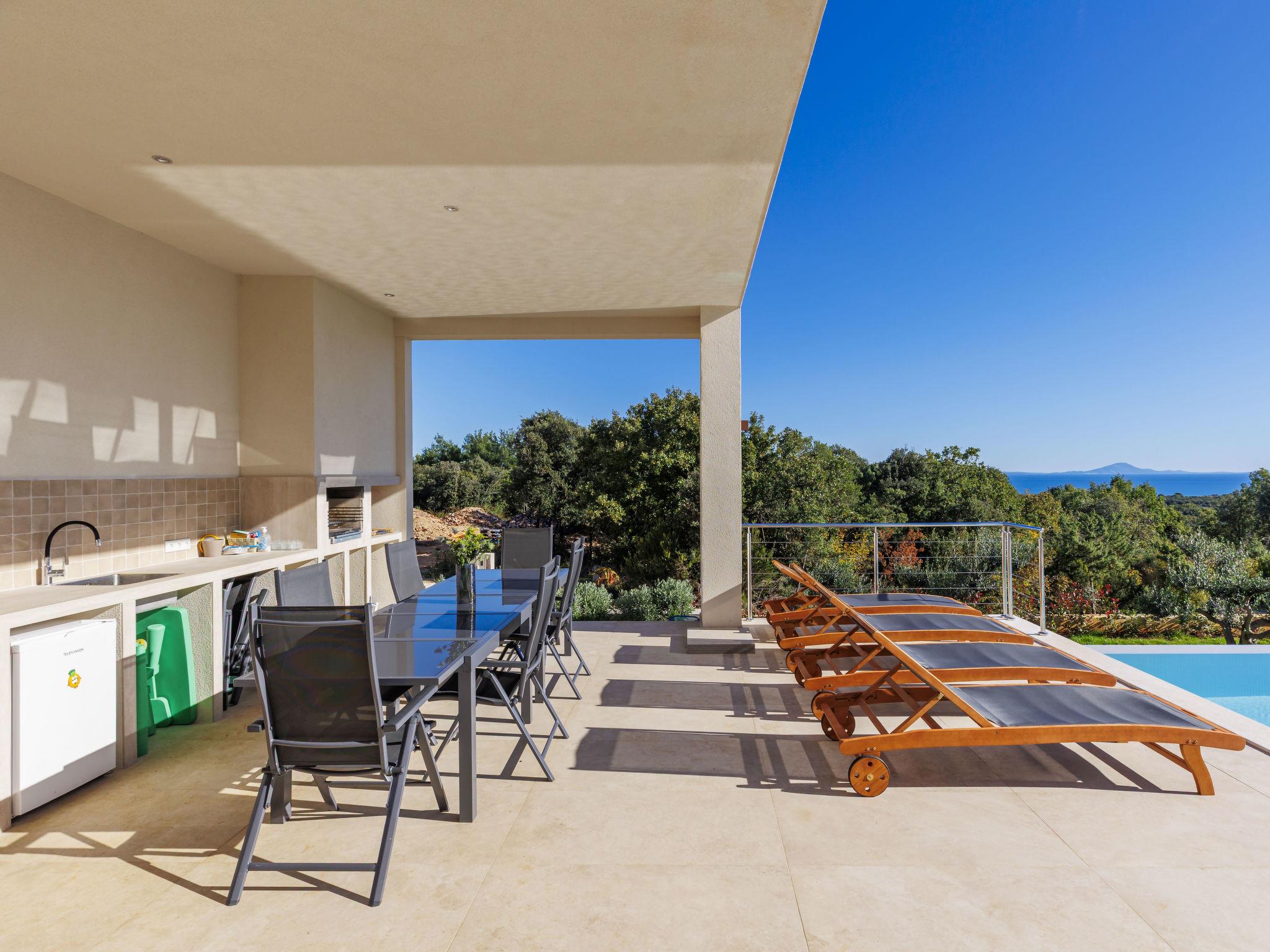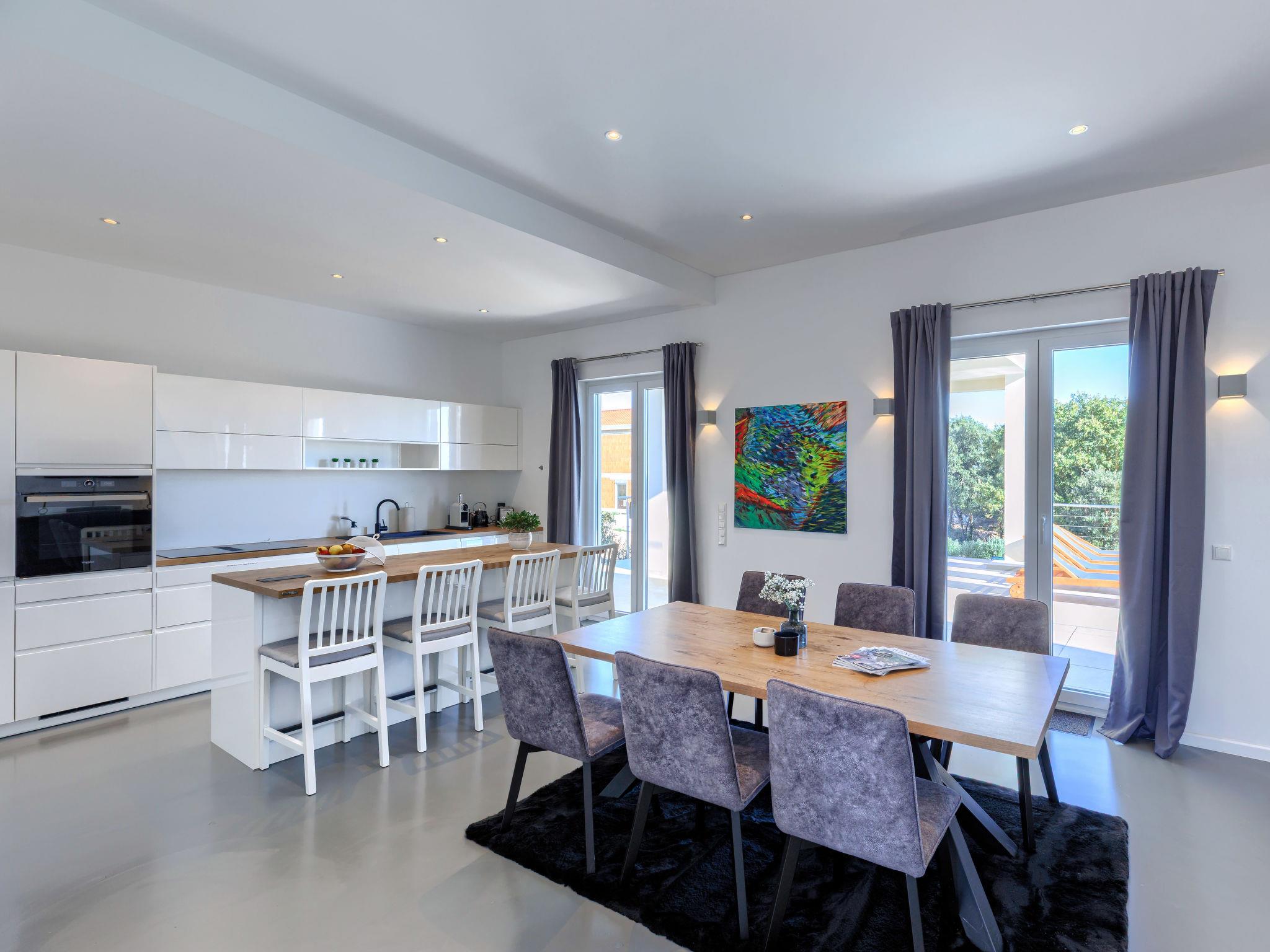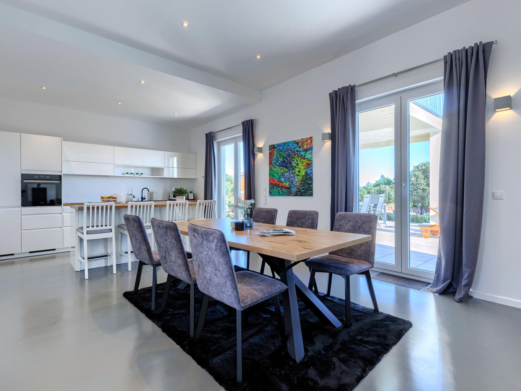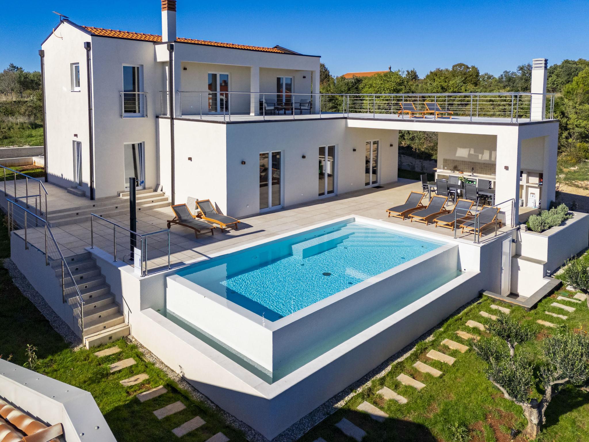 Very beautiful villa "Cappenberg", 2 storeys, built in 2025. 1 km from the centre of Peruški, 8 km from the centre of Marcana, 20 km from the centre of Pula, in an elevated position, 700 m from the sea, 700 m from the beach. Private: property 730 m2, swimming pool angular, heated (8 x 4 m, 32 m2, depth 140 cm, seasonal availability: 01.Mar. - 01.Dec.) with internal staircase and salt-electrolysis pool-cleaning system. Outdoor shower, hot tub, terrace (75 m2), garden furniture, barbecue. In the house: internet access, sauna, table tennis, roof terrace, washing machine, tumble dryer. Parking (for 3 cars) at the house on the premises. E-charging station. Shop 1.5 km, bus stop 7.5 km, pebble beach 3 km, rocky beach 700 m. Groups of teenagers on request only. Heated swimming pool. It is necessary to notify us 7 days in advance if you wish to have the pool heating turned on.
