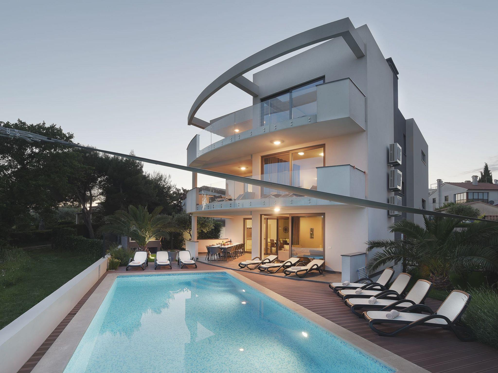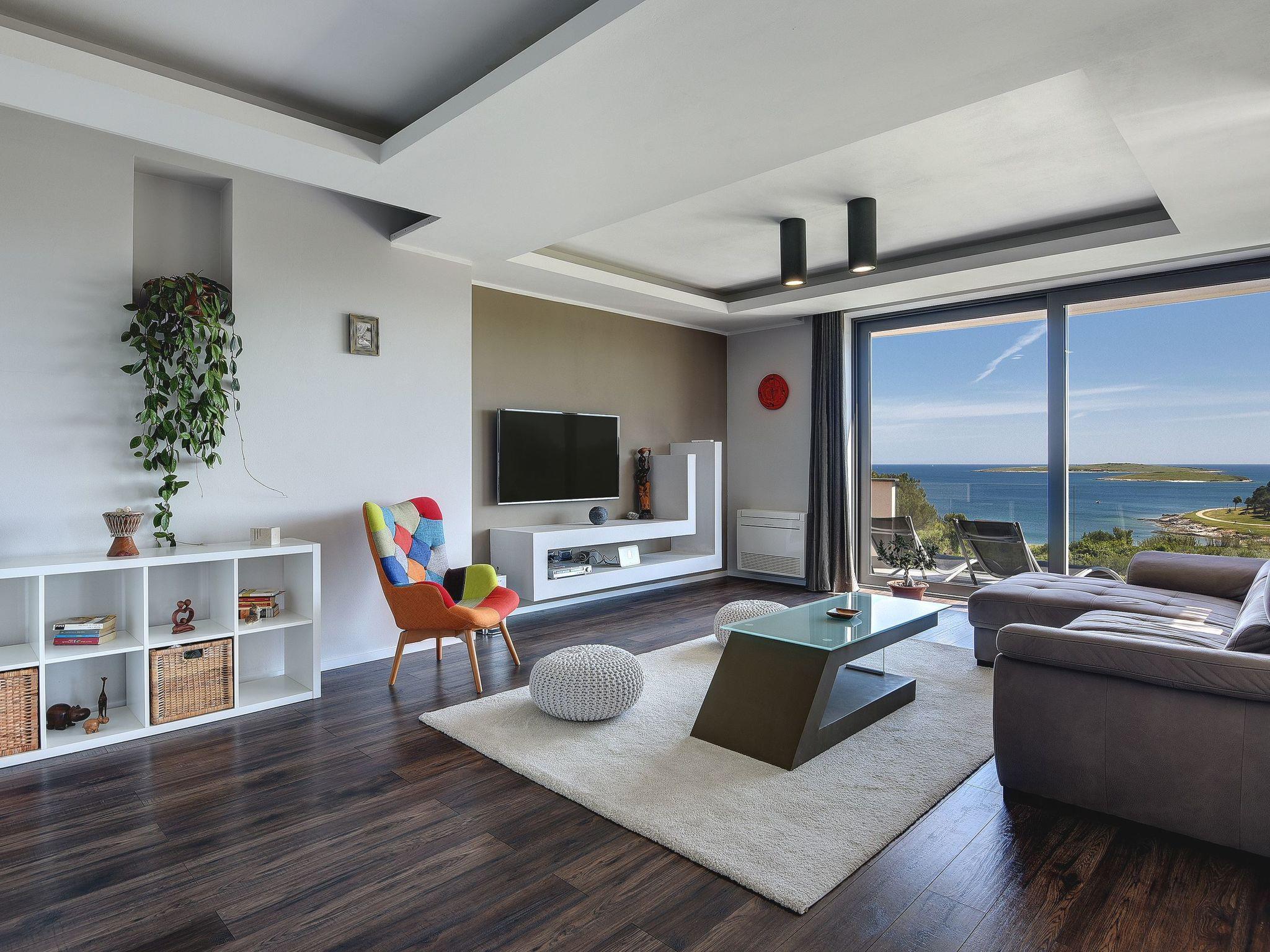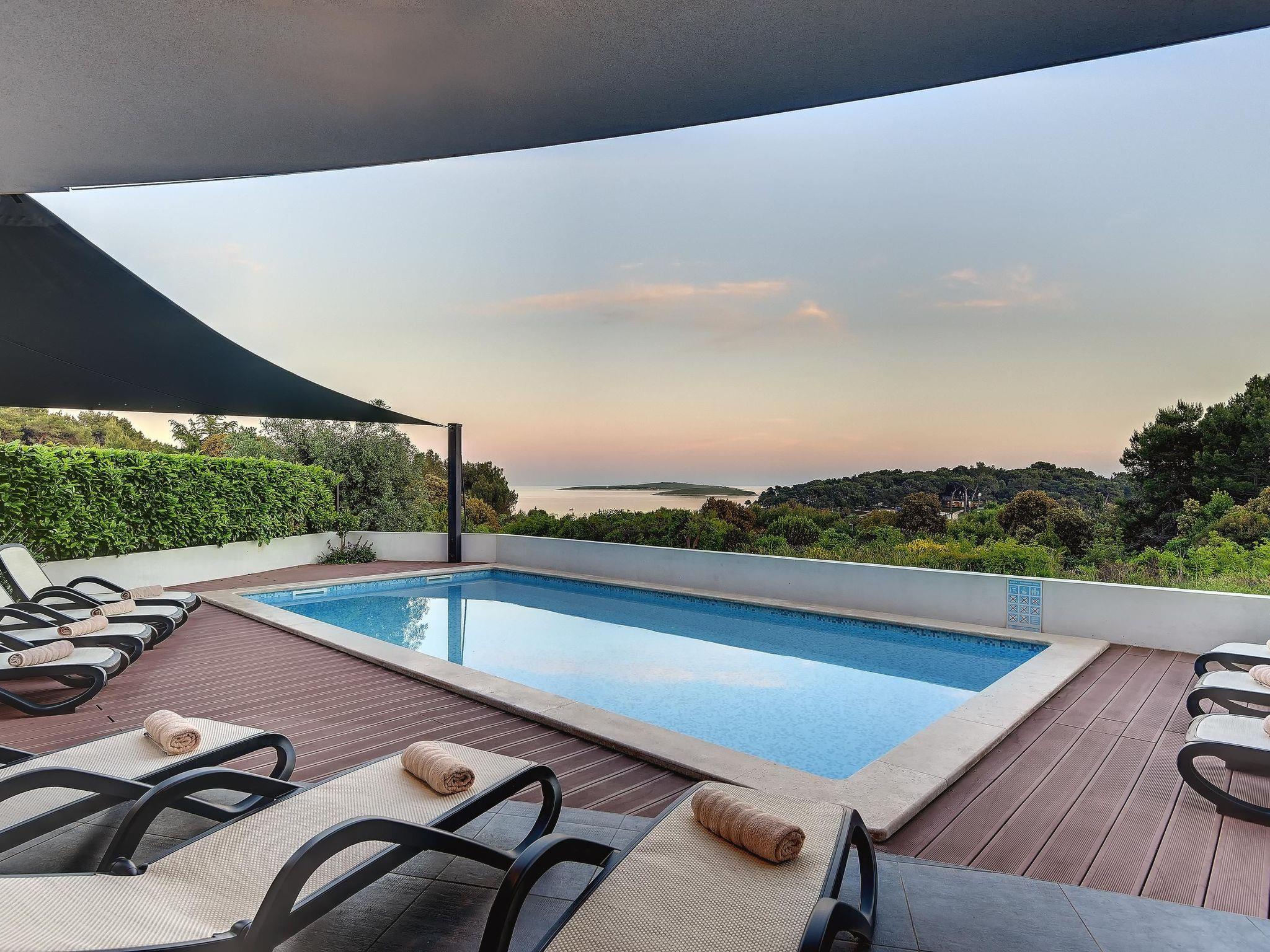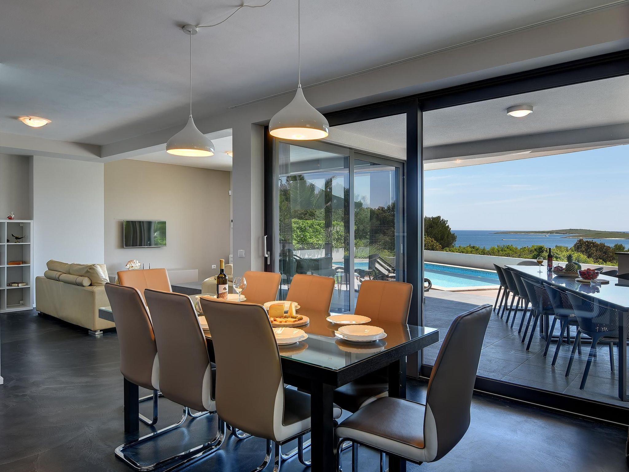 The pool (8 x 4m) in the outdoor area has a sea view on all sides. Enjoy life on the terrace, in the sun on your garden chairs or the loungers, and make yourselves comfortable. Enjoy the unique front line sea views of the protected natural landscape Kamenjak with the bays. The pool area is surrounded by a garden with olive and palm trees. A barbecue is also available. In front of the house there is private parking for six cars.