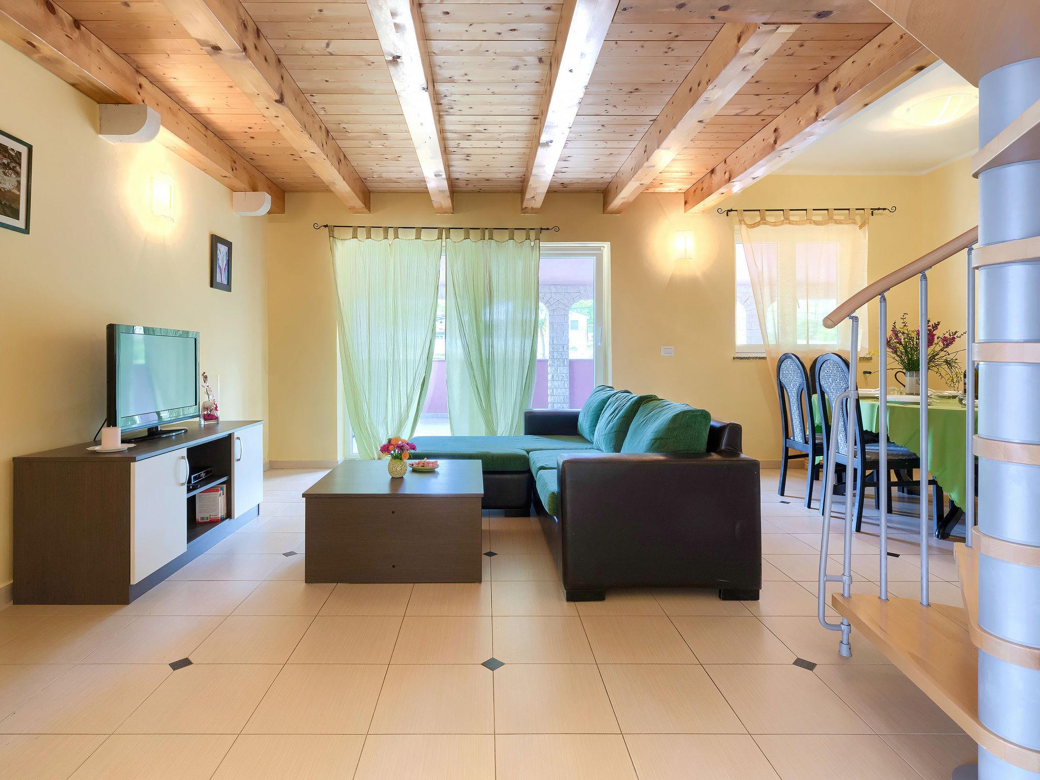 6-room semi-detached house 180 m2 on 2 levels on 1st floor. Beautiful and tasteful furnishings: living/dining room 30 m2 with satellite TV and air conditioning. Exit to the terrace. Open gallery with 2 beds (80 cm, length 200 cm). 1 room with 1 double bed (2 x 80 cm, length 200 cm). Entrance hall with air conditioning. Living/dining room with 1 double sofabed, kitchen corner, satellite TV and air conditioning. Exit to the terrace. 2 rooms, each room with 1 double bed (2 x 80 cm, length 200 cm). Open kitchen (4 hot plates, oven, dishwasher, microwave, freezer). 2 showers/WC. Upper floor: entrance hall with air conditioning. 1 room with 1 double bed (2 x 80 cm, length 200 cm), shower/WC. Terrace 50 m2, roofed. Terrace furniture. View of the swimming pool. Facilities: washing machine, baby cot. Internet (WiFi, free).