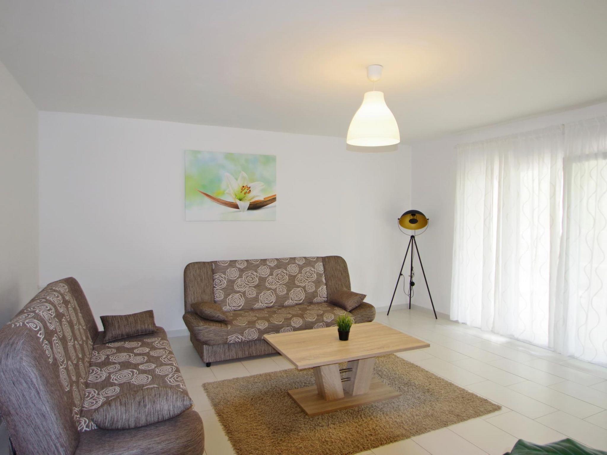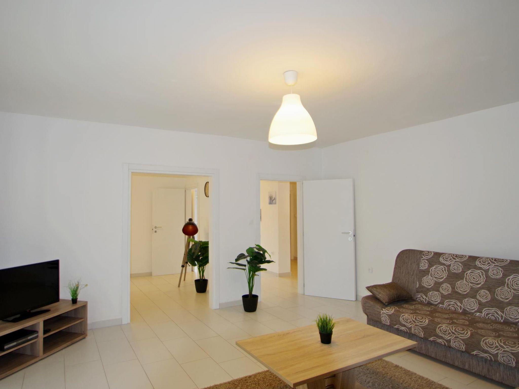 -living room with 2 couches ( each can become a sleeping couch) with exit to the balcony, baby cot on disposal