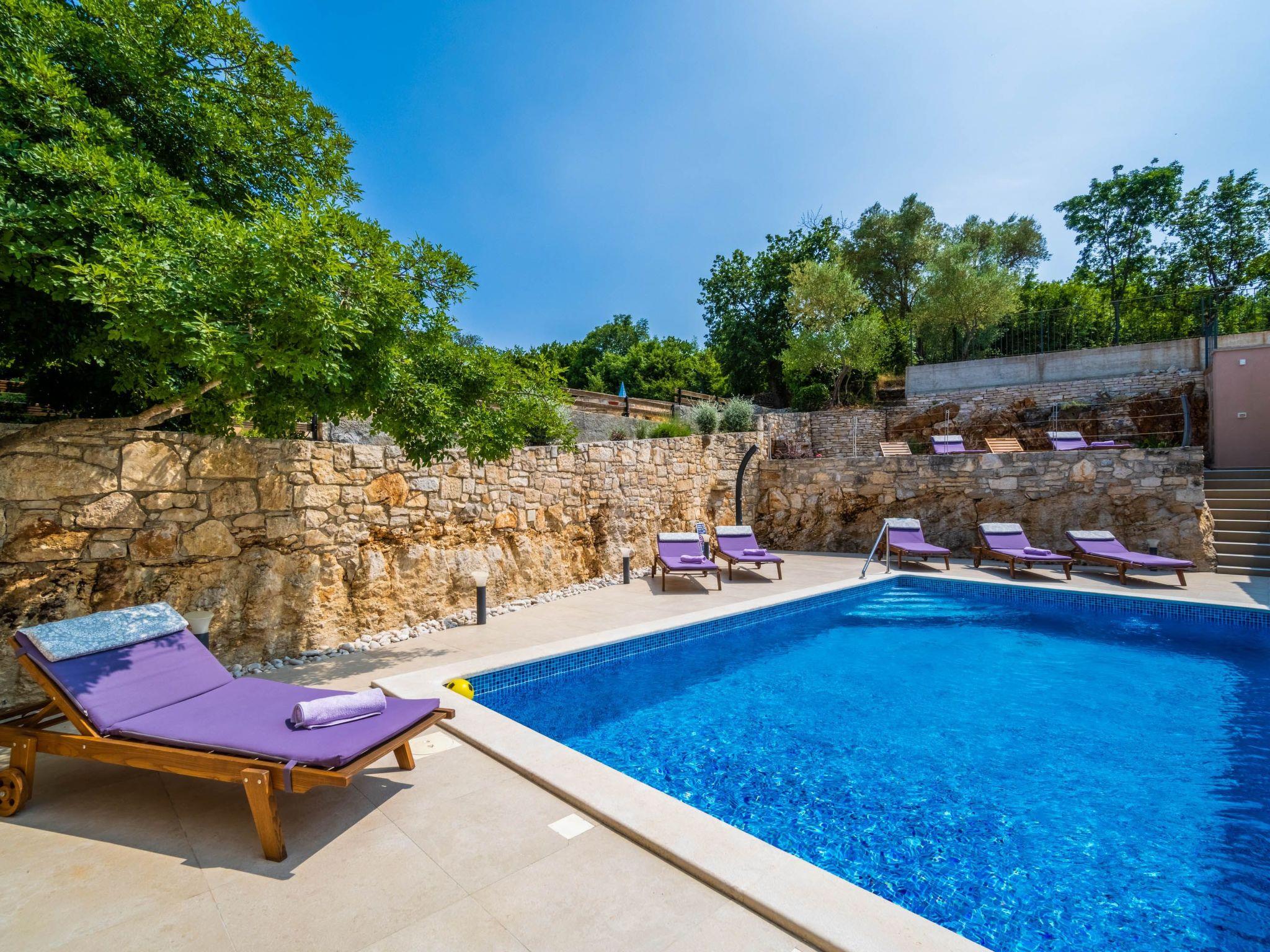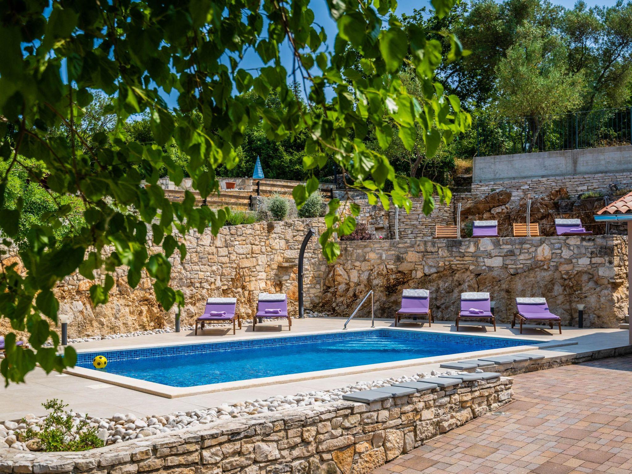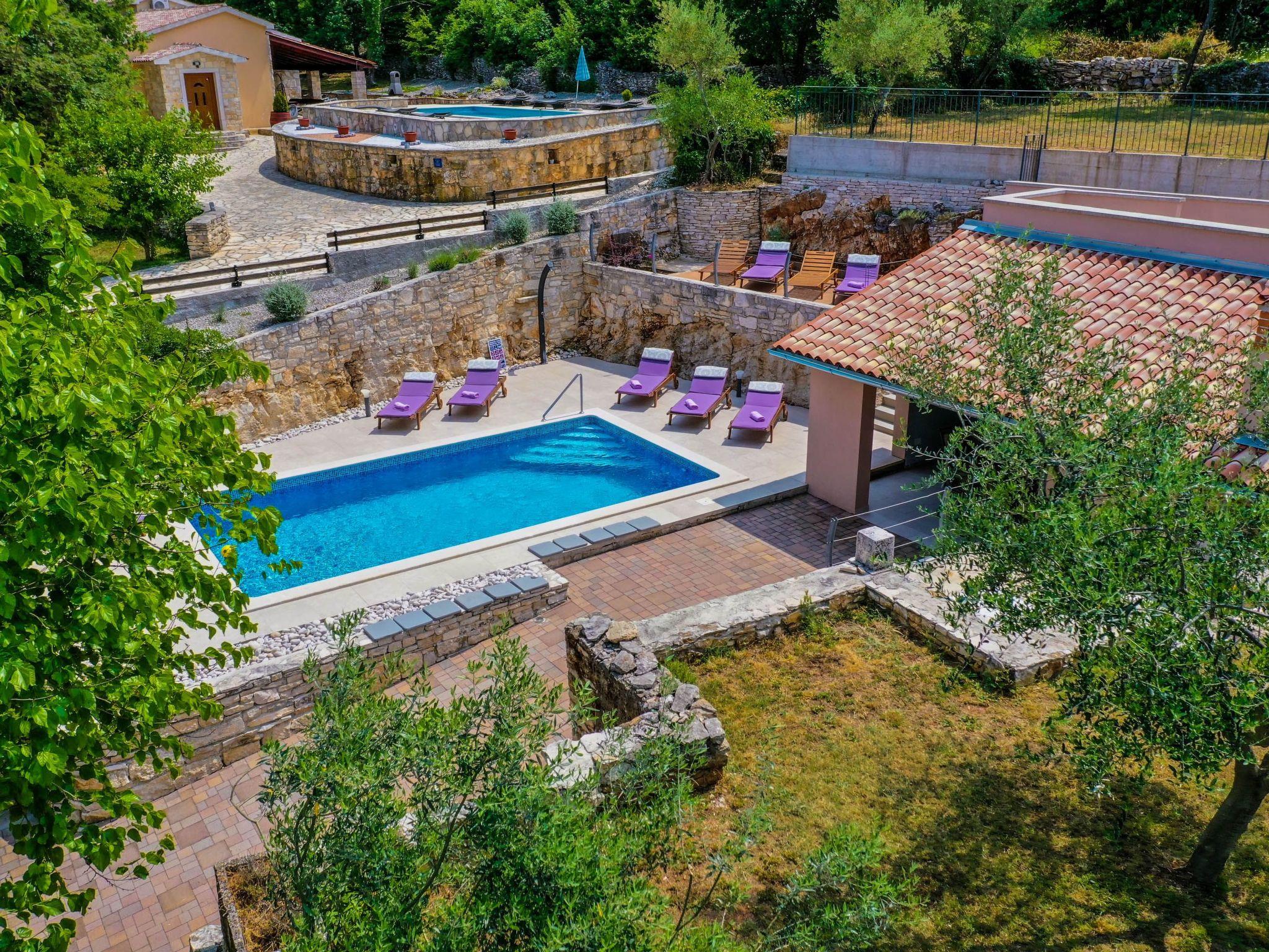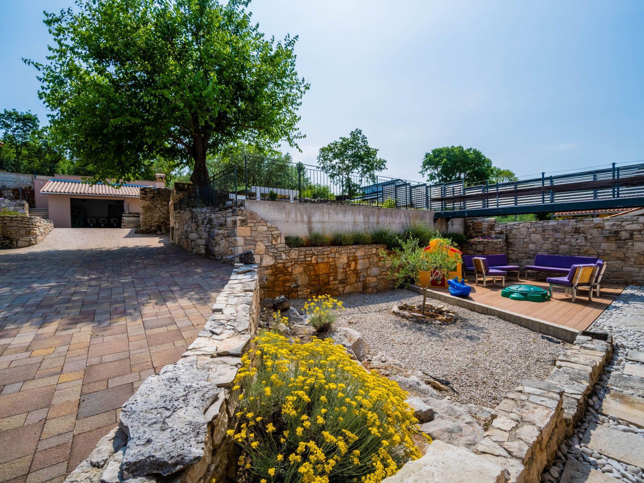 Exterior : 943 m2 of fenced garden: swimming pool 32 m2, sun beds (x10), sun umbrella, garden furniture, grill, parking space, 2 terraces (45m2), panoramic view on mountain Ucka