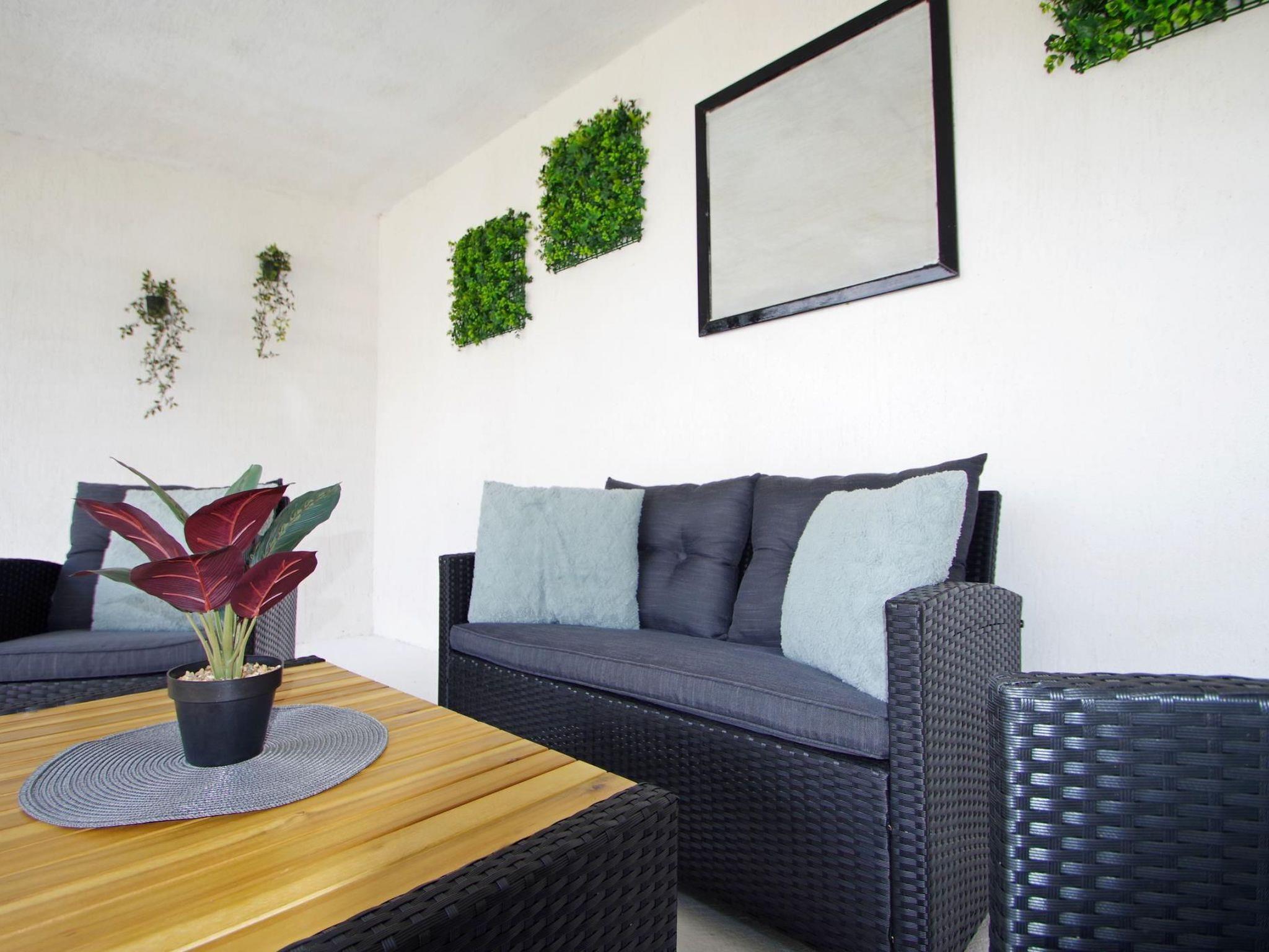 Living room with 2 couches ( each can become a sleeping couch) with exit to the big terrace, dinning area, kitchen ( 4 cooking rings: 3 gas + 1 electrical, coffee machine, refrigerator with freezing section, oven, air- extractor), bathroom ( shower, wash basin, wc, washing machine ) balcony with sitting furniture.