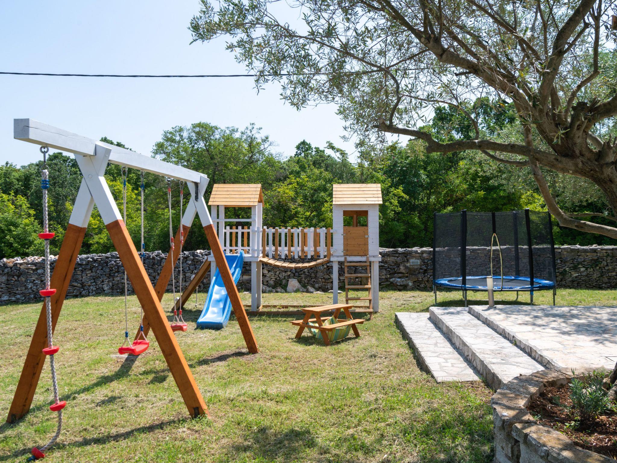 Charming semi – detached holiday house is located on the green spot at the end of the quiet village of Rakalj. The villa is surrounded by a spacious (2000m2) fenced garden with carefully maintained lawn and private swimming pool (27m2). House has been completely renovated where special attention is devoted to the preservation of traditional Istrian architecture and original interior design. Because of its position, the house offers complete peace and a relaxing atmosphere. Swings, playground and trampoline are on disposal for the recreation. Outdoor space provides guests privacy and children security. It is perfect for get - together, barbecue parties or just relaxed book reading. Guests can enjoy leisure time on the covered shaded terrace. Pebble and rocky beach is only 1 km distance ( possible to go only by foot) walking distance. Beach reachable with car is at 2,5 km distance.