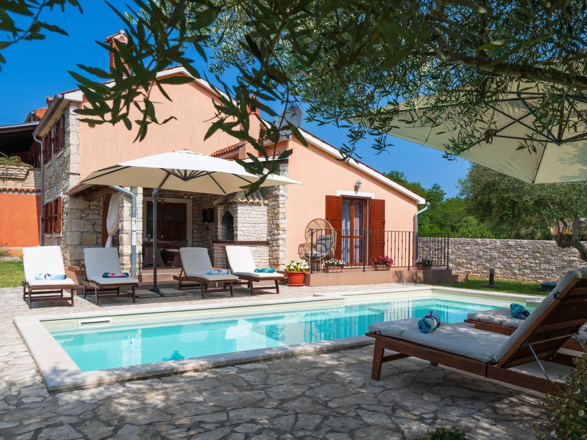 Facilities: private pool ( 27m2), air condition on both floors, Wi-Fi, parking, grill, children playground ( swings and trampoline) outdoor shower, sun beds and sun umbrellas by the swimming pool, baby cot.