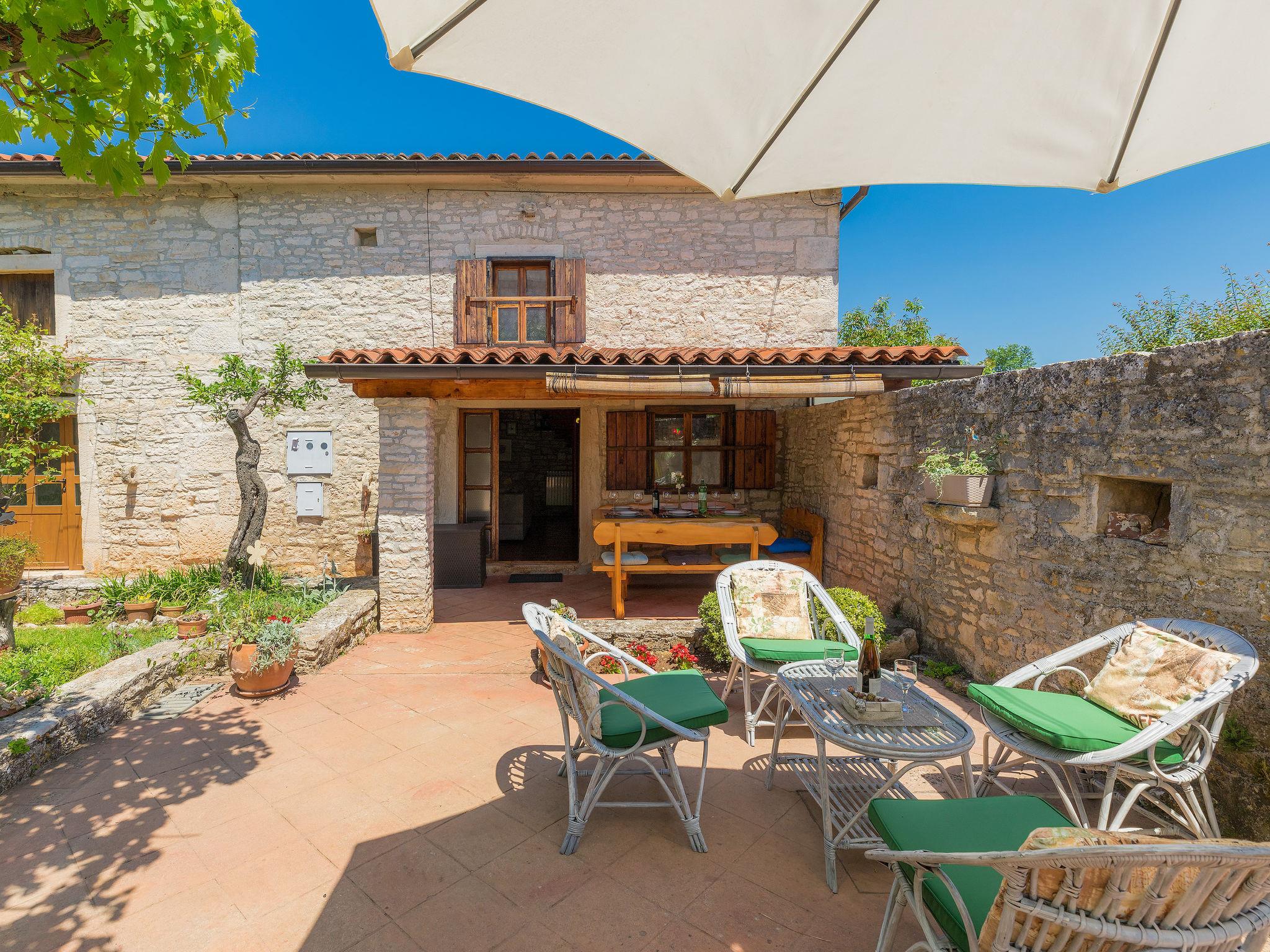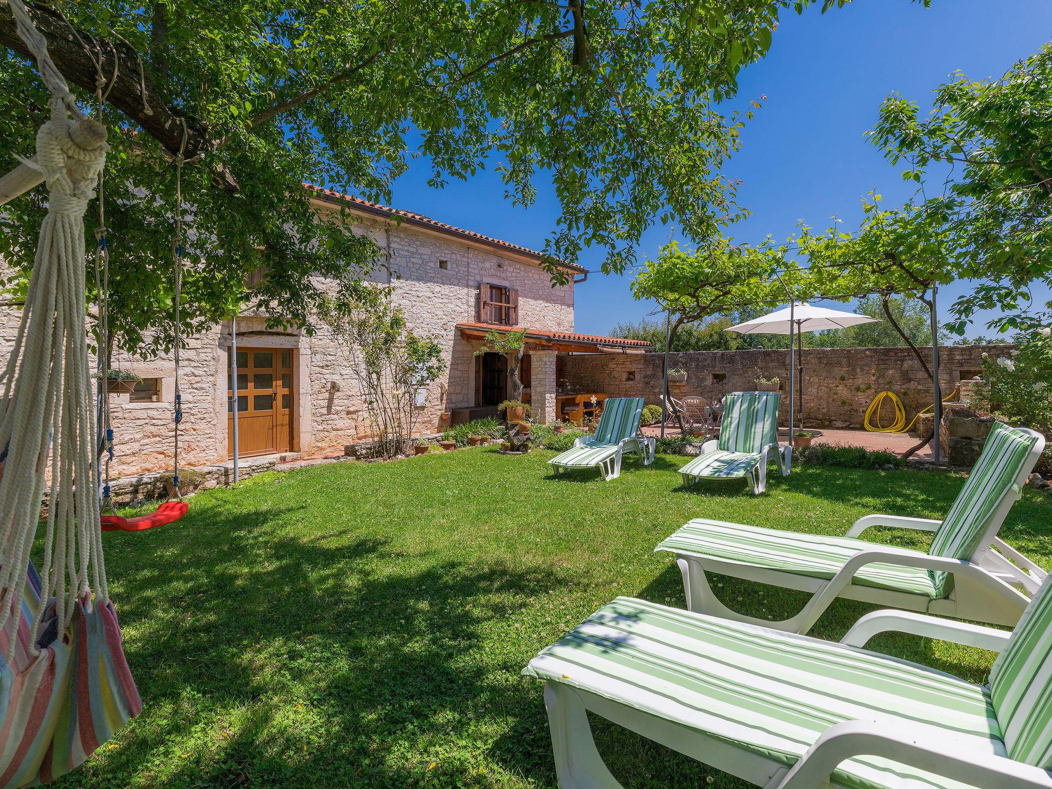 Single-family house "Toni", 2 storeys. In the hamlet Butkovici 7 km from the centre of Vodnjan, 12 km from the sea. Private: property 500 m2 (fenced), lawn and trees, swimming pool angular (5 x 4 m, depth 130 cm, seasonal availability: 04.May. - 05.Oct.). Outdoor shower, terrace (20 m2), garden furniture, barbecue. In the house: internet access, washing machine. Parking (for 2 cars) on the premises. Shop 1.5 km, bus stop 120 m, pebble beach 20 km, rocky beach 12 km. Part of the house is closed and unoccupied.