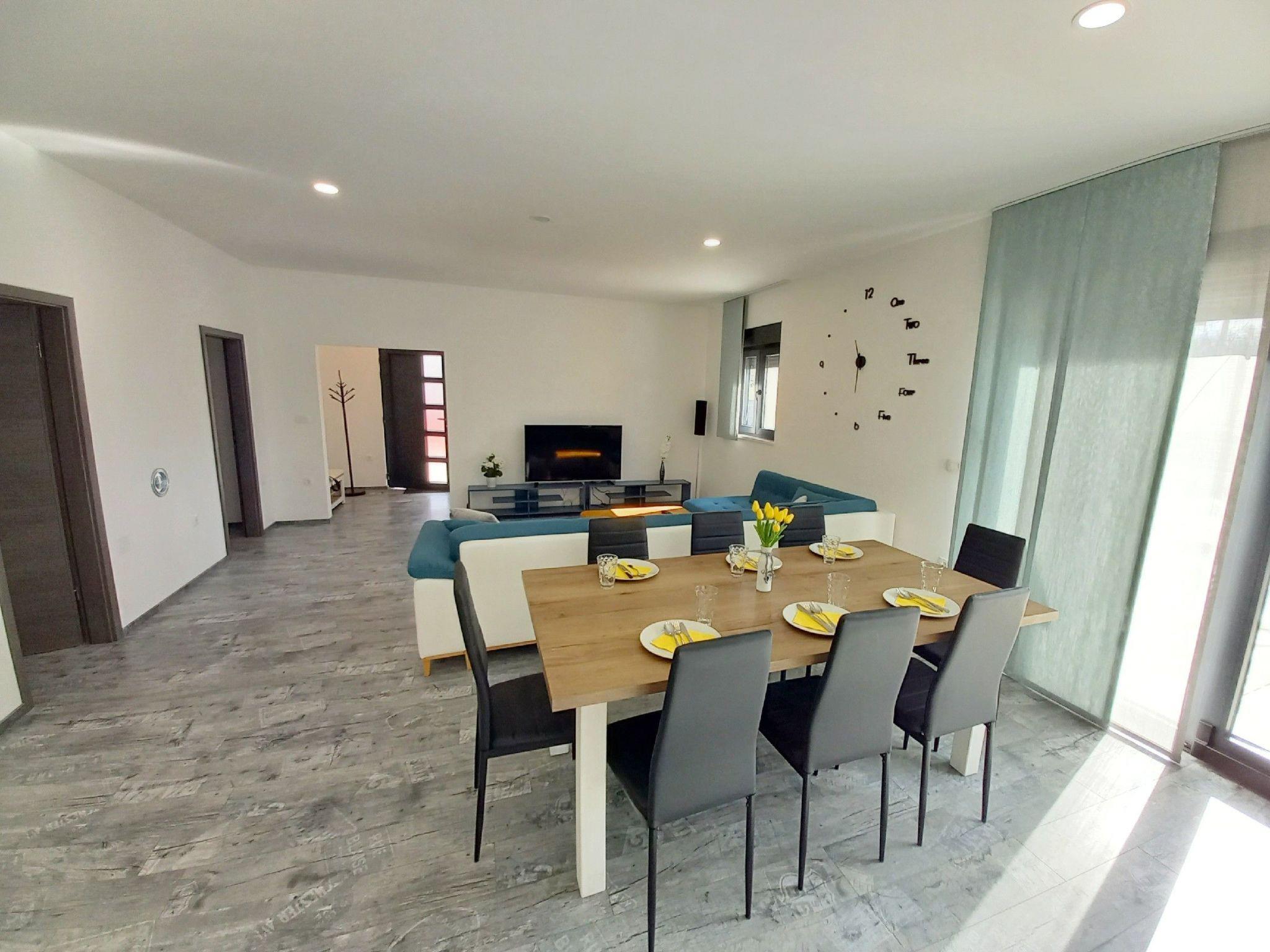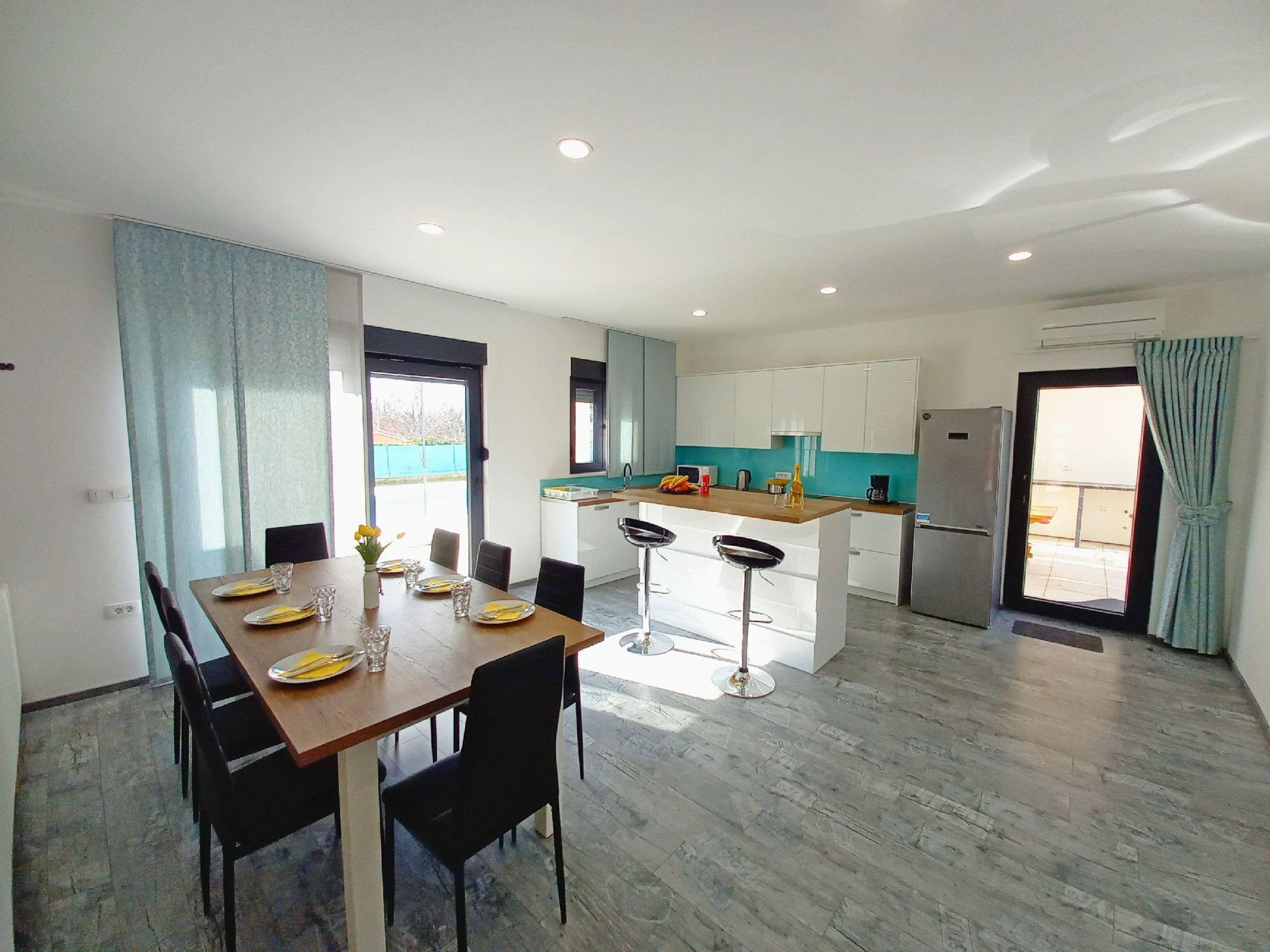 The villa's interior is spacious, bright, and beautifully furnished, guaranteeing a stay of unparalleled comfort. It is fully equipped with modern appliances to cater to all your needs. The living room merges seamlessly with the kitchen and dining space, creating a welcoming area for communal gatherings. Each of the three bedrooms comes with a double bed (180cm width), its own private bathroom, and air conditioning, ensuring personal space and comfort for all guests. Additional highlights include a separate toilet, a washing machine, and conveniences such as Wi-Fi Internet, SAT-TV, a safe deposit, and a fully equipped kitchen with a dishwasher, microwave, coffee machine, and more.