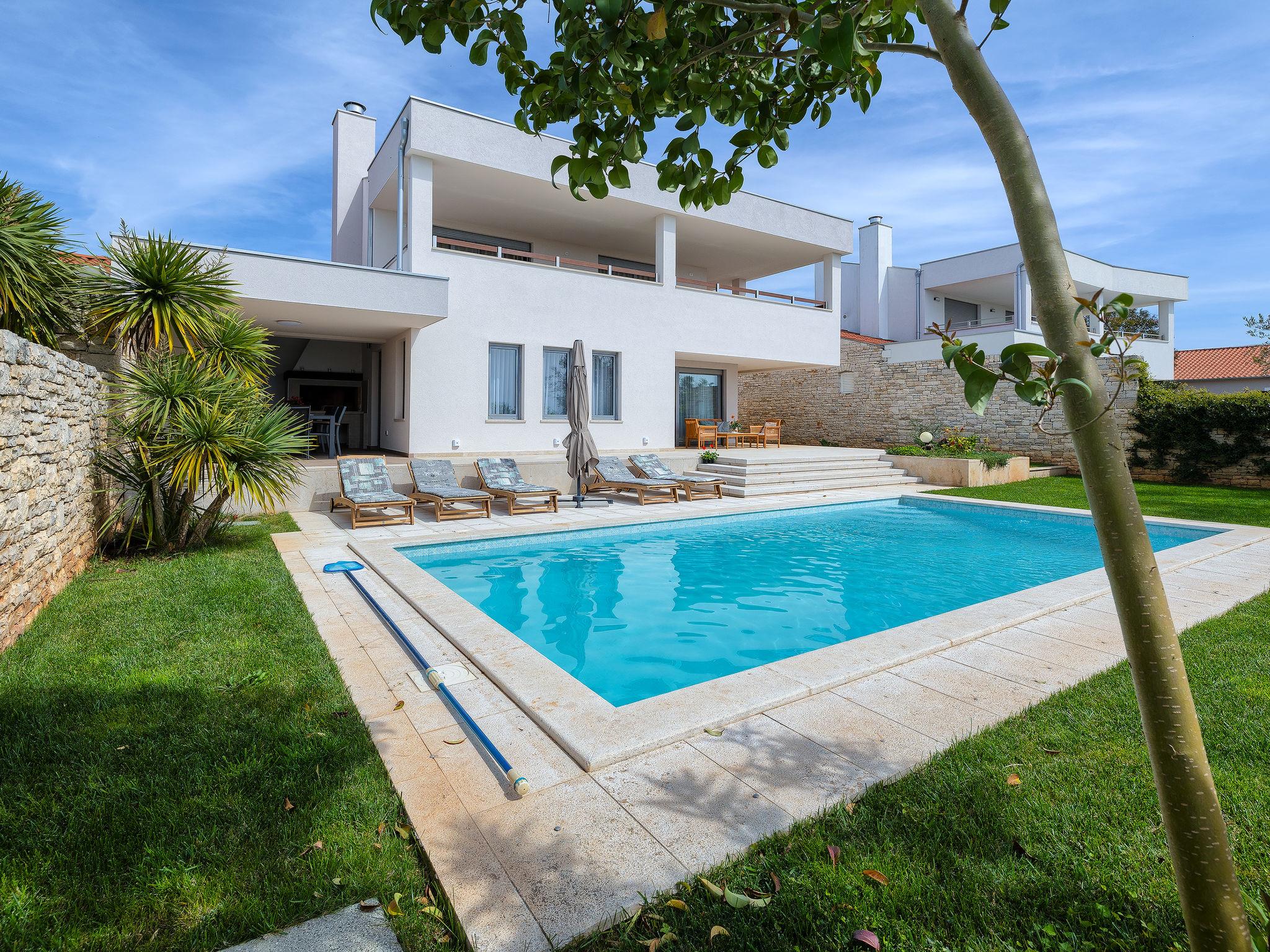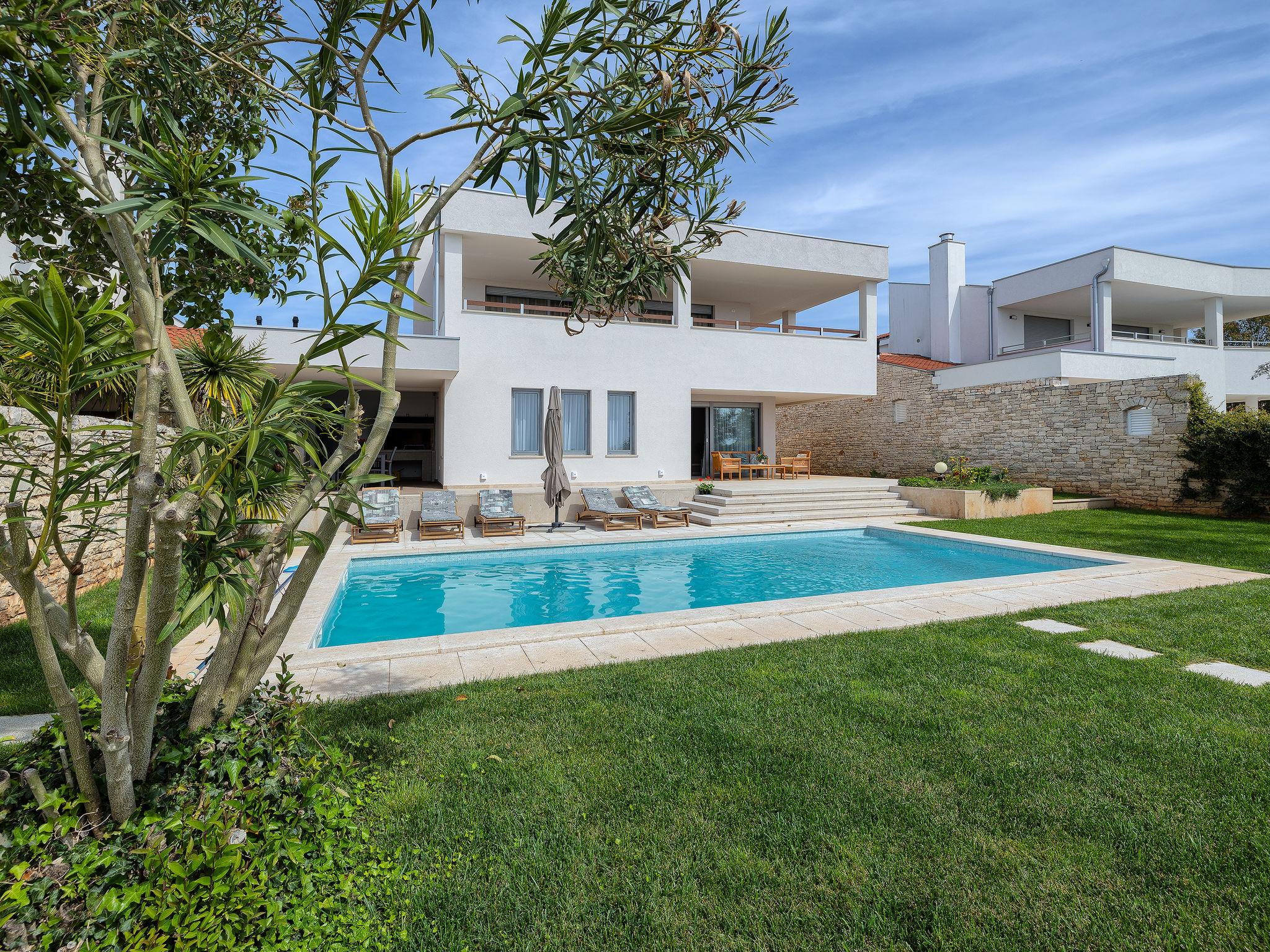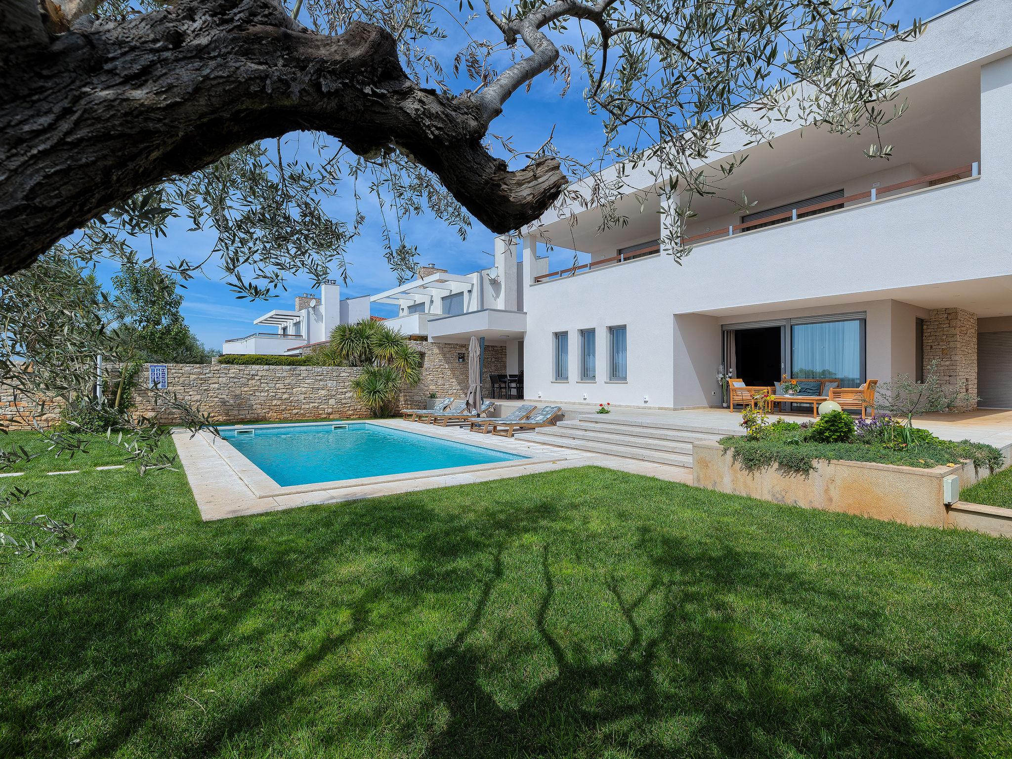 The ground floor has a modern kitchen with dining area and living room. The living room and dining room are connected by large French windows to the outside space where a spacious terrace allows you to enjoy the sun, heated outdoor pool, but also a magnificent view of the sea and the national park and the islands of Brijuni. Two bedrooms with their own bathroom are located on the ground floor, both with their own terrace and exit to the outside of the house.