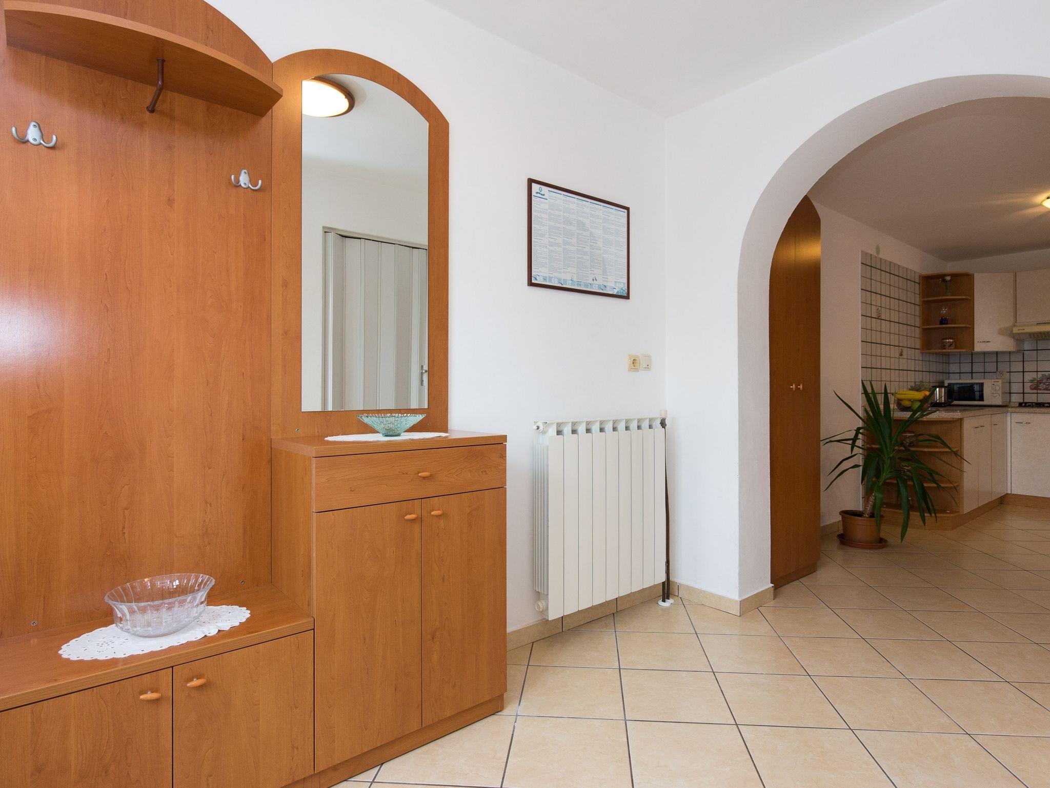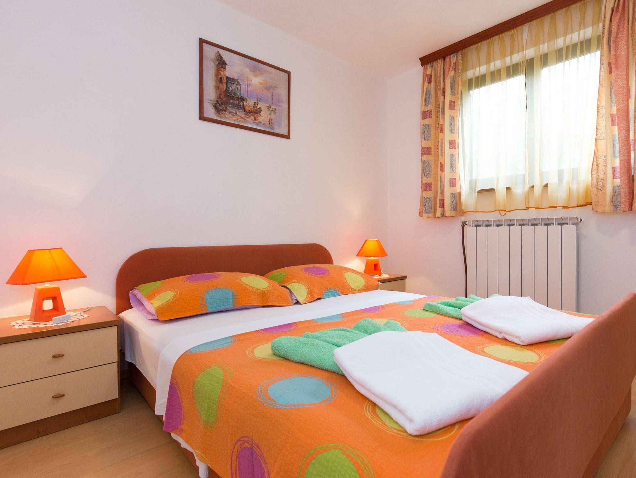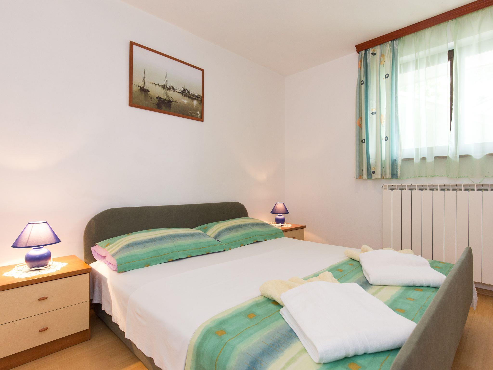 Ferienwohnung bietet Platz für 5 Gäste. Die Betten sind in Schlafzimmern, die es 2 gibt, und in Wohnzimmer, innerhalb einer Gesamtfläche von 66m2, angeordnet. Die Gäste haben eine eigene Terrasse zur Verfügung, auf der sie in warmen Sommernächten genießen können. Das Apartment bietet Meerblick. Es ist erlaubt, Speisen auf dem Gemeinschafts-Grill vorzubereiten. Während ihres Aufenthalts können Gäste das gemeinsam zur Nutzung stehende Schwimmbad benutzen. In der Unterkunftseinheit besteht die Möglichkeit des Mitbringens von Haustieren gegen Aufpreis. IM PREIS INBEGRIFFEN: Kurtaxe, Endreinigung, Klimatisierung, Pool, Parkplatz, Internet, Kinderbett, Bügeleisen, Bügelbrett, Föhn. VERBINDLICHE ZUSÄTZLICHE KOSTEN: Aufzahlung für Kurzaufenthalte (prozentualer Zuschlag pro Nächtigungsanzahl: 30% - 1, 20% - 2, 10% - 3). UNVERBINDLICHE ZUSÄTZLICHE KOSTEN: Zentralheizung (6,00 € pro Nacht), Wäschewaschen (5,00 € Waschen), Haustiere (10,00 € pro Nacht), Zusatzbett (15,00 € pro Nacht). Die Verfügbarkeit zusätzlicher Dienstleistungen in Ihrem reservierten Termin und die Preise derselben (falls nicht aufgeführt) müssen im Voraus überprüft werden. Zusätzliche Dienstleistungen die in der Zahlungsaufforderung nicht aufgeführt sind werden direkt beim Vermieter bezahlt, angenommen der Gast nutzt auch diese.