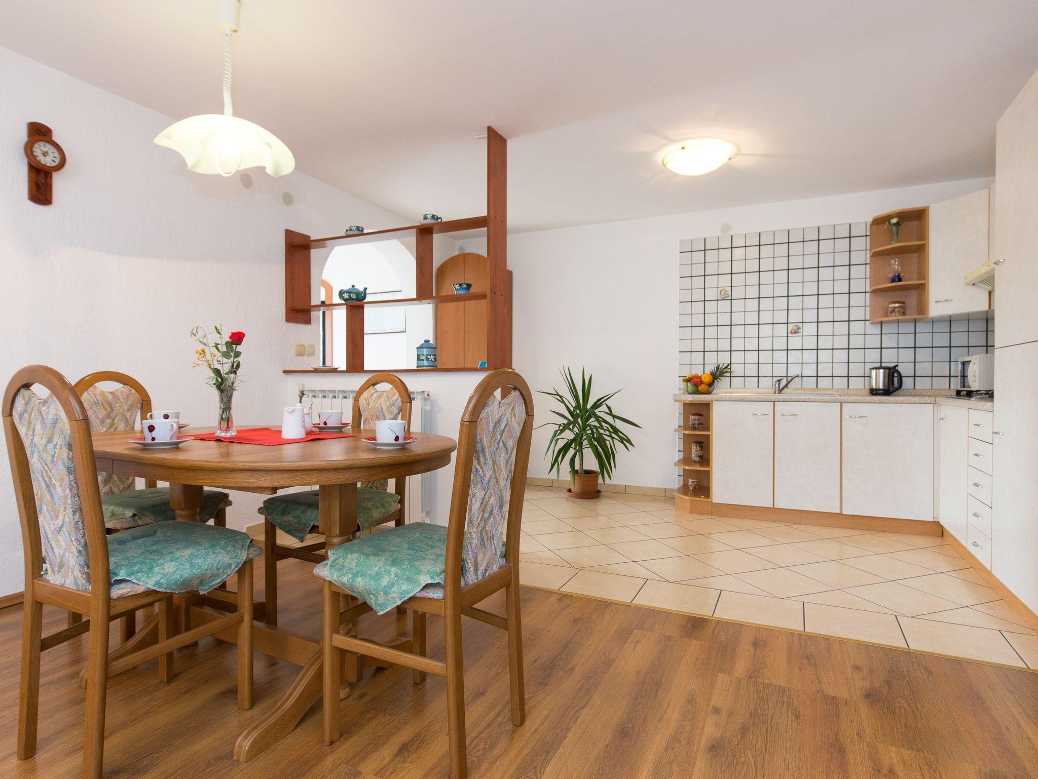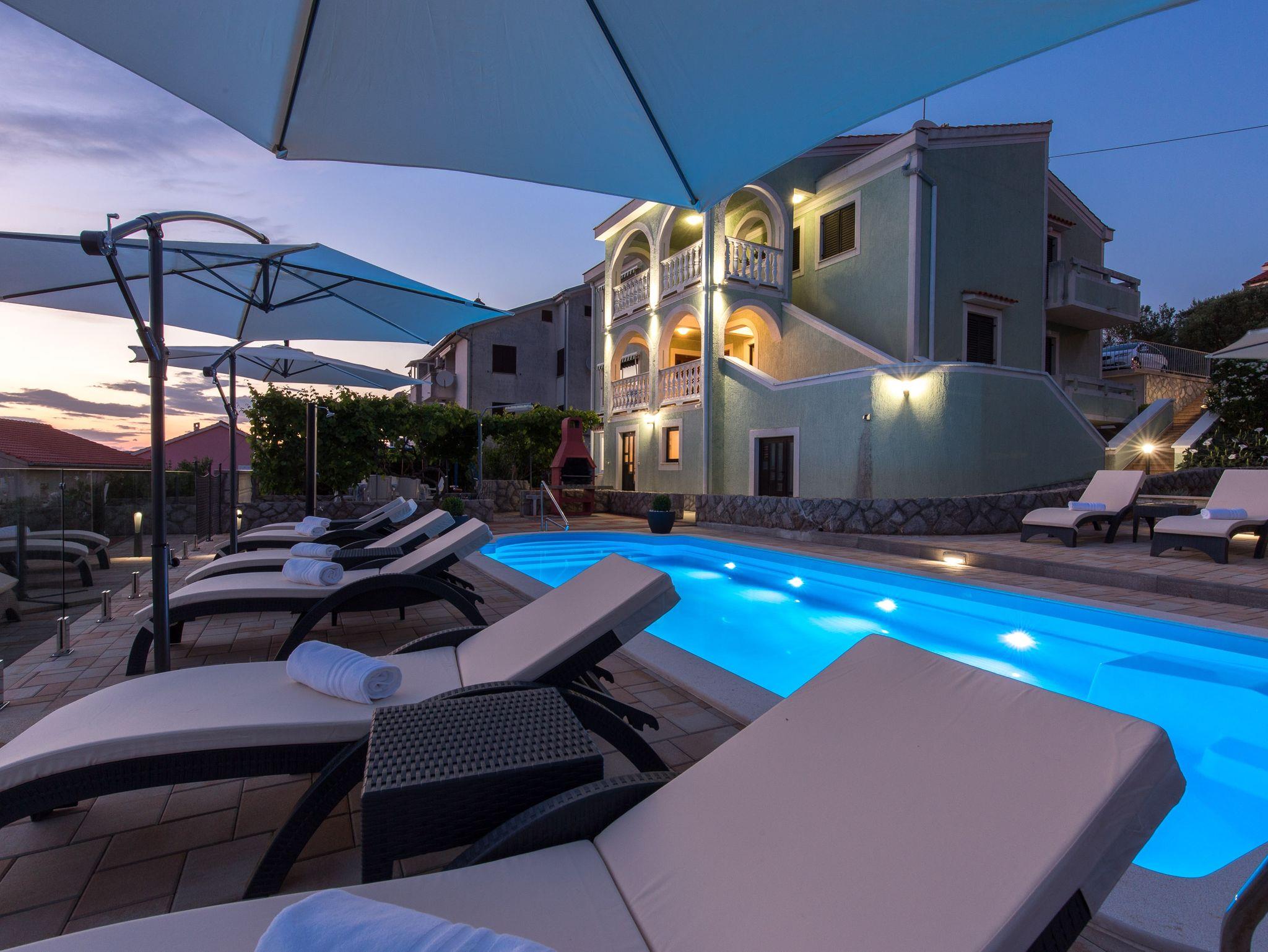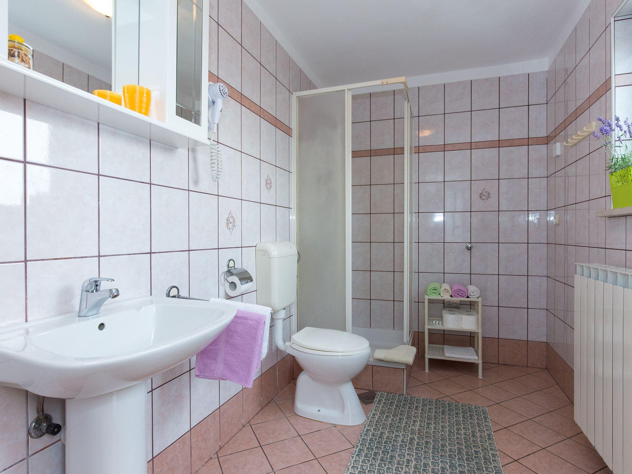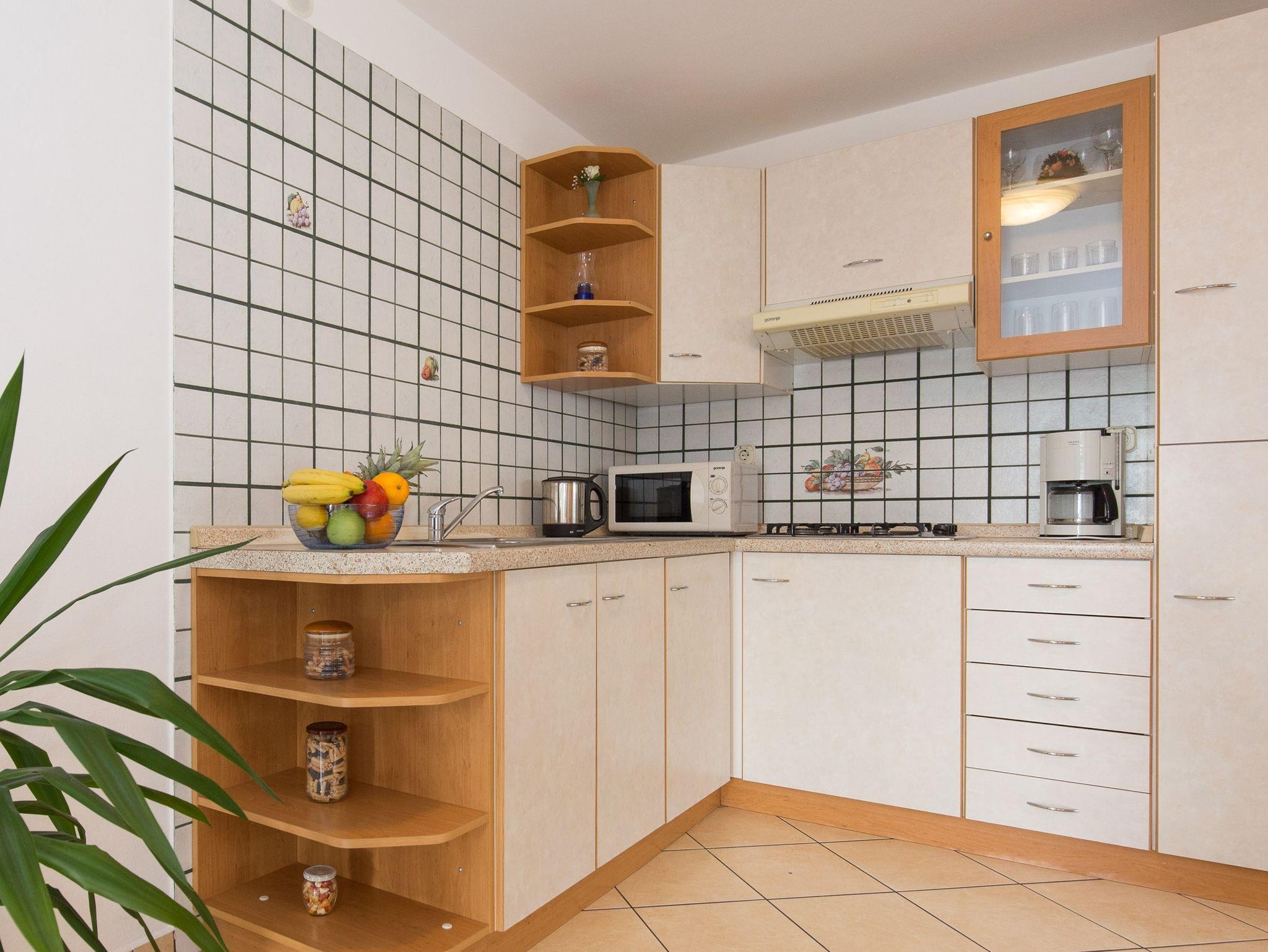Ferienwohnung bietet Platz für 5 Gäste. Die Betten sind in Schlafzimmern, die es 2 gibt, und in Wohnzimmer, innerhalb einer Gesamtfläche von 66m2, angeordnet. Die Gäste haben eine eigene Terrasse zur Verfügung, auf der sie in warmen Sommernächten genießen können. Das Apartment bietet Meerblick. Es ist erlaubt, Speisen auf dem Gemeinschafts-Grill vorzubereiten. Während ihres Aufenthalts können Gäste das gemeinsam zur Nutzung stehende Schwimmbad benutzen. In der Unterkunftseinheit besteht die Möglichkeit des Mitbringens von Haustieren gegen Aufpreis. IM PREIS INBEGRIFFEN: Kurtaxe, Endreinigung, Klimatisierung, Pool, Parkplatz, Internet, Kinderbett, Bügeleisen, Bügelbrett, Föhn. VERBINDLICHE ZUSÄTZLICHE KOSTEN: Aufzahlung für Kurzaufenthalte (prozentualer Zuschlag pro Nächtigungsanzahl: 30% - 1, 20% - 2, 10% - 3). UNVERBINDLICHE ZUSÄTZLICHE KOSTEN: Zentralheizung (6,00 € pro Nacht), Wäschewaschen (5,00 € Waschen), Haustiere (10,00 € pro Nacht), Zusatzbett (15,00 € pro Nacht). Die Verfügbarkeit zusätzlicher Dienstleistungen in Ihrem reservierten Termin und die Preise derselben (falls nicht aufgeführt) müssen im Voraus überprüft werden. Zusätzliche Dienstleistungen die in der Zahlungsaufforderung nicht aufgeführt sind werden direkt beim Vermieter bezahlt, angenommen der Gast nutzt auch diese.