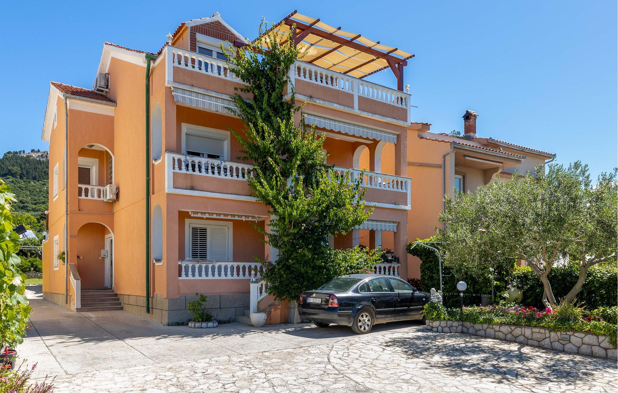 Denne lejlighed ligger placeret på 1. sal og er ideel til en familie. I kommer til at bo tæt på stranden i et roligt område, så placeringen er helt perfekt. Der er hyggelige forhold indenfor, og hvis I gerne vil nyde solen uden at pakke en taske, kan I bare sætte jer ud på altanen. Herfra kan I se ned til havet, som I kan gå til på bare to minutter. Tænd op i fællesgrillen og tilbered noget lækkert fra Kroatiens rige udvalg af råvarer.