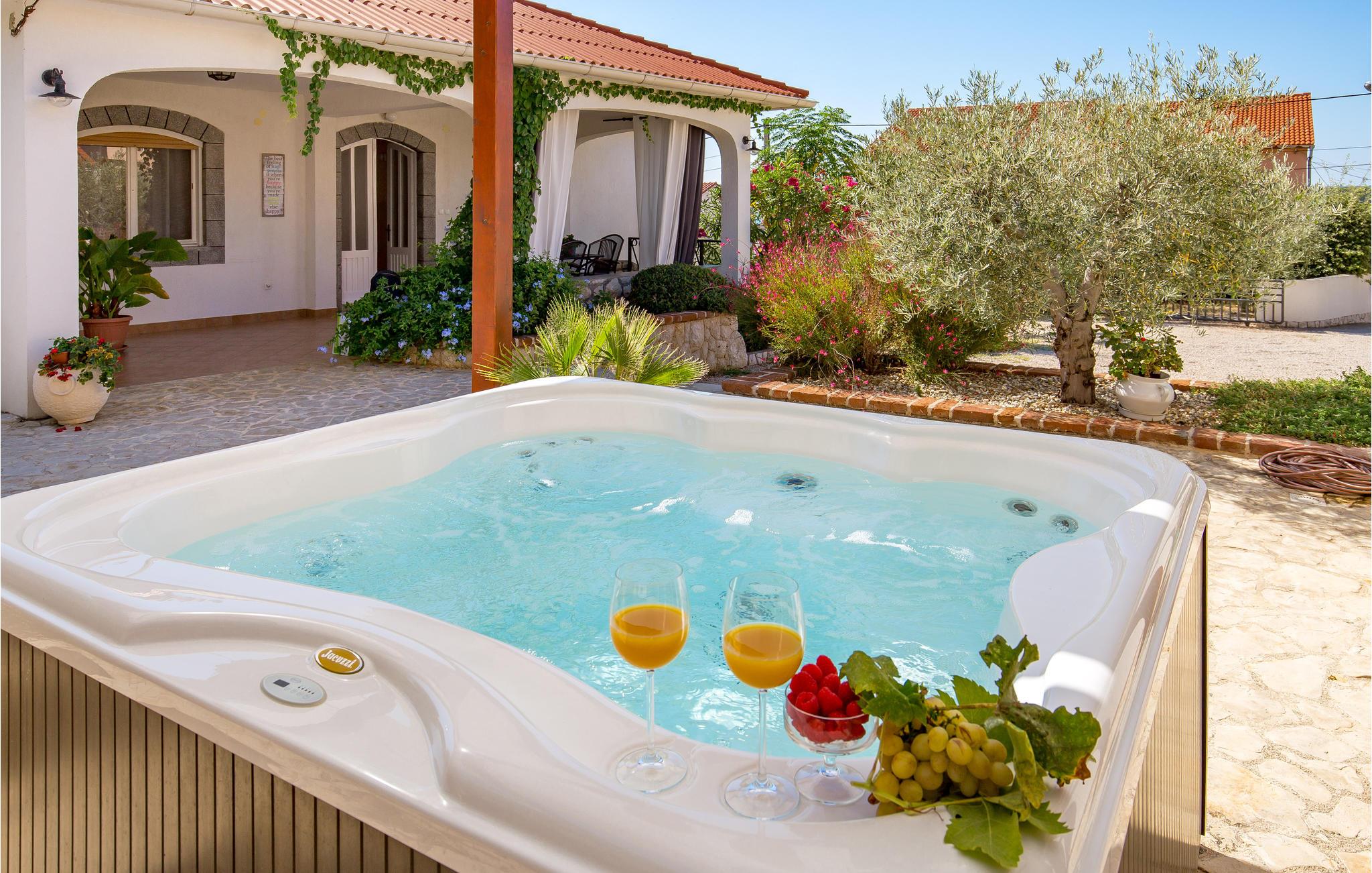 Glæd jer til en afslappende og behagelig ferie i dette vidunderlige feriehus på øen Rab. Her kan I nyde morgenmaden udenfor på den overdækkede terrasse. Efter en dag med udflugter kan I slappe af indenfor i stuen eller udenfor på liggestolene med en iskold drink. Nyd måltiderne sammen på terrassen og gå flotte ture ved havet. Det bedste punktum for dagen, kan I sætte ved at gå i spabadet og nyde aftenen med et glas vin.