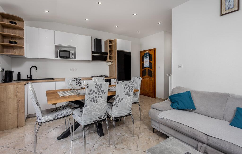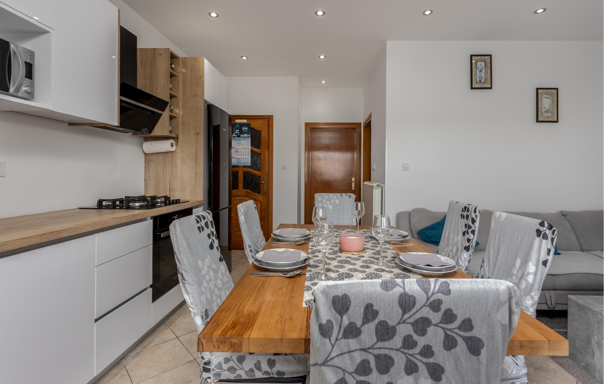 Denne stilfulde ferielejlighed lægger op til en afslappende pause med familien lige ved stranden og byder jer velkommen med en moderne og hyggelig atmosfære. Lav lækre retter sammen i det åbne køkken og nyd dem ved det stilrene spisebord. Efter en lang dag kan I synke ned i den komfortable sofa, slappe af med en god bog eller streame en spændende film.