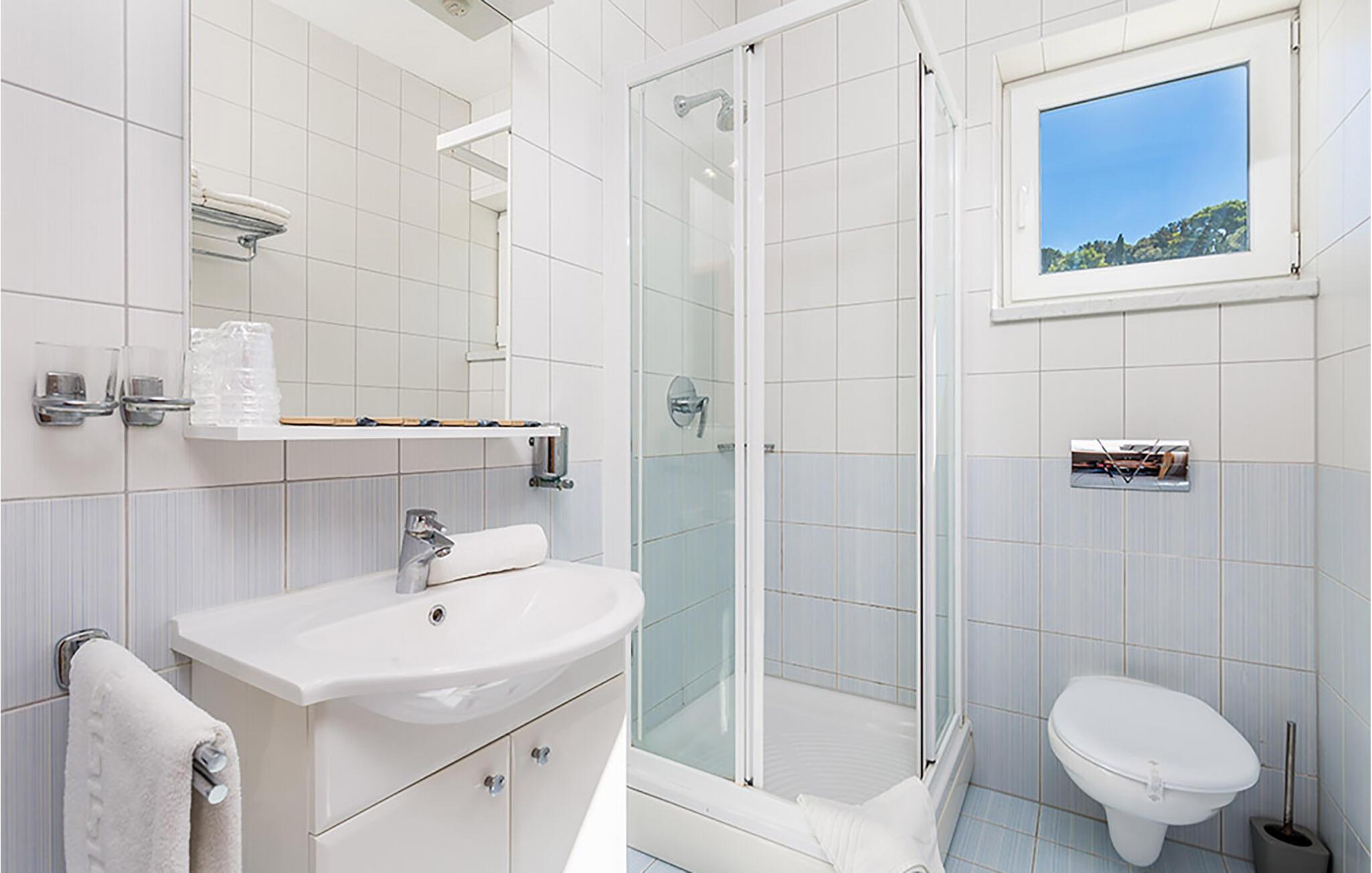 Oplev afslappende dage i denne komfortable ferielejlighed med adgang til poolen. Tilbring en afslappende ferie i denne lyse lejlighed, der charmerer med sine smukke træelementer og indbydende atmosfære. Den venter sine gæster tæt på havet. I den indbydende opholdsstue indbyder sofaen til afslapning; hyg jer sammen efter en dejlig dag på stranden. Gå fra stuen ud på terrassen, nyd en afslappet morgenmad og slap af i solen, kun afbrudt af forfriskende dukkerter i den fælles pool. Om aftenen kan I samle familien til en lækker grillfest. Gå en tur langs Palit-promenaden og nyd udsigten over Rabs gamle bydel. Oplev de små bugter og svøm i Adriaterhavets klare vand. Besøg Rabs gamle bydel med dens fire karakteristiske kirketårne. Gå en tur gennem de smalle gader, beundr den venetianske arkitektur, og stop ved en af de mange caféer eller restauranter. Udforsk Komrcar Park, der ligger lige over den gamle bydel. Gå en tur gennem fyrreskove og nyd skyggen og havudsigten.