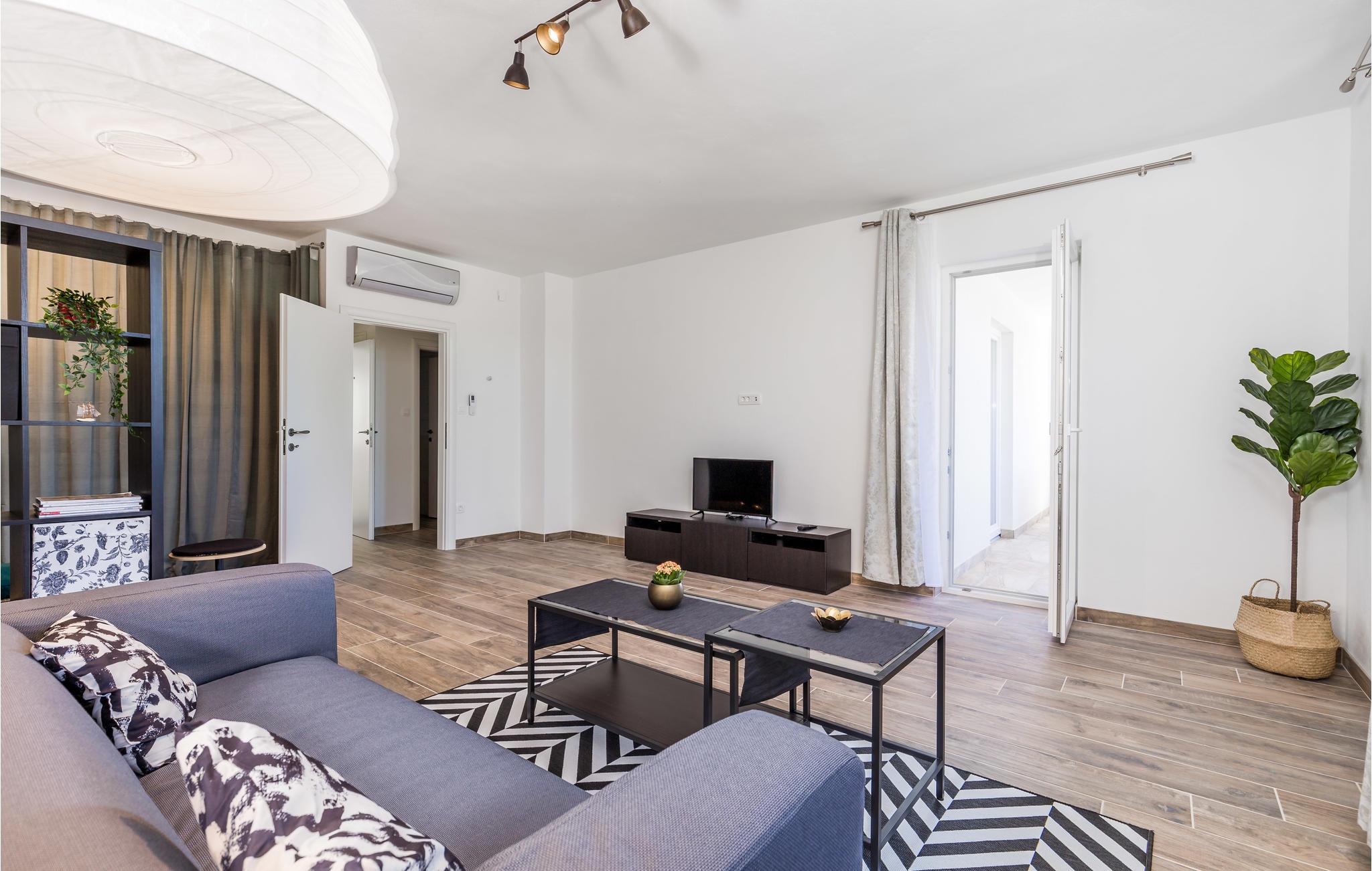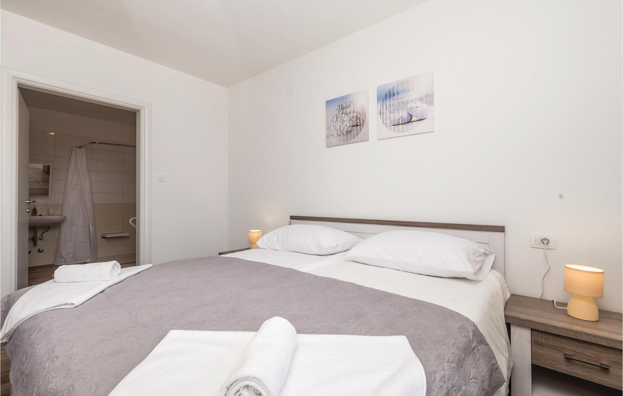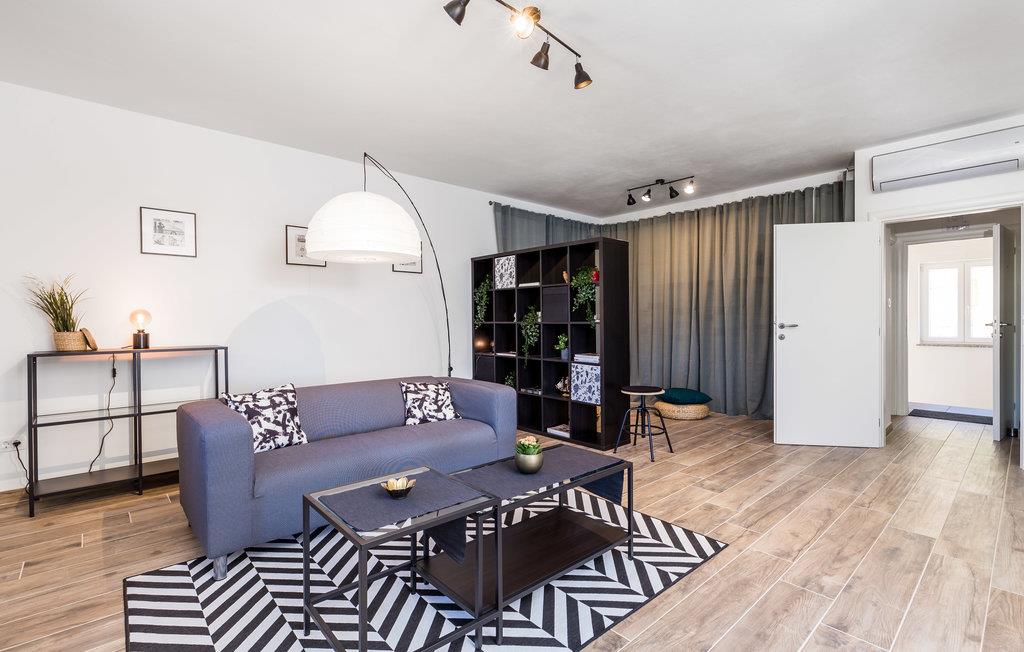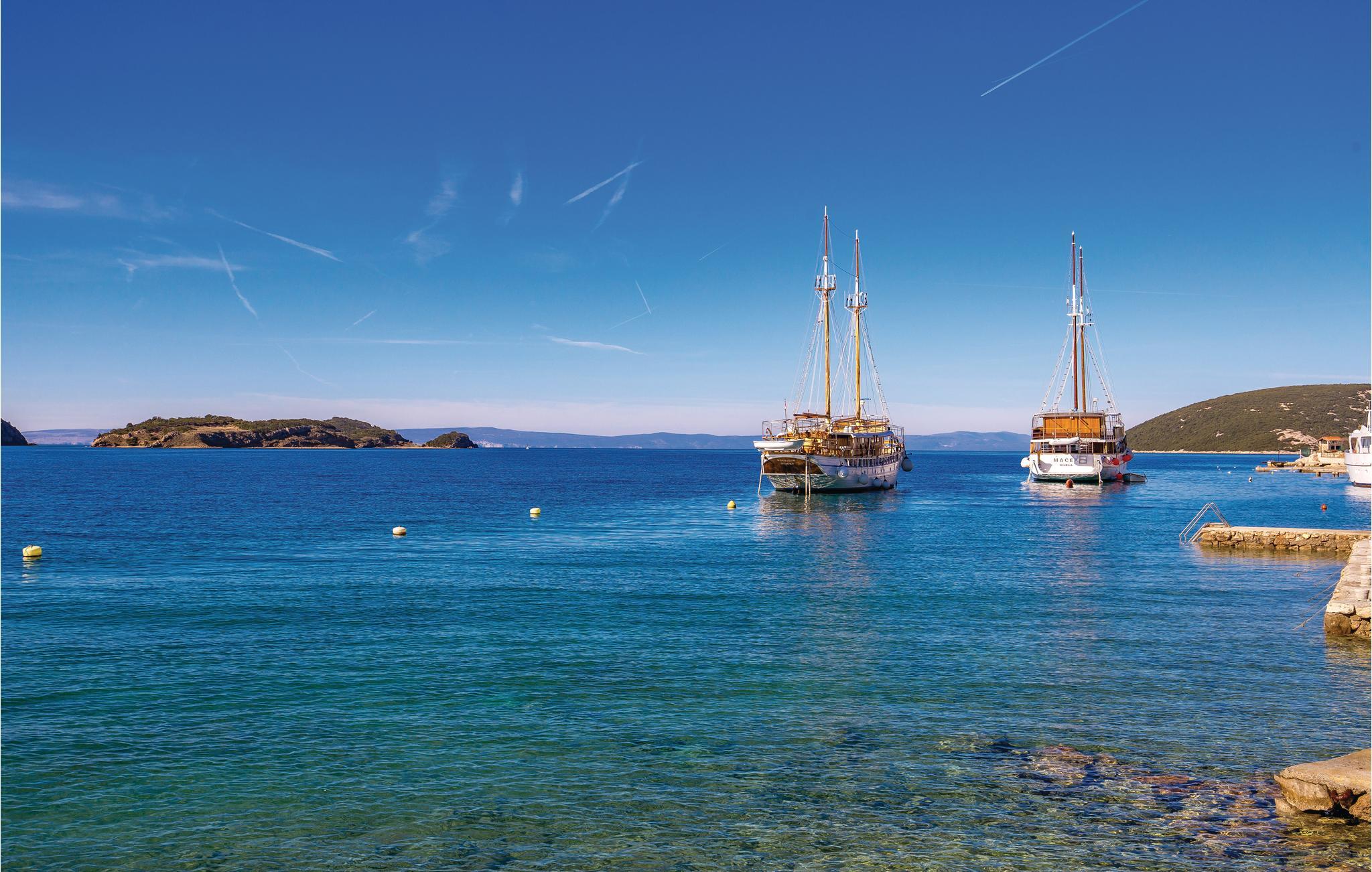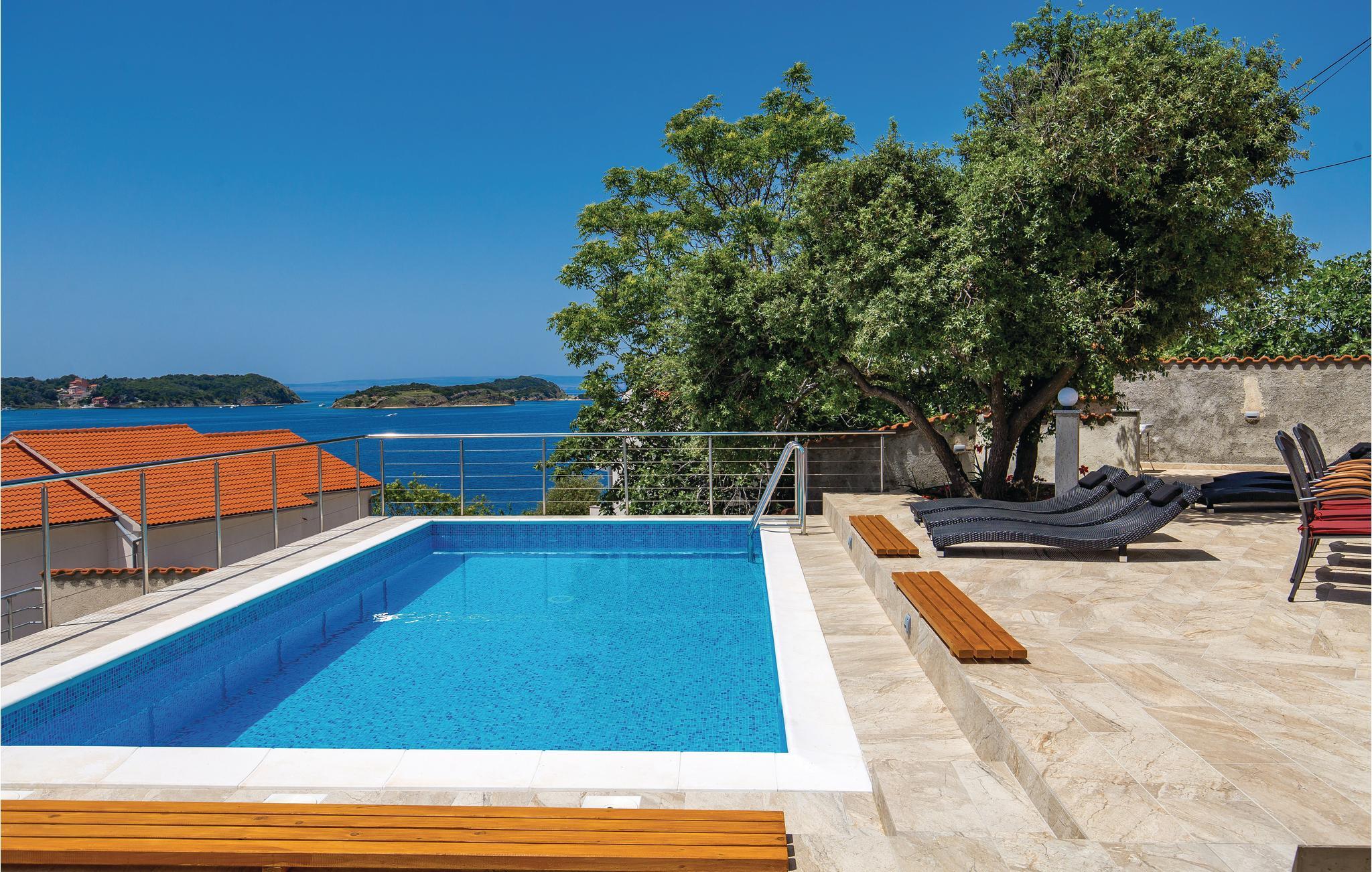I byen Supetarska Draga, på den solrige ø Rab, ligger dette feriehus med en skøn udsigt over havet og landskabet som et perfekt rejsemål, til jer der vil holde en behagelig ferie. I stueplan er der to soveværelser og et badeværelse som er indrettet til handicappede, mens de to resterende badeværelser ligger på første sal. Husets to etager er forbundet med en ydre trappe.