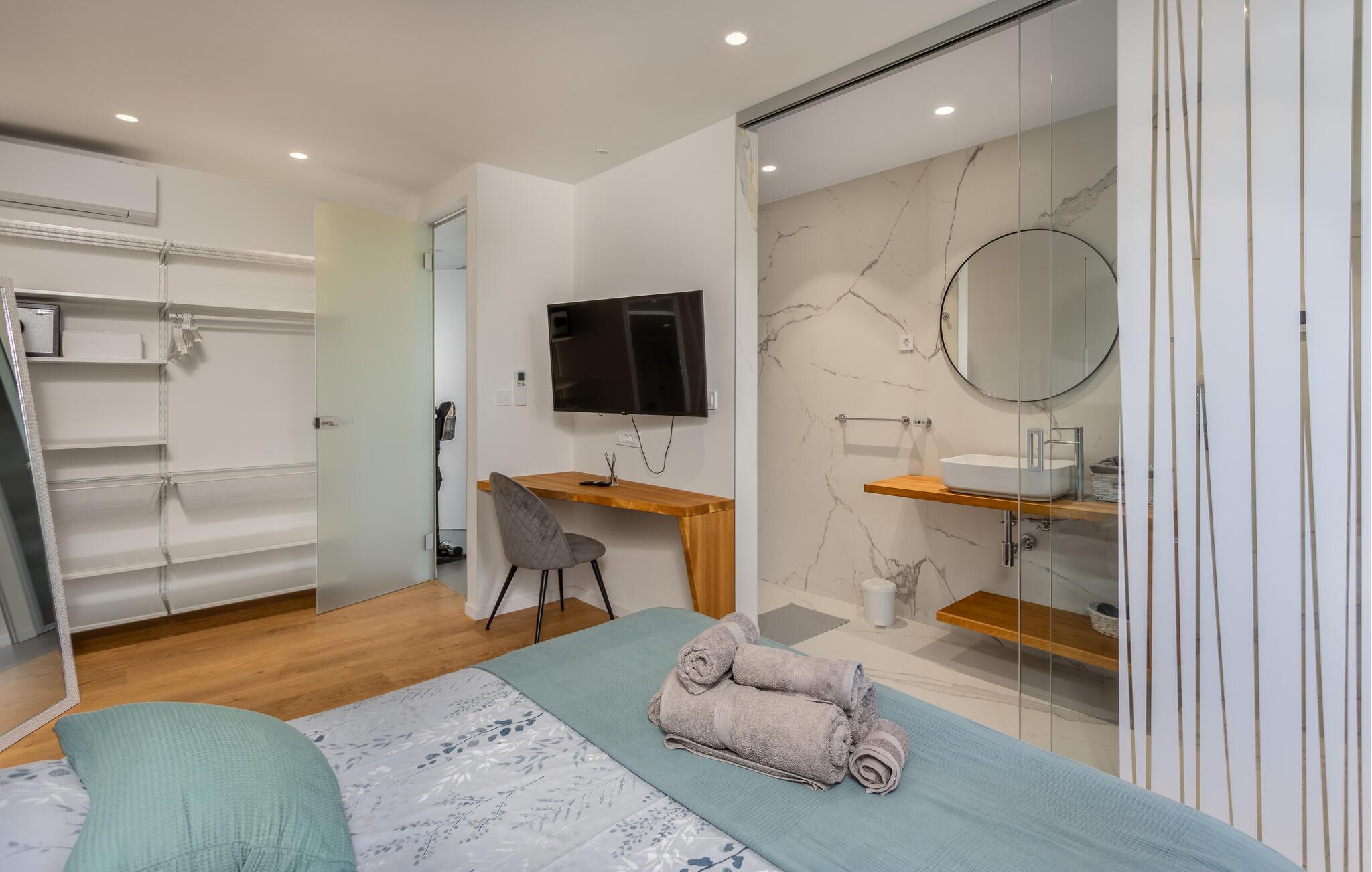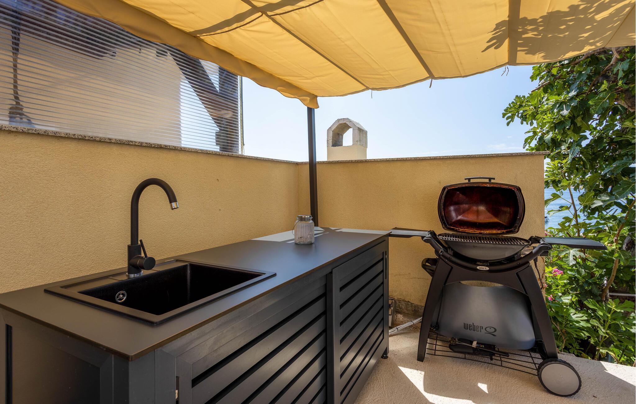 Udearealet er lige så lækkert og indbyder til mange dejlige timer under den bagende sol. Lad børnene plaske rundt i poolen og smør jer godt ind i solcreme, I kan nyde vejret med god samvittighed og lade blikkene vandre over landskabet. Til huset hører et veludstyret udekøkken, hvor I kan tilberede familiens livretter og runde en smuk dag gå på hæld med et godt glas vin under den lune aftensol.
