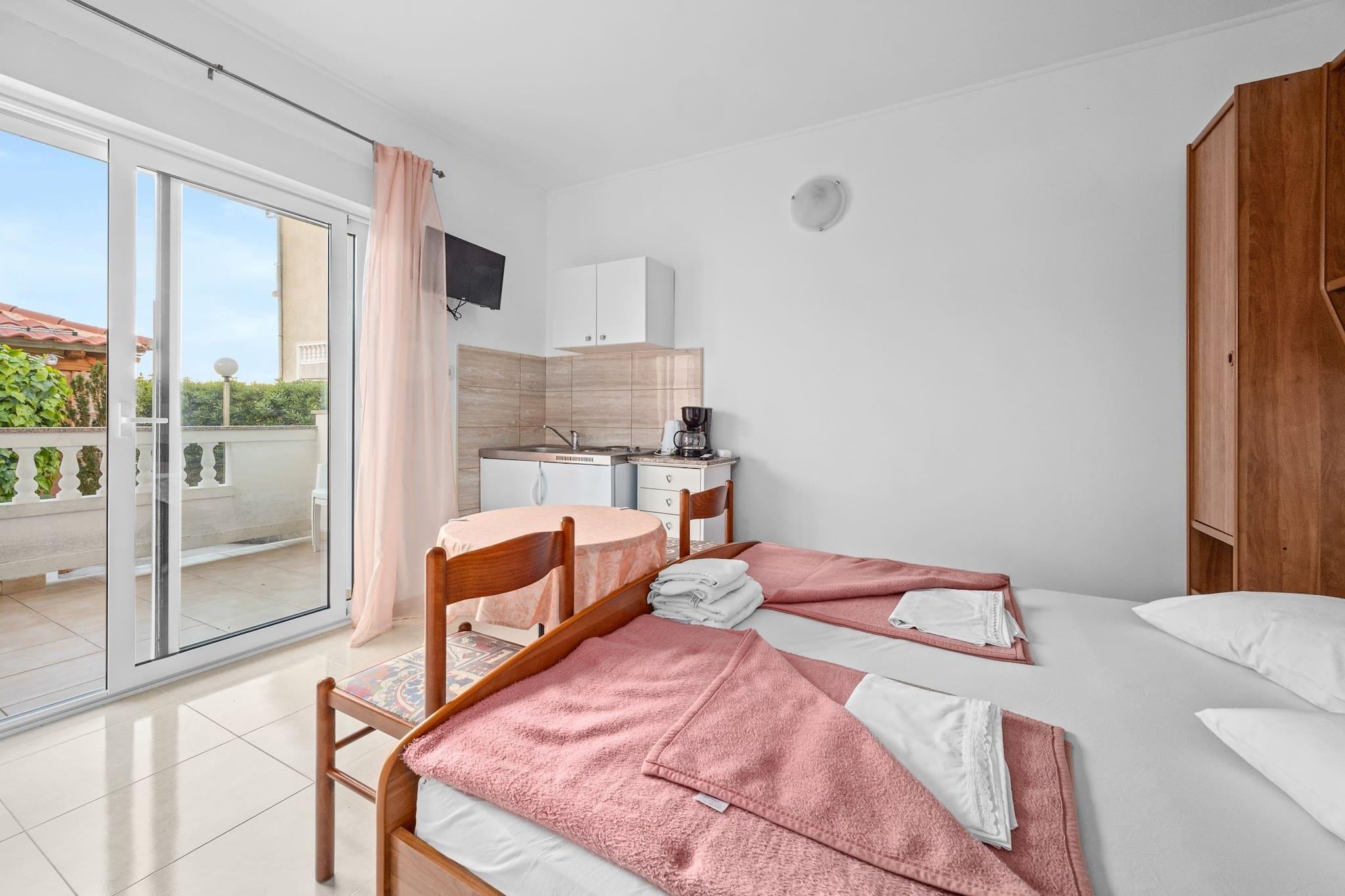 Denne charmerende studiolejlighed tilbyder et behageligt ophold for to gæster, og byder på en stor dobbeltseng, et tekøkken og et spisebord. Rummet omfatter et moderne badeværelse med bruser og en privat terrasse med en fantastisk havudsigt. Lejligheden har aircondition og giver adgang til Wi-Fi, hvilket sikrer et afslappende ophold. Ejendommen er ikke kæledyrsvenlig og rummer ikke grupper af unge mennesker. Der er gratis privat parkering på stedet, og hvis du bliver i en længere periode, tilbyder værterne tøjvask efter anmodning. Studioet ligger på den maleriske ø Rab i det fredelige område Barbat, kun 500 meter fra en sandstrand. Gæster kan udforske øens rige historie ved at besøge den antikke græske militærfæstning på St. Damian Hill, eller vandre gennem de smalle gader i den gamle bydel Rab. For naturelskere tilbyder Park-skov Komrcar en skyggefuld oase til gåture. Derudover giver ejendommen nem adgang til færgen fra Stinica til Misnjak, hvilket gør det bekvemt at rejse rundt. Lejligheden har et fuldt udstyret tekøkken med væsentlige faciliteter, herunder køleskab, komfur og kaffemaskine, så gæsterne kan tilberede måltider. Gæsterne har også adgang til en fælles terrasse med en udendørs spiseplads og et sommerkøkken, som er udstyret med en gasgrill og en opvaskemaskine. For dem, der er interesseret i at udforske nærliggende øer, tilbyder værterne en lille båd til brug, forudsat at der gives forudgående varsel.