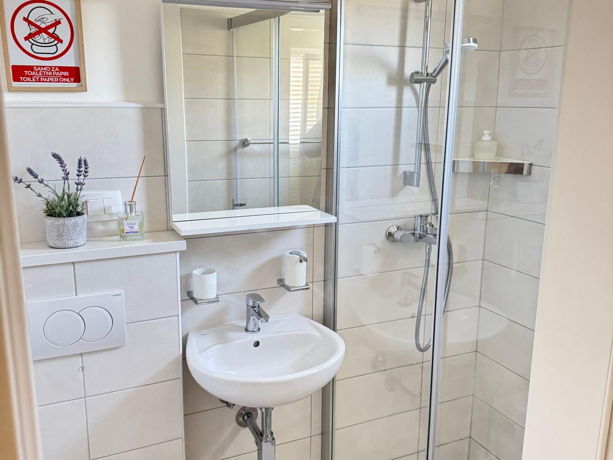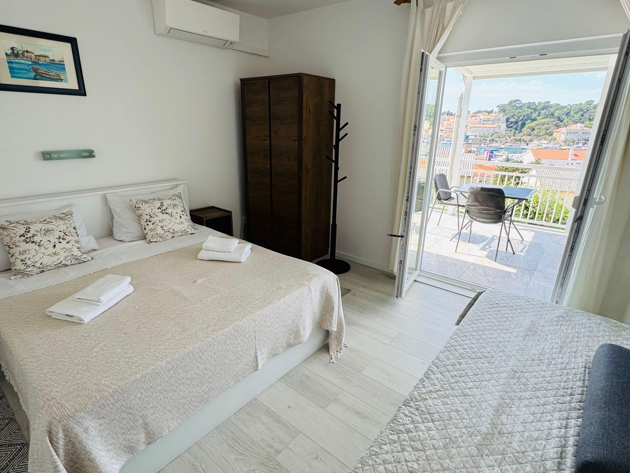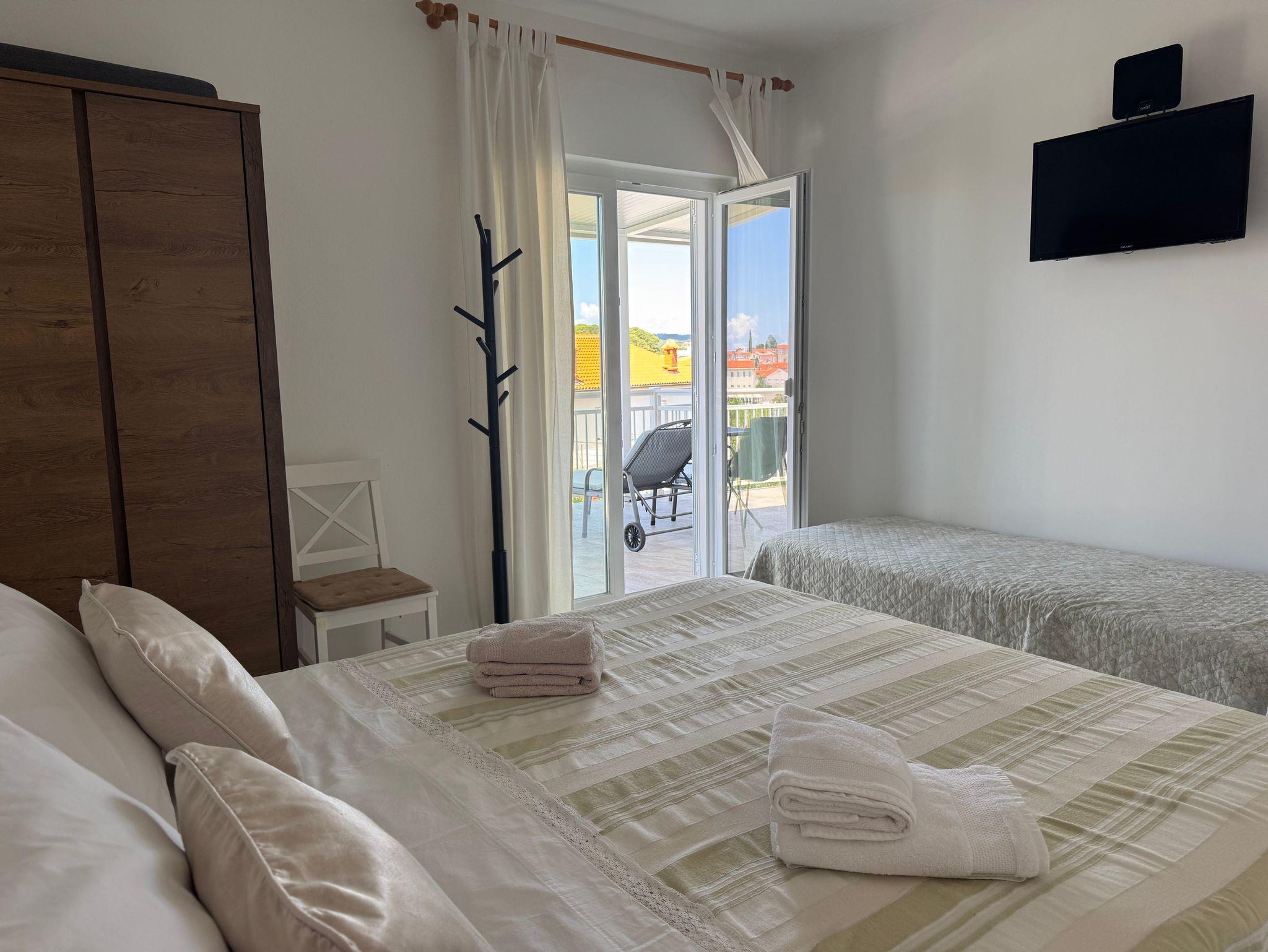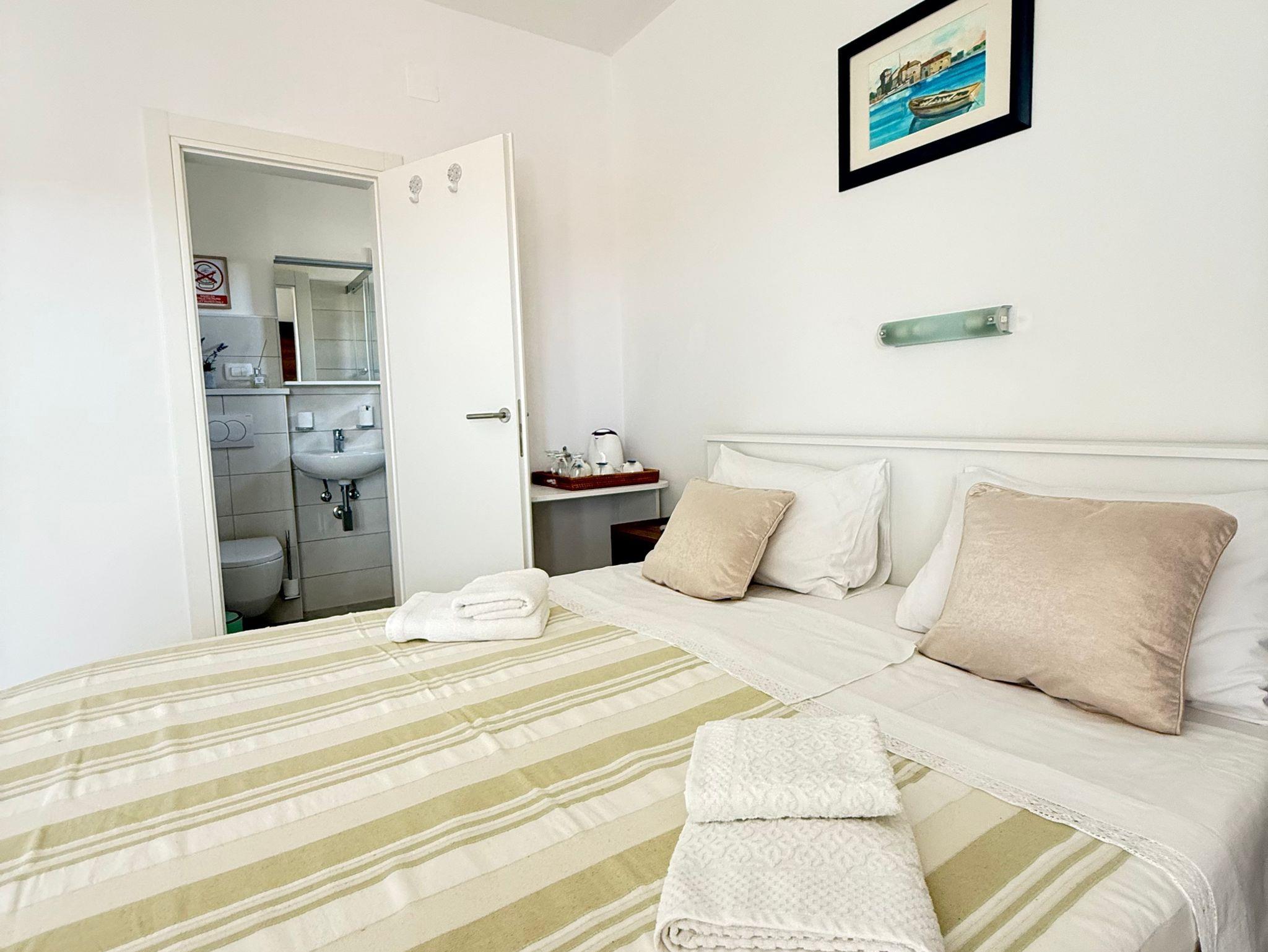 Zimmer bietet Platz für 3 Gäste. Die Betten sind in Schlafzimmern, die es 1 gibt, innerhalb einer Gesamtfläche von 18m2, angeordnet. Die Gäste haben eine eigene Terrasse zur Verfügung, auf der sie in warmen Sommernächten genießen können. Das Zimmer bietet Meerblick. Die reservierte Unterkunftseinheit ist ein Zimmer mit eigenem Badezimmer ohne die Möglichkeit der Nutzung einer Küche. IM PREIS INBEGRIFFEN: Kurtaxe, Endreinigung, Klimatisierung, Parkplatz, Internet, Föhn. Die Verfügbarkeit zusätzlicher Dienstleistungen in Ihrem reservierten Termin und die Preise derselben (falls nicht aufgeführt) müssen im Voraus überprüft werden. Zusätzliche Dienstleistungen die in der Zahlungsaufforderung nicht aufgeführt sind werden direkt beim Vermieter bezahlt, angenommen der Gast nutzt auch diese. Ermäßigung auf den Grundpreis: Gratistag 14=13 (bei einem Aufenthalt von 14 Tagen oder mehr erhalten Sie einen Gratistag für den Aufenthalt bis 31.12.26).