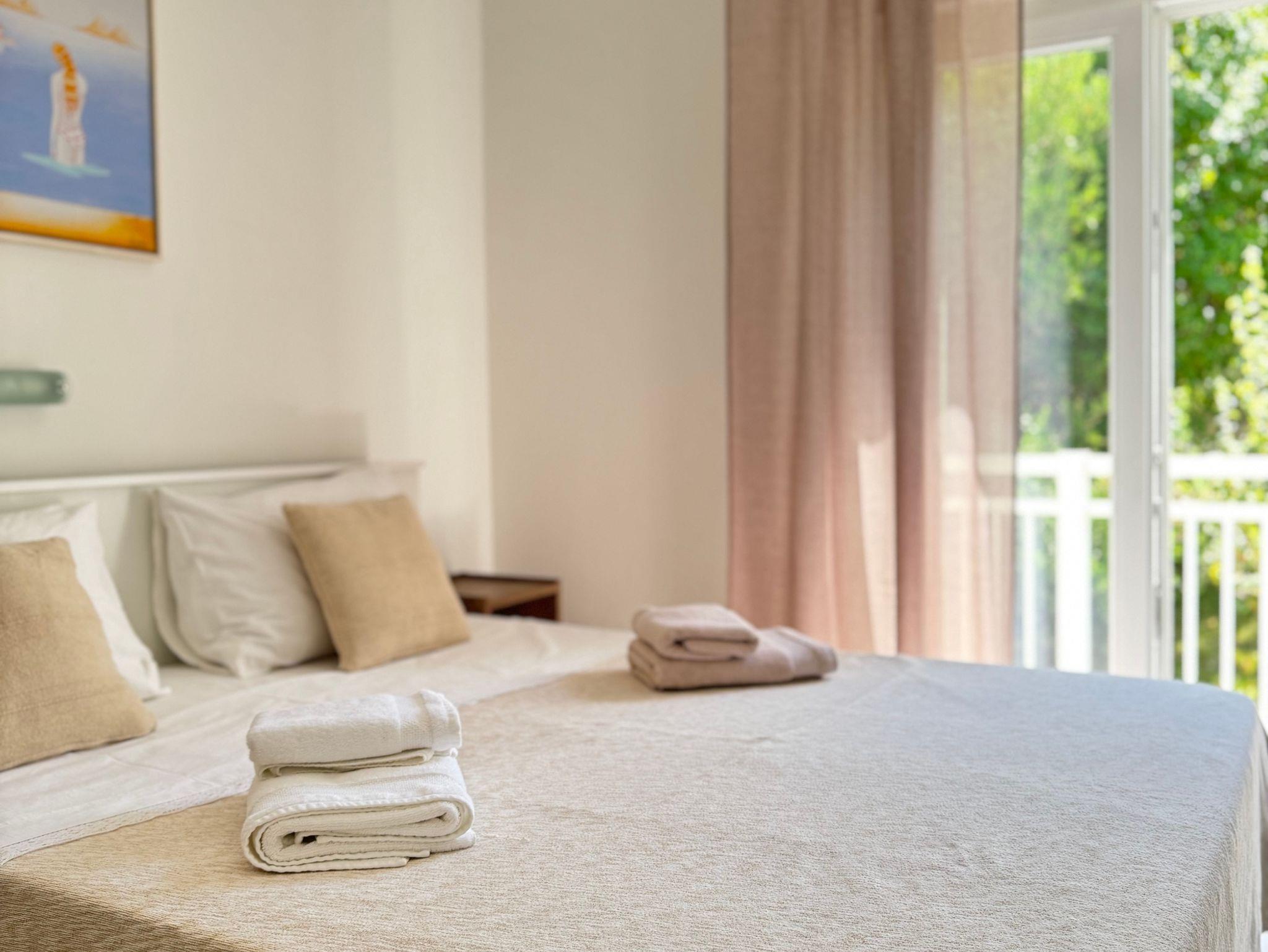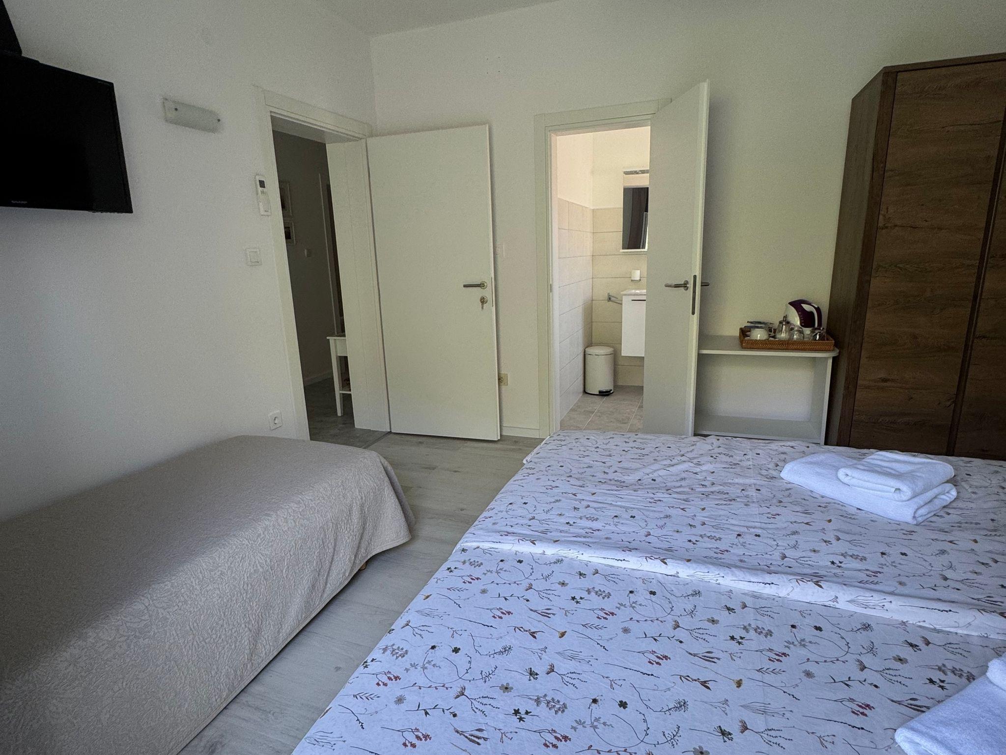 Zimmer bietet Platz für 3 Gäste. Die Betten sind in Schlafzimmern, die es 1 gibt, innerhalb einer Gesamtfläche von 17m2, angeordnet. Die Gäste haben eine eigene Terrasse zur Verfügung, auf der sie in warmen Sommernächten genießen können. Die reservierte Unterkunftseinheit ist ein Zimmer mit eigenem Badezimmer ohne die Möglichkeit der Nutzung einer Küche. IM PREIS INBEGRIFFEN: Kurtaxe, Endreinigung, Klimatisierung, Parkplatz, Internet, Föhn. Die Verfügbarkeit zusätzlicher Dienstleistungen in Ihrem reservierten Termin und die Preise derselben (falls nicht aufgeführt) müssen im Voraus überprüft werden. Zusätzliche Dienstleistungen die in der Zahlungsaufforderung nicht aufgeführt sind werden direkt beim Vermieter bezahlt, angenommen der Gast nutzt auch diese. Ermäßigung auf den Grundpreis: Gratistag 14=13 (bei einem Aufenthalt von 14 Tagen oder mehr erhalten Sie einen Gratistag für den Aufenthalt bis 31.12.26).