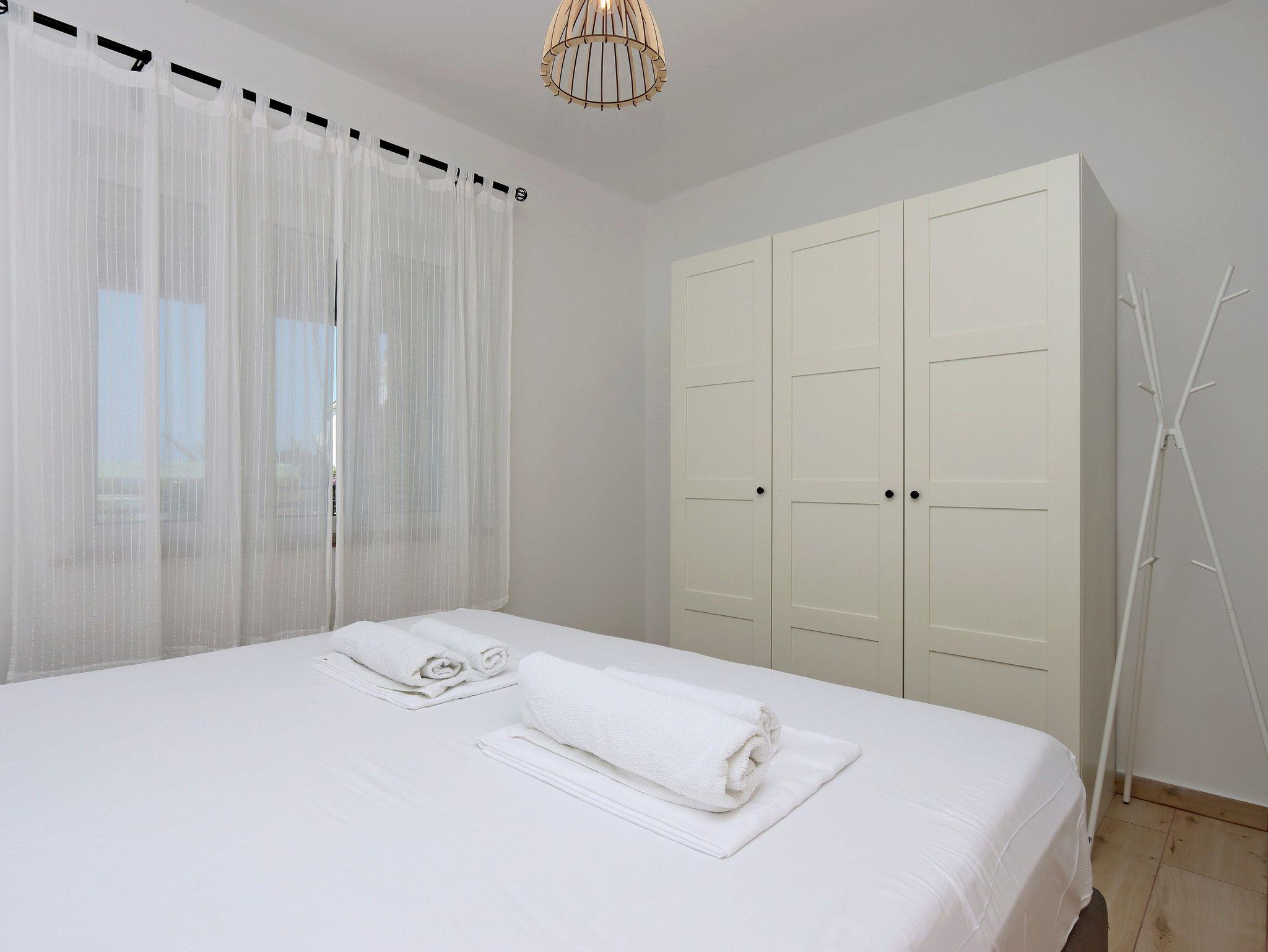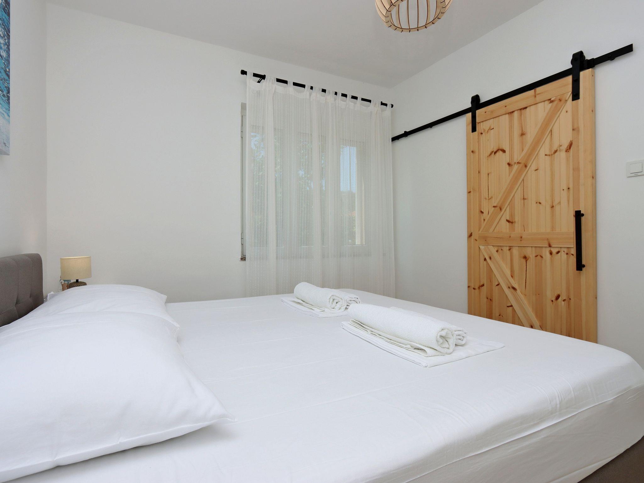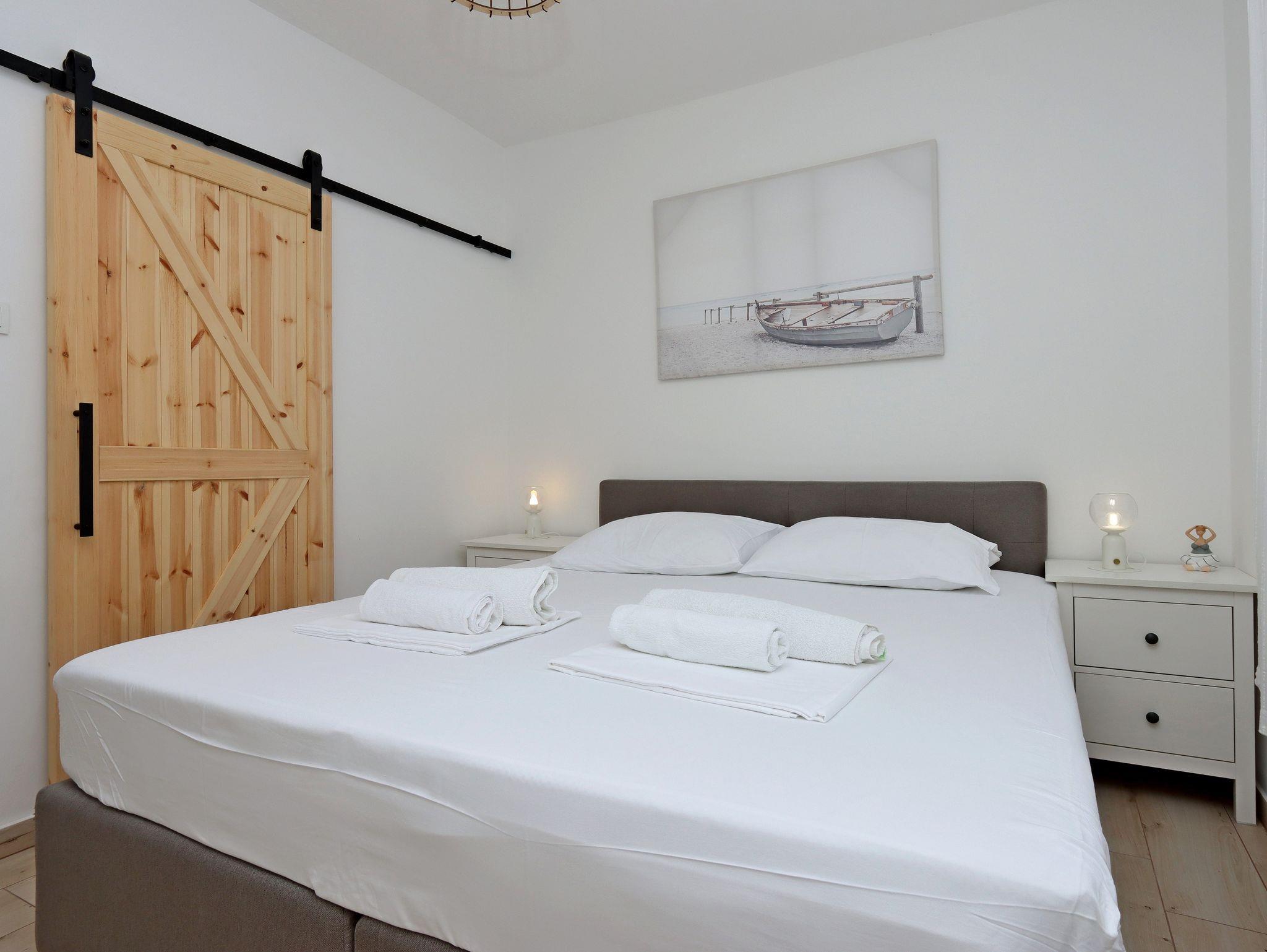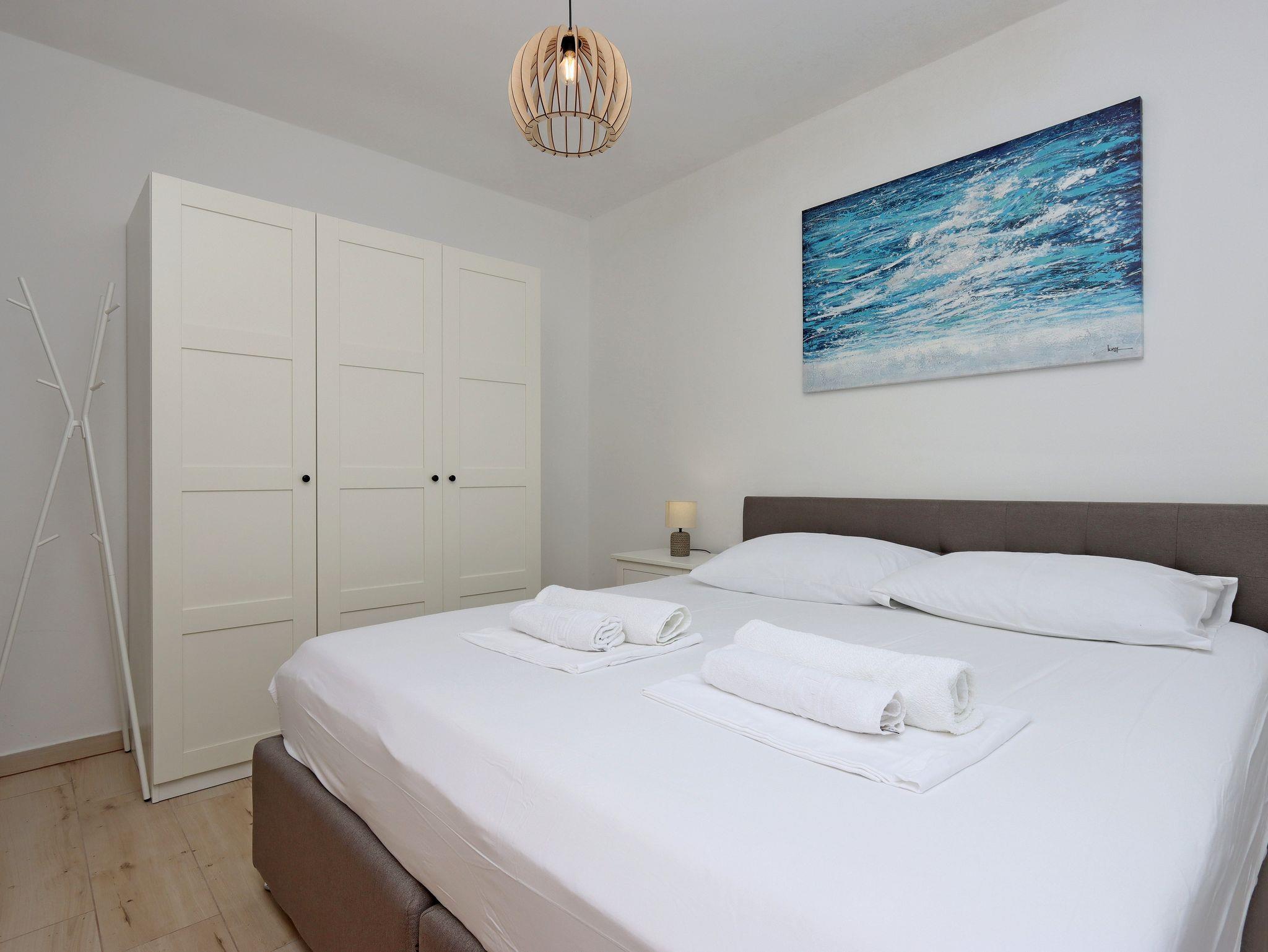 Ferienwohnung bietet Platz für 4 Gäste. Die Betten sind in Schlafzimmern, die es 2 gibt, innerhalb einer Gesamtfläche von 63m2, angeordnet. Die Gäste haben eine eigene Terrasse zur Verfügung, auf der sie in warmen Sommernächten genießen können. Es ist erlaubt, Speisen auf dem Gemeinschafts-Grill vorzubereiten. IM PREIS INBEGRIFFEN: Kurtaxe, Endreinigung, Klimatisierung, Parkplatz, Internet, Wäschewaschen, Bootsanlegeplatz, Kinderbett, Föhn. VERBINDLICHE ZUSÄTZLICHE KOSTEN: Aufzahlung für Kurzaufenthalte (prozentualer Zuschlag pro Nächtigungsanzahl: 30% - 1, 20% - 2, 10% - 3). UNVERBINDLICHE ZUSÄTZLICHE KOSTEN: 1 Bett für Kinder (10,00 € Person/Tag). Die Verfügbarkeit zusätzlicher Dienstleistungen in Ihrem reservierten Termin und die Preise derselben (falls nicht aufgeführt) müssen im Voraus überprüft werden. Zusätzliche Dienstleistungen die in der Zahlungsaufforderung nicht aufgeführt sind werden direkt beim Vermieter bezahlt, angenommen der Gast nutzt auch diese.