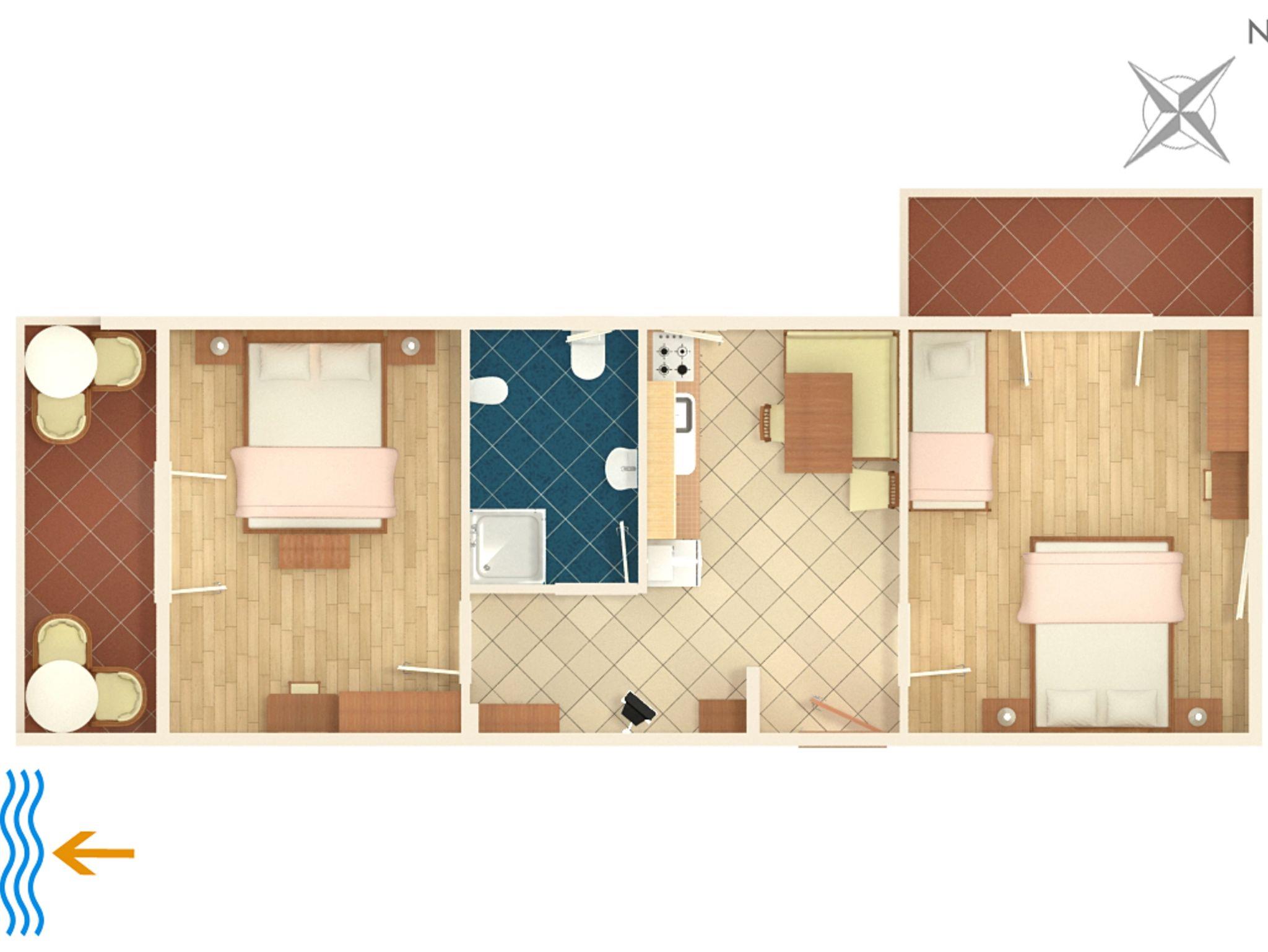Ferienwohnung bietet Platz für 4 Gäste. Die Betten sind in Schlafzimmern, die es 2 gibt, innerhalb einer Gesamtfläche von 51m2, angeordnet. Die Gäste haben einen eigenen Balkon zur Verfügung, auf der sie in warmen Sommernächten genießen können. Es ist erlaubt, Speisen auf dem Gemeinschafts-Grill vorzubereiten. In der Unterkunftseinheit besteht die Möglichkeit des Mitbringens von Haustieren gegen Aufpreis. IM PREIS INBEGRIFFEN: Kurtaxe, Endreinigung, Klimatisierung, Zentralheizung, Parkplatz, Internet, Kinderbett, Bügeleisen, Bügelbrett, Föhn. VERBINDLICHE ZUSÄTZLICHE KOSTEN: Aufzahlung für Kurzaufenthalte (prozentualer Zuschlag pro Nächtigungsanzahl: 30% - 1, 20% - 2, 10% - 3). UNVERBINDLICHE ZUSÄTZLICHE KOSTEN: Bootsanlegeplatz (10,00 € pro Nacht), Haustiere (10,00 € pro Nacht), Zusatzbett (10,00 € pro Nacht). Die Verfügbarkeit zusätzlicher Dienstleistungen in Ihrem reservierten Termin und die Preise derselben (falls nicht aufgeführt) müssen im Voraus überprüft werden. Zusätzliche Dienstleistungen die in der Zahlungsaufforderung nicht aufgeführt sind werden direkt beim Vermieter bezahlt, angenommen der Gast nutzt auch diese.