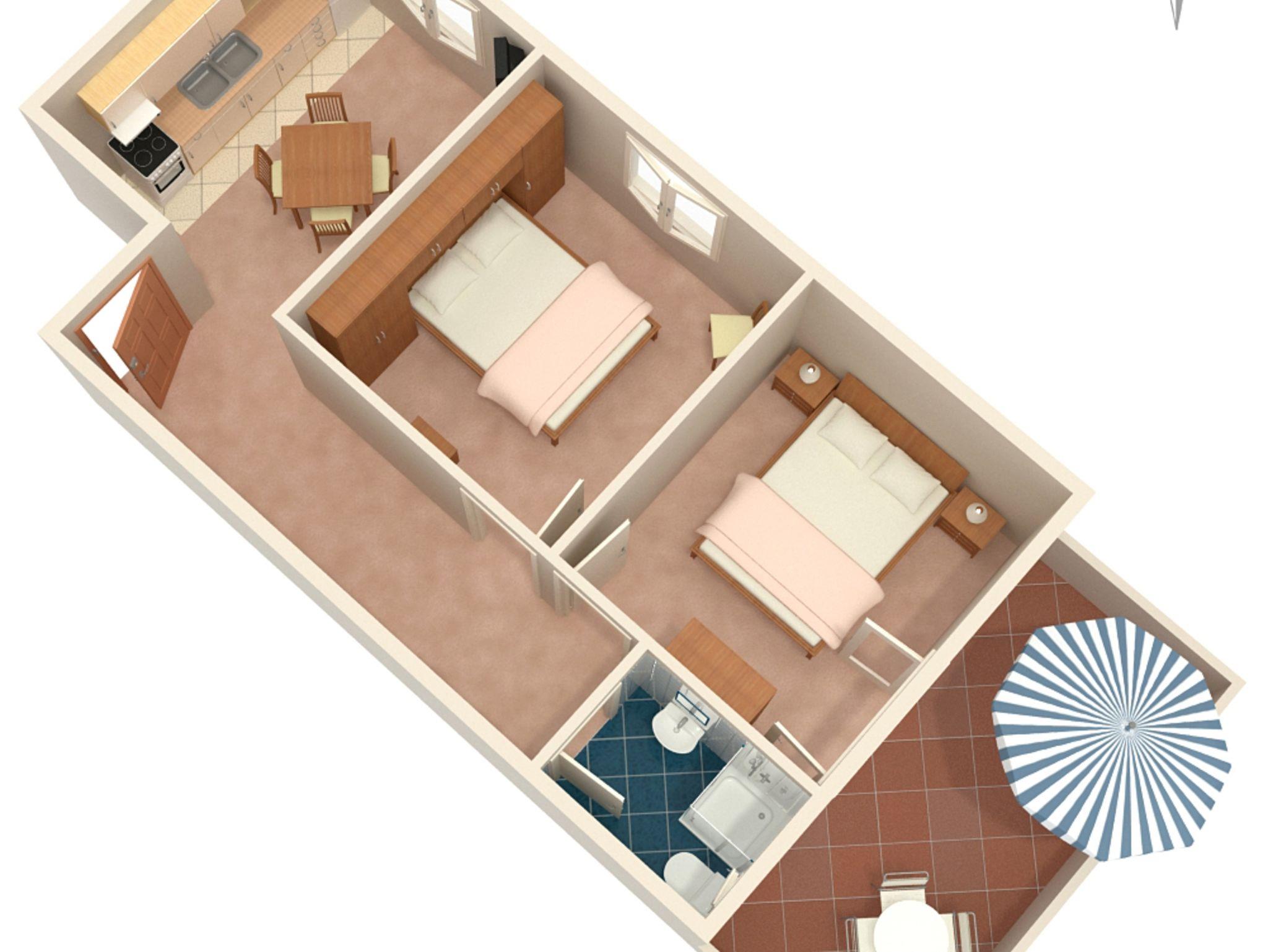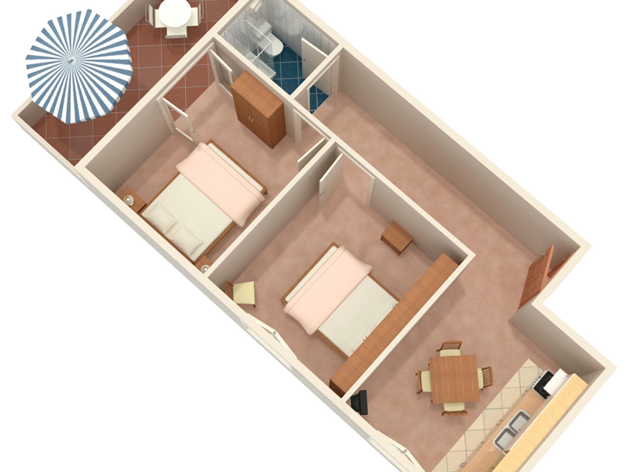 Ferienwohnung bietet Platz für 4 Gäste. Die Betten sind in Schlafzimmern, die es 2 gibt, innerhalb einer Gesamtfläche von 41m2, angeordnet. Die Gäste haben eine eigene Terrasse zur Verfügung, auf der sie in warmen Sommernächten genießen können. Das Apartment bietet Meerblick. Es ist erlaubt, Speisen auf dem Gemeinschafts-Grill vorzubereiten. In der Unterkunftseinheit besteht die Möglichkeit des Mitbringens von Haustieren gegen Aufpreis. IM PREIS INBEGRIFFEN: Kurtaxe, Endreinigung, Klimatisierung, Parkplatz, Internet. VERBINDLICHE ZUSÄTZLICHE KOSTEN: Aufzahlung für Kurzaufenthalte (prozentualer Zuschlag pro Nächtigungsanzahl: 30% - 1, 20% - 2, 10% - 3). UNVERBINDLICHE ZUSÄTZLICHE KOSTEN: Haustiere (5,00 € pro Nacht). Die Verfügbarkeit zusätzlicher Dienstleistungen in Ihrem reservierten Termin und die Preise derselben (falls nicht aufgeführt) müssen im Voraus überprüft werden. Zusätzliche Dienstleistungen die in der Zahlungsaufforderung nicht aufgeführt sind werden direkt beim Vermieter bezahlt, angenommen der Gast nutzt auch diese. Ermäßigung auf den Grundpreis: Gratistag 14=13 (bei einem Aufenthalt von 14 Tagen oder mehr erhalten Sie einen Gratistag für den Aufenthalt bis 31.12.26).